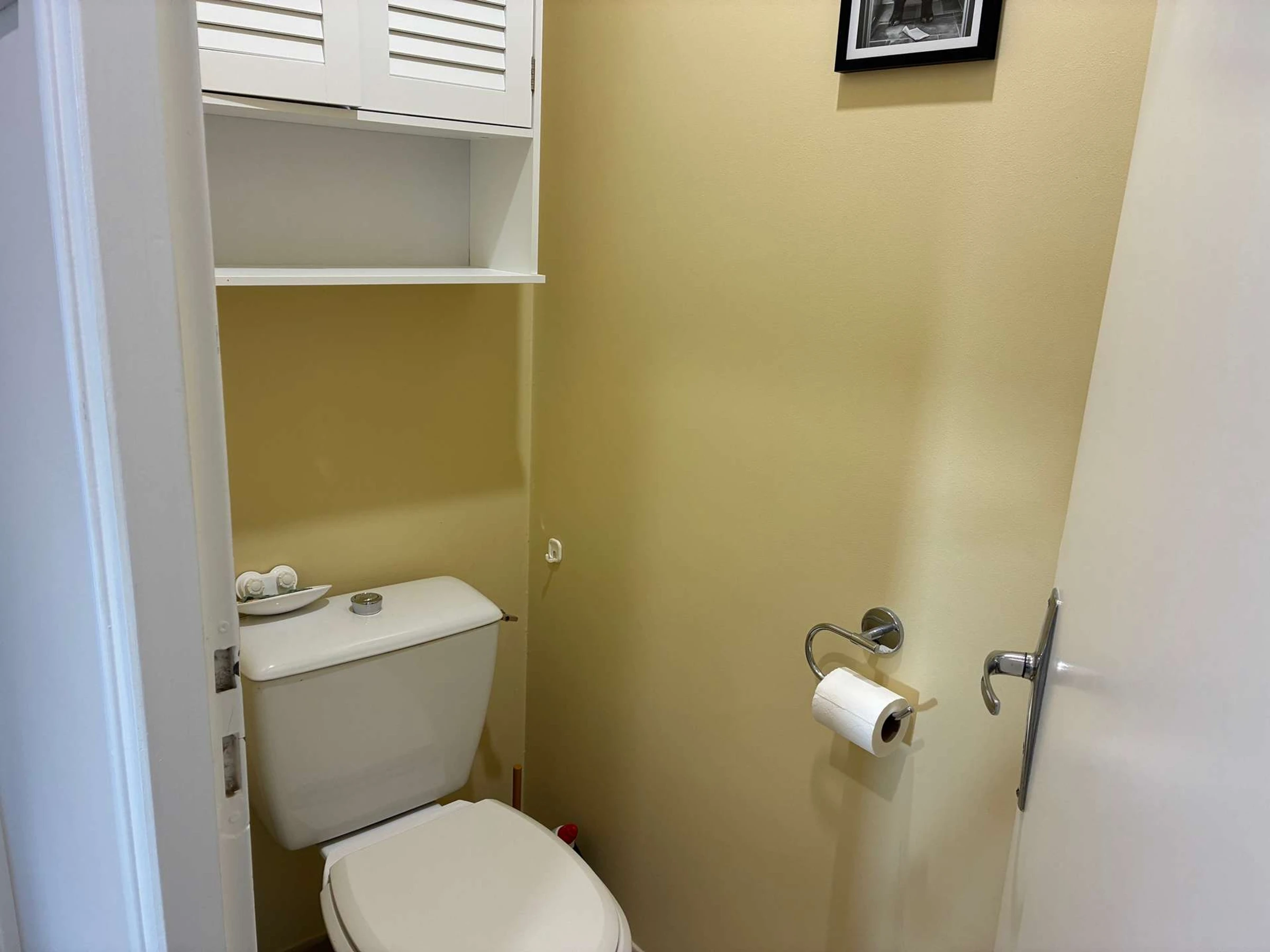 Separates WC, ein Schlafzimmer mit Stauraum und einem Queensize-Bett (160 cm) sowie ein weiteres Schlafzimmer mit Stauraum und einem Doppelbett (140 cm).