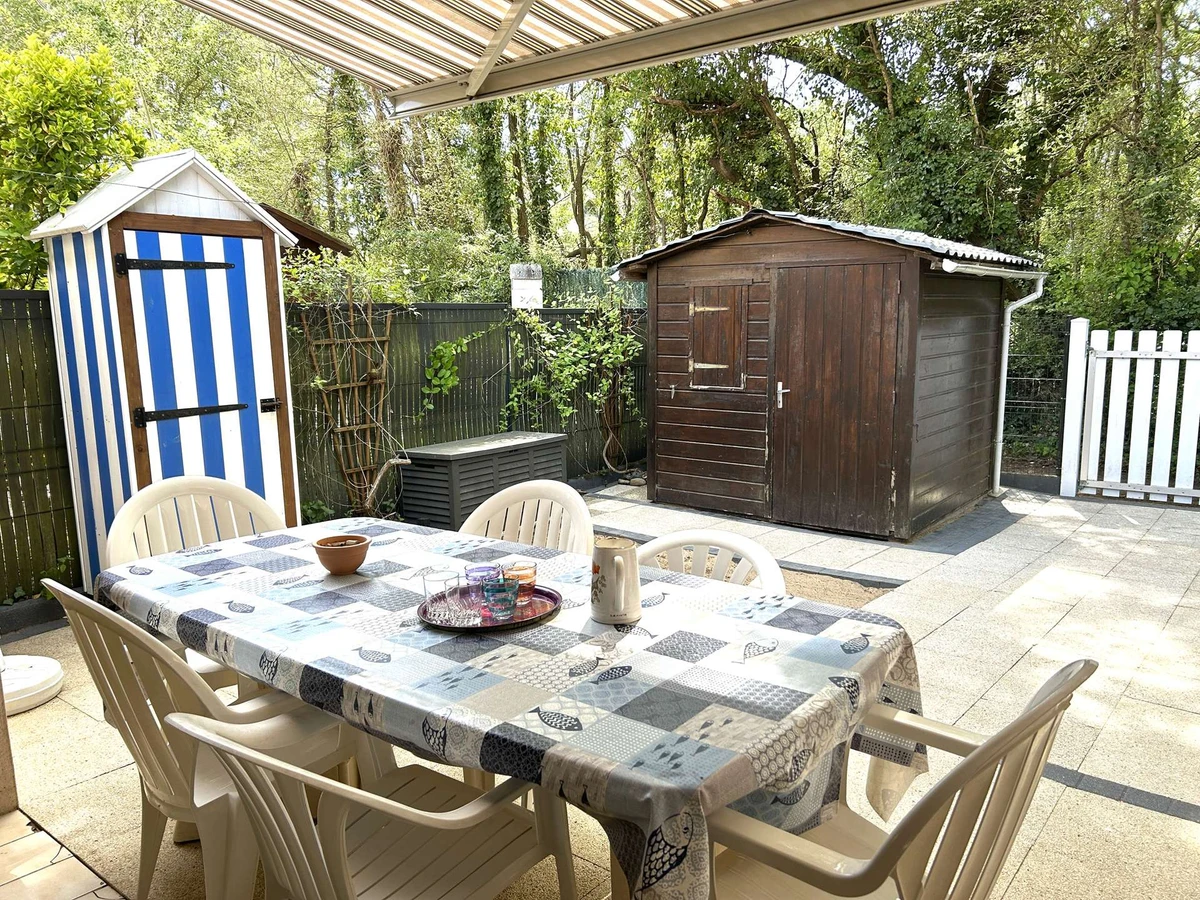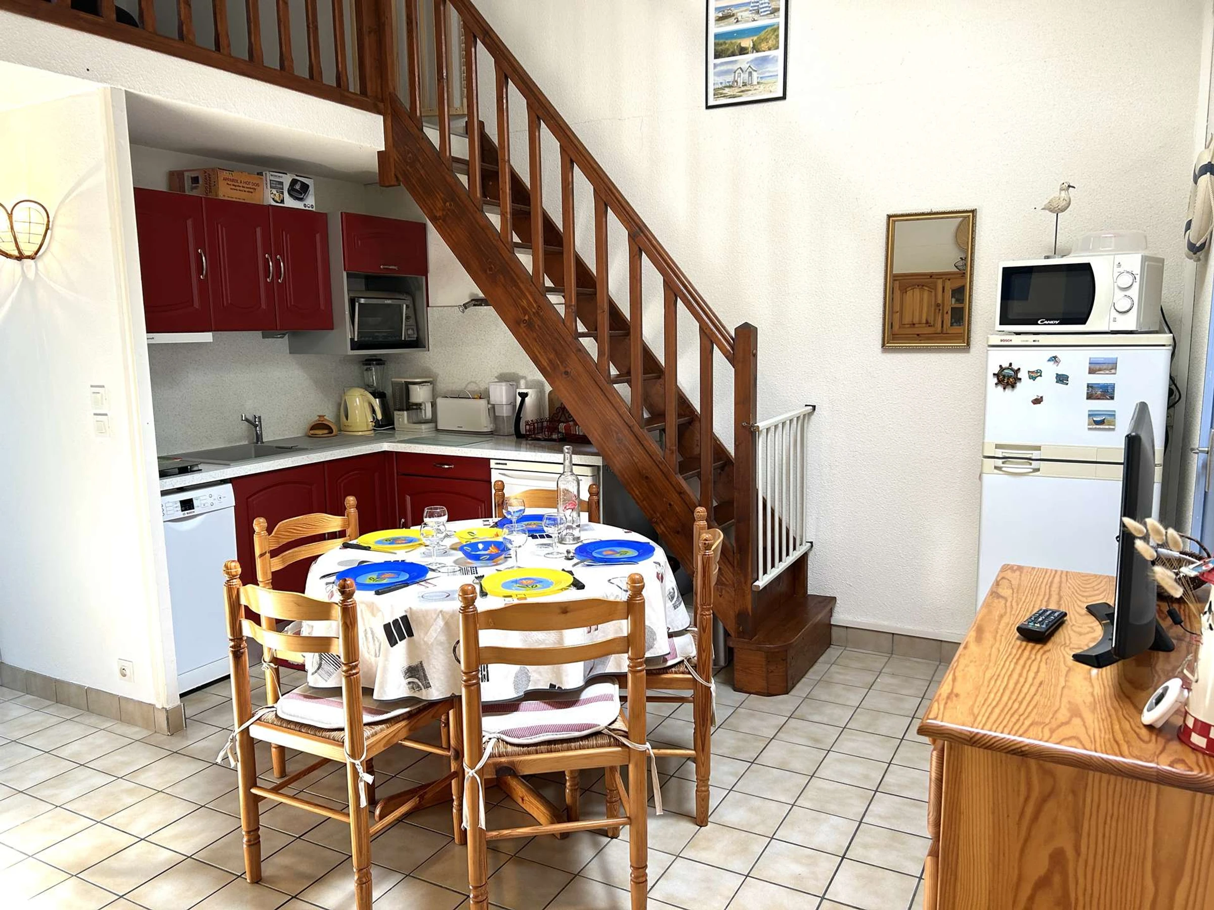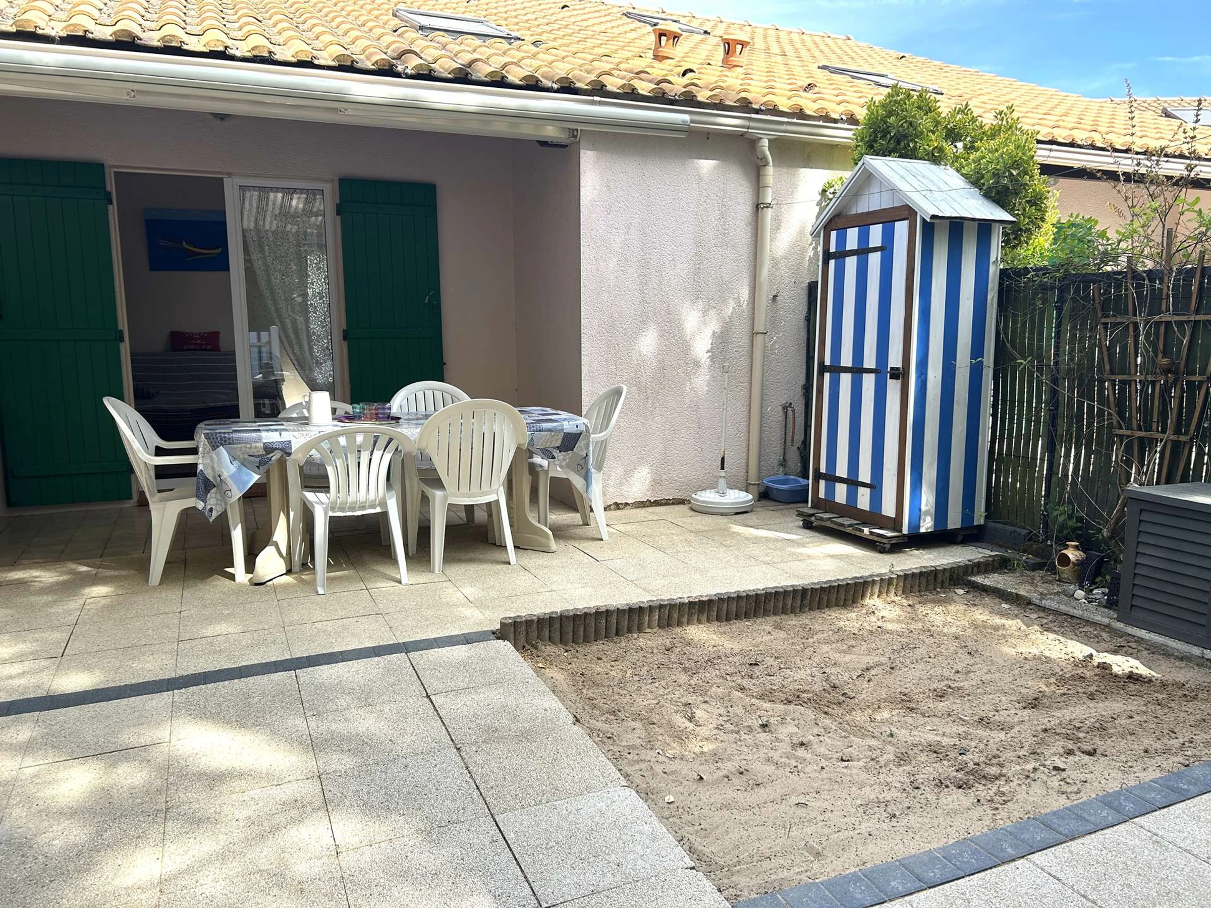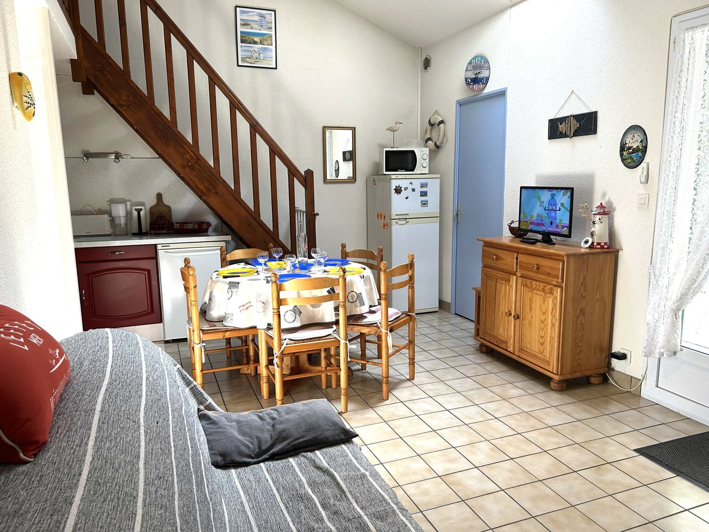 Dieses gemütliche Ferienhaus in der Wohnanlage Les Océanides, nur wenige Schritte vom Strand entfernt, bietet einen Eingangsbereich, eine Küchenzeile mit Kühl-/Gefrierschrank, Mikrowelle und Geschirrspüler, ein Wohnzimmer mit Fernseher, ein Schlafzimmer mit Doppelbett und Stauraum, ein Duschbad, ein WC und einen Hauswirtschaftsraum mit Waschmaschine. Im Obergeschoss befinden sich eine Galerie mit Schlafcouch und ein weiteres Schlafzimmer mit Doppelbett.