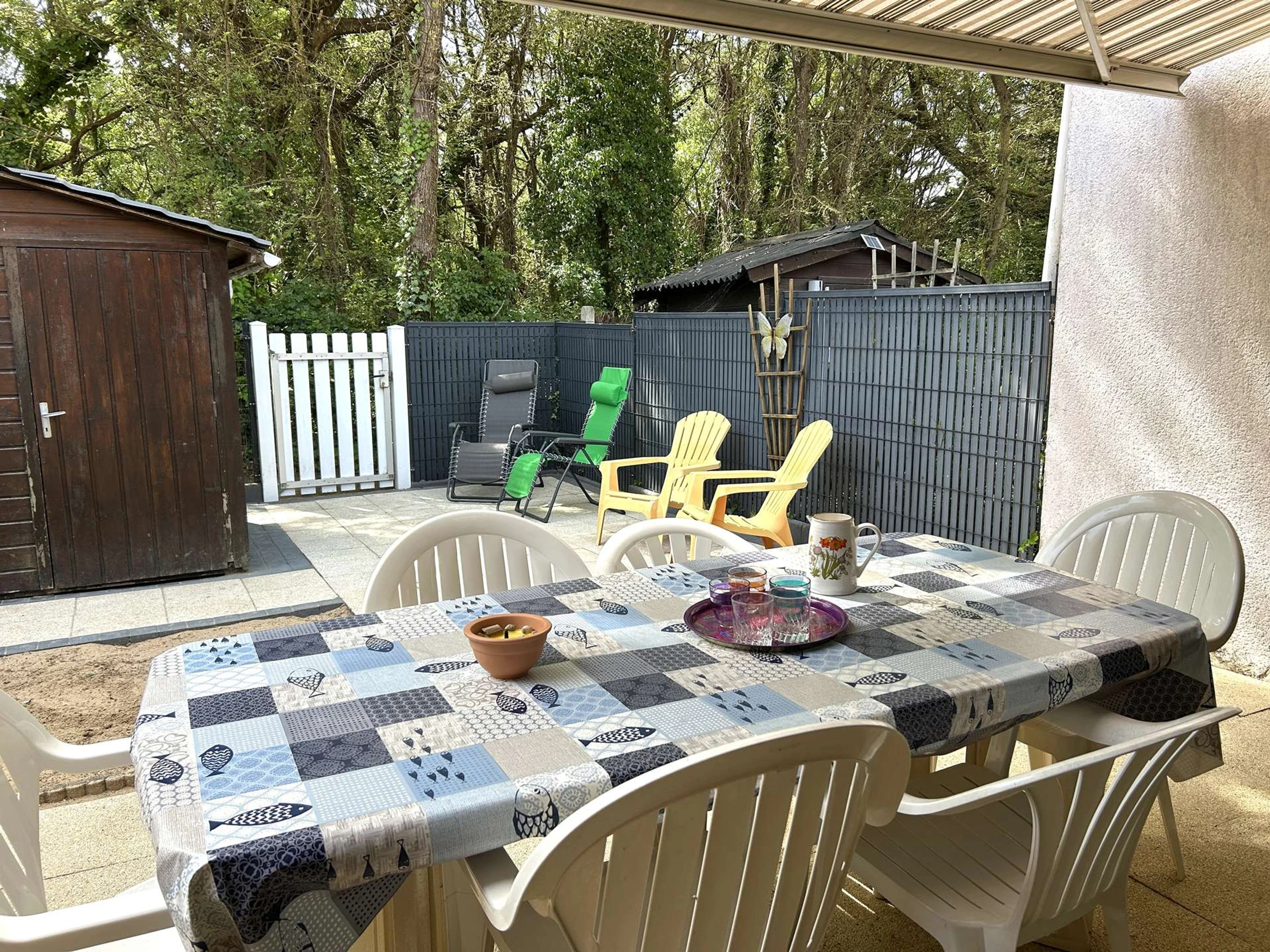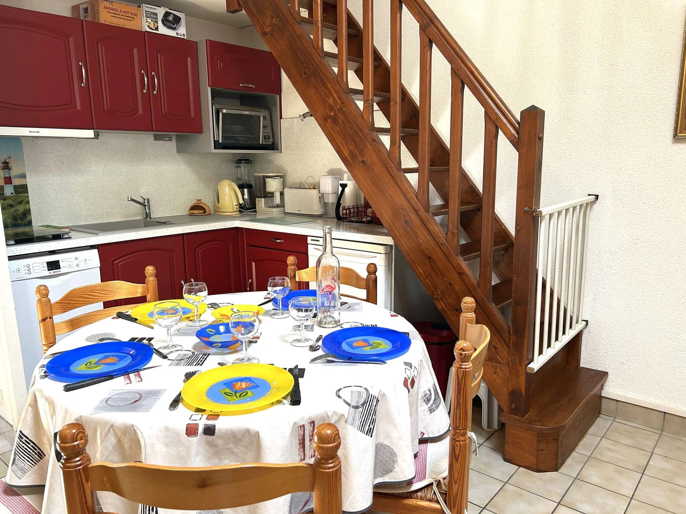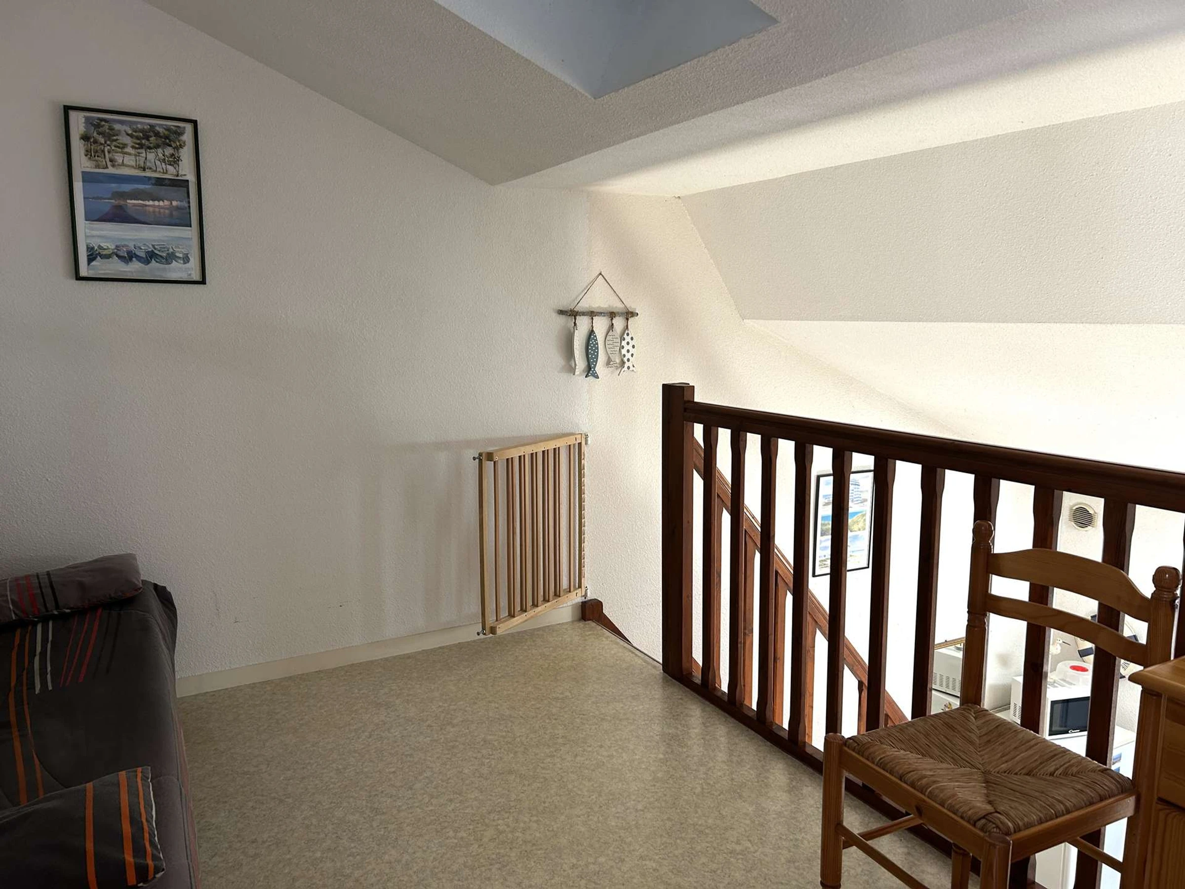 Dieses gemütliche Ferienhaus in der Wohnanlage Les Océanides, nur wenige Schritte vom Strand entfernt, bietet einen Eingangsbereich, eine Küchenzeile mit Kühl-/Gefrierschrank, Mikrowelle und Geschirrspüler, ein Wohnzimmer mit Fernseher, ein Schlafzimmer mit Doppelbett und Stauraum, ein Duschbad, ein WC und einen Hauswirtschaftsraum mit Waschmaschine. Im Obergeschoss befinden sich eine Galerie mit Schlafcouch und ein weiteres Schlafzimmer mit Doppelbett.