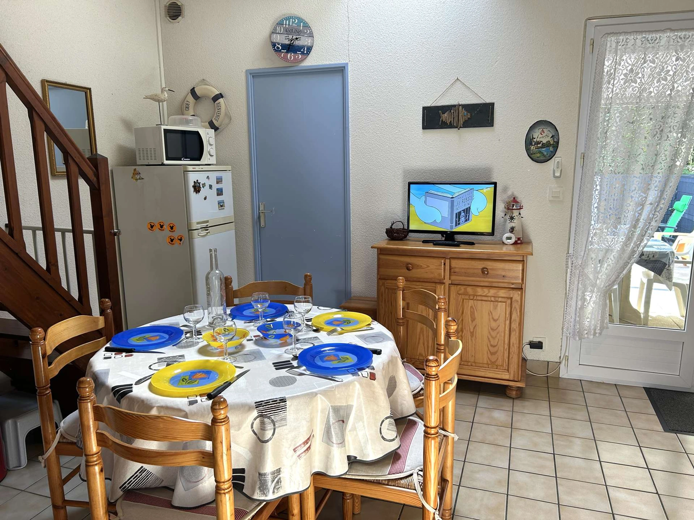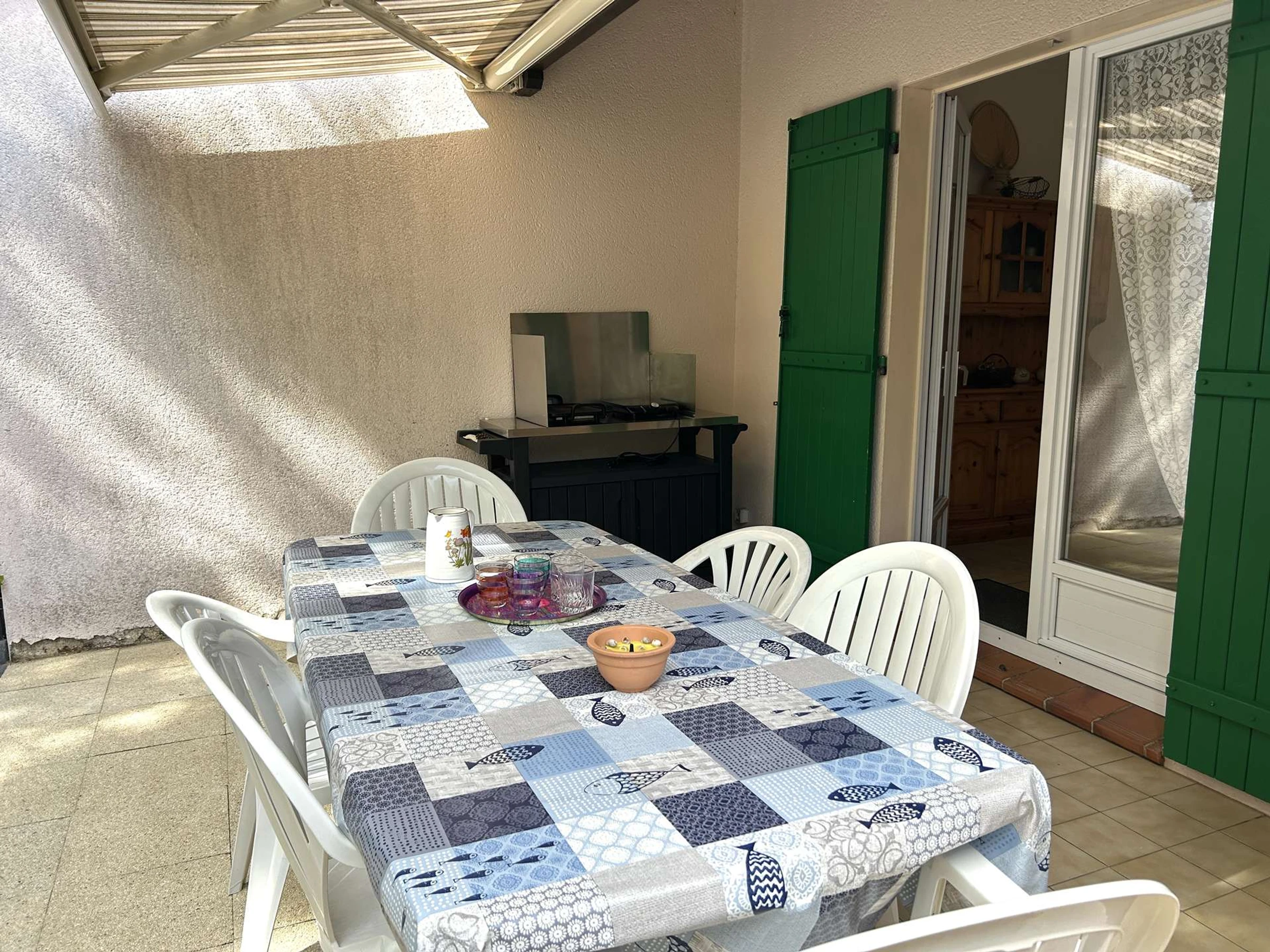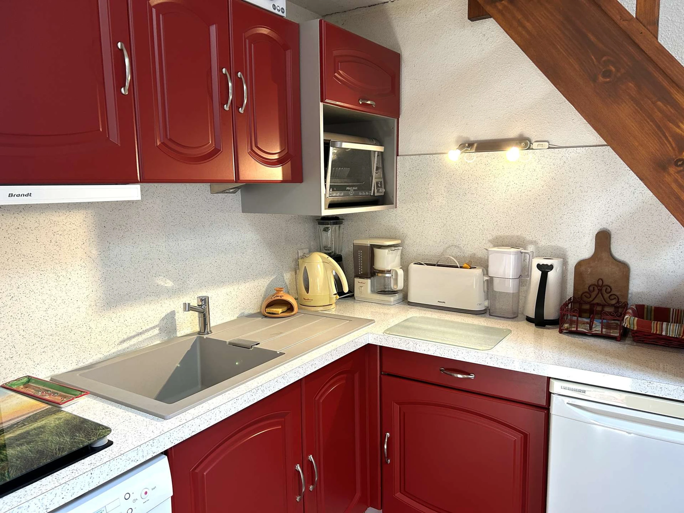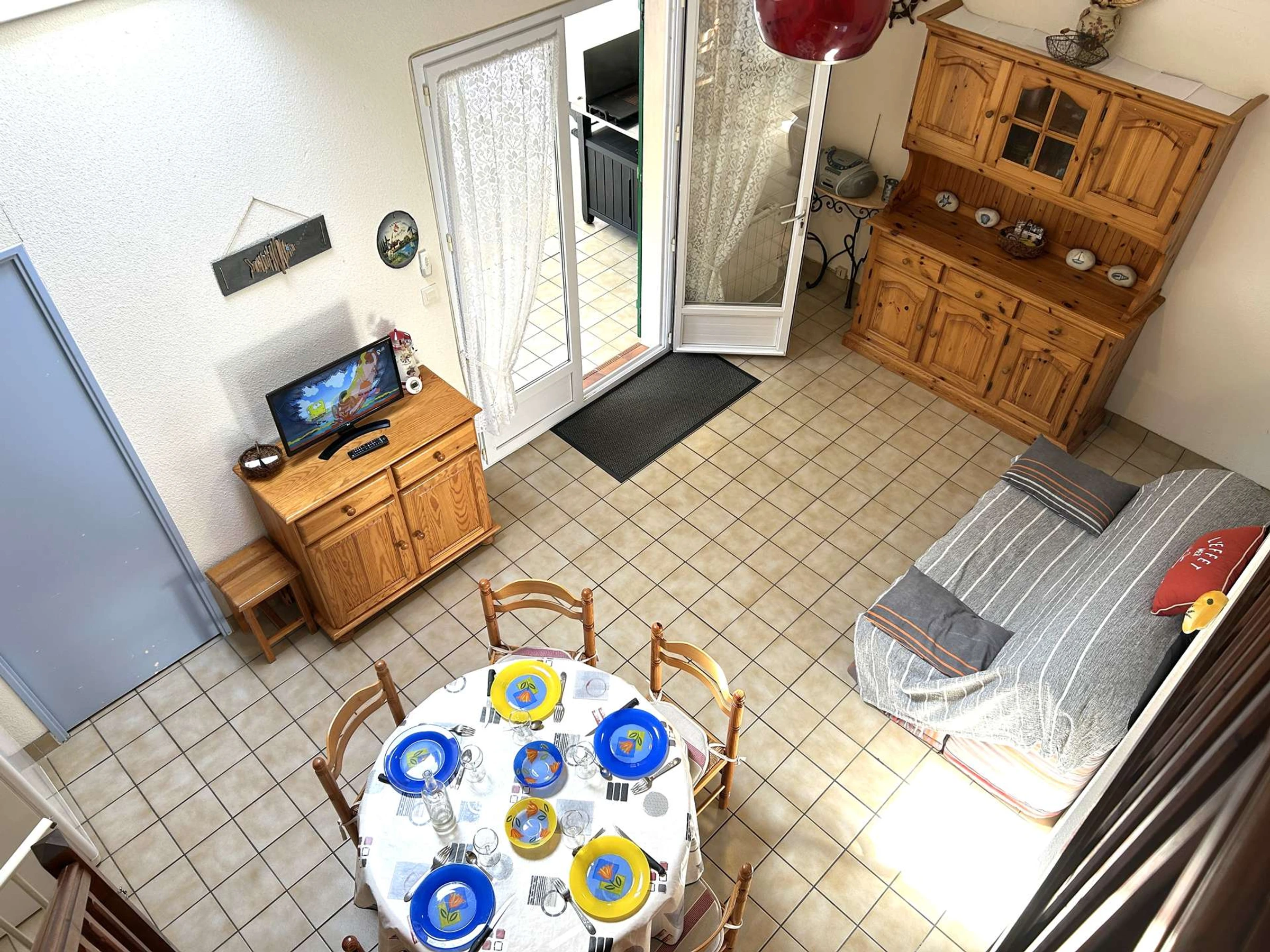 Dieses gemütliche Ferienhaus in der Wohnanlage Les Océanides, nur wenige Schritte vom Strand entfernt, bietet einen Eingangsbereich, eine Küchenzeile mit Kühl-/Gefrierschrank, Mikrowelle und Geschirrspüler, ein Wohnzimmer mit Fernseher, ein Schlafzimmer mit Doppelbett und Stauraum, ein Duschbad, ein WC und einen Hauswirtschaftsraum mit Waschmaschine. Im Obergeschoss befinden sich eine Galerie mit Schlafcouch und ein weiteres Schlafzimmer mit Doppelbett.