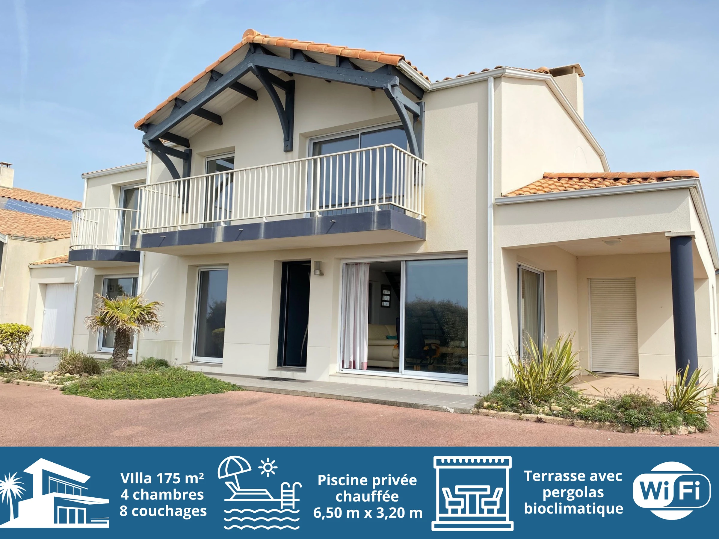 Diese geräumige Villa (175 m², für 8 Personen) liegt 800 m vom Strand La Sauzaie entfernt und bietet Meerblick. Sie verfügt über einen privaten, beheizten Pool (geöffnet von Juni bis September). Sie ist in zwei Bereiche mit interner Verbindung unterteilt.