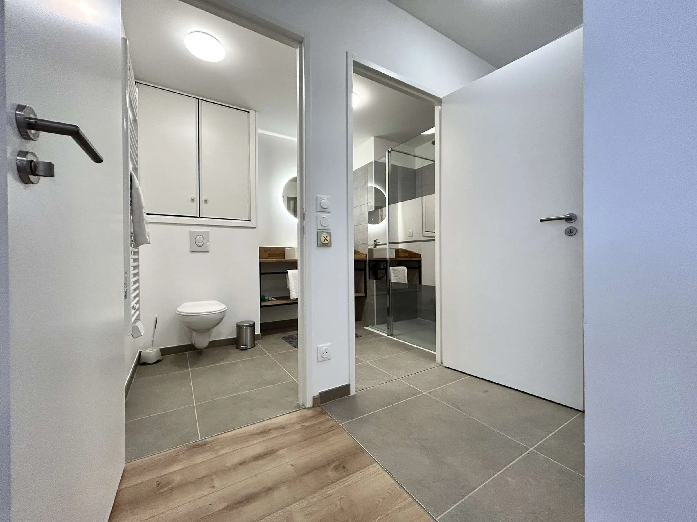 - ein Badezimmer mit Dusche und WC