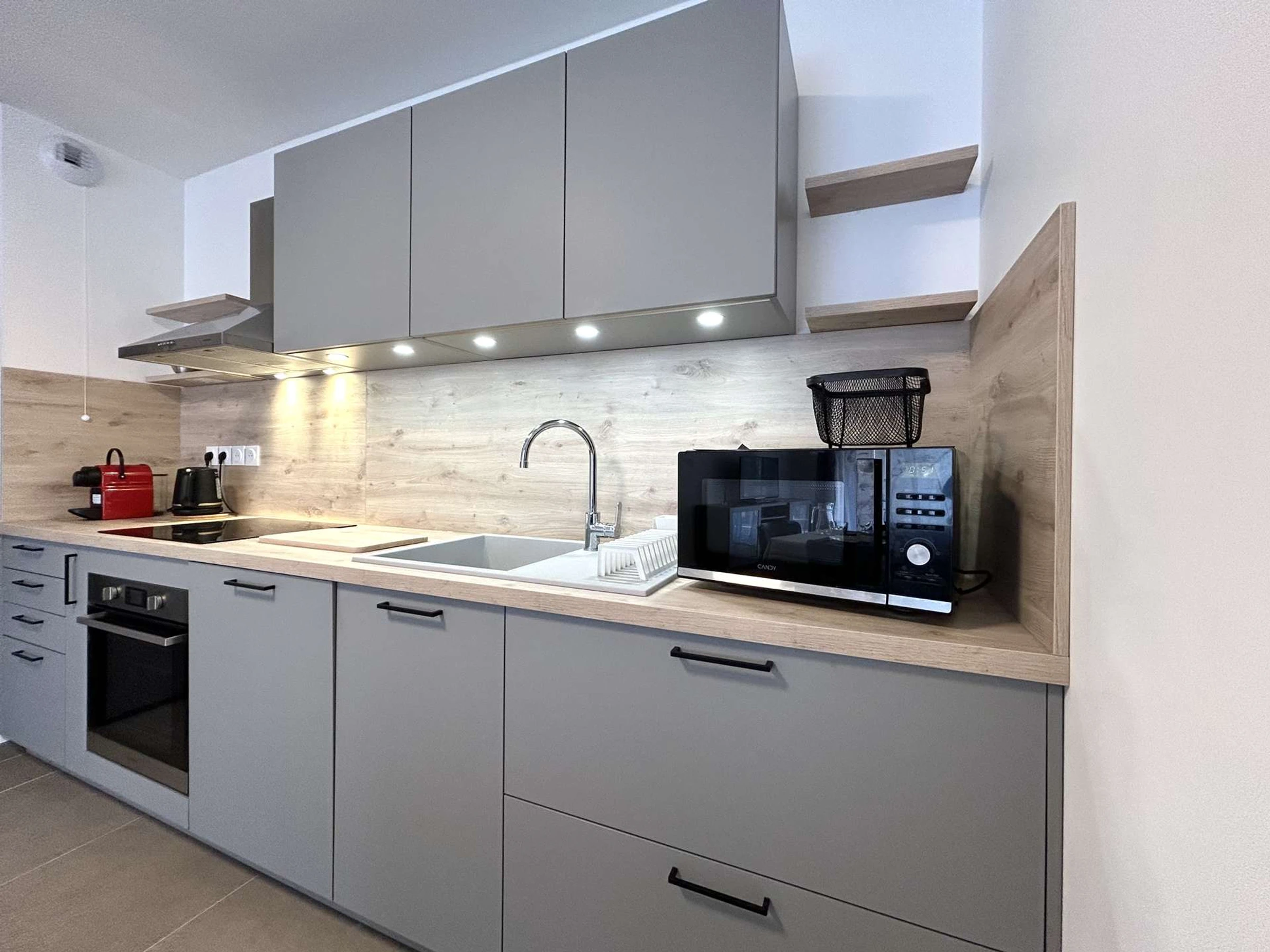 - eine Küchenzeile mit Mikrowelle, elektrischer Kaffeemaschine, Geschirrspüler usw.