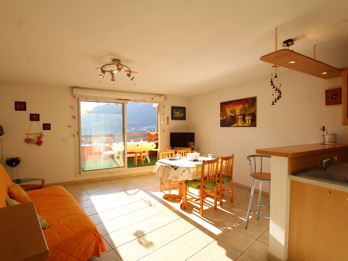 Es hat eine zum Wohnzimmer offene Küche, gut ausgestattet (Backofen, Kühlschrank, Mikrowelle, Cerankochfeld, Dunstabzugshaube, Wasserkocher...), ein Wohnzimmer mit Zugang zur Terrasse.