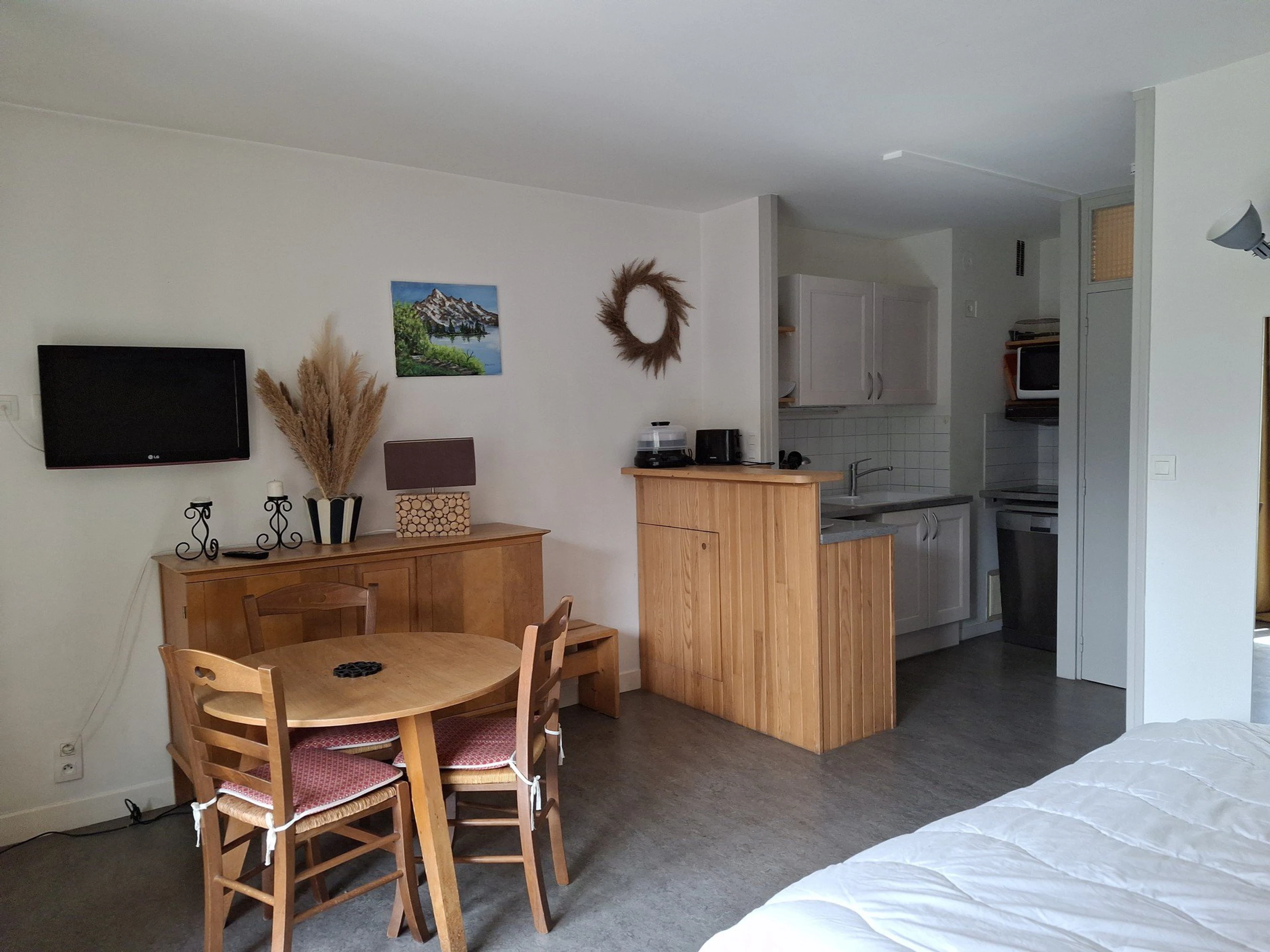 26 m² großes Studio-Apartment mit Schlafbereich für 2 Personen im dritten Stock des Hauses mit Aufzug. Ostbalkon mit Bergblick.