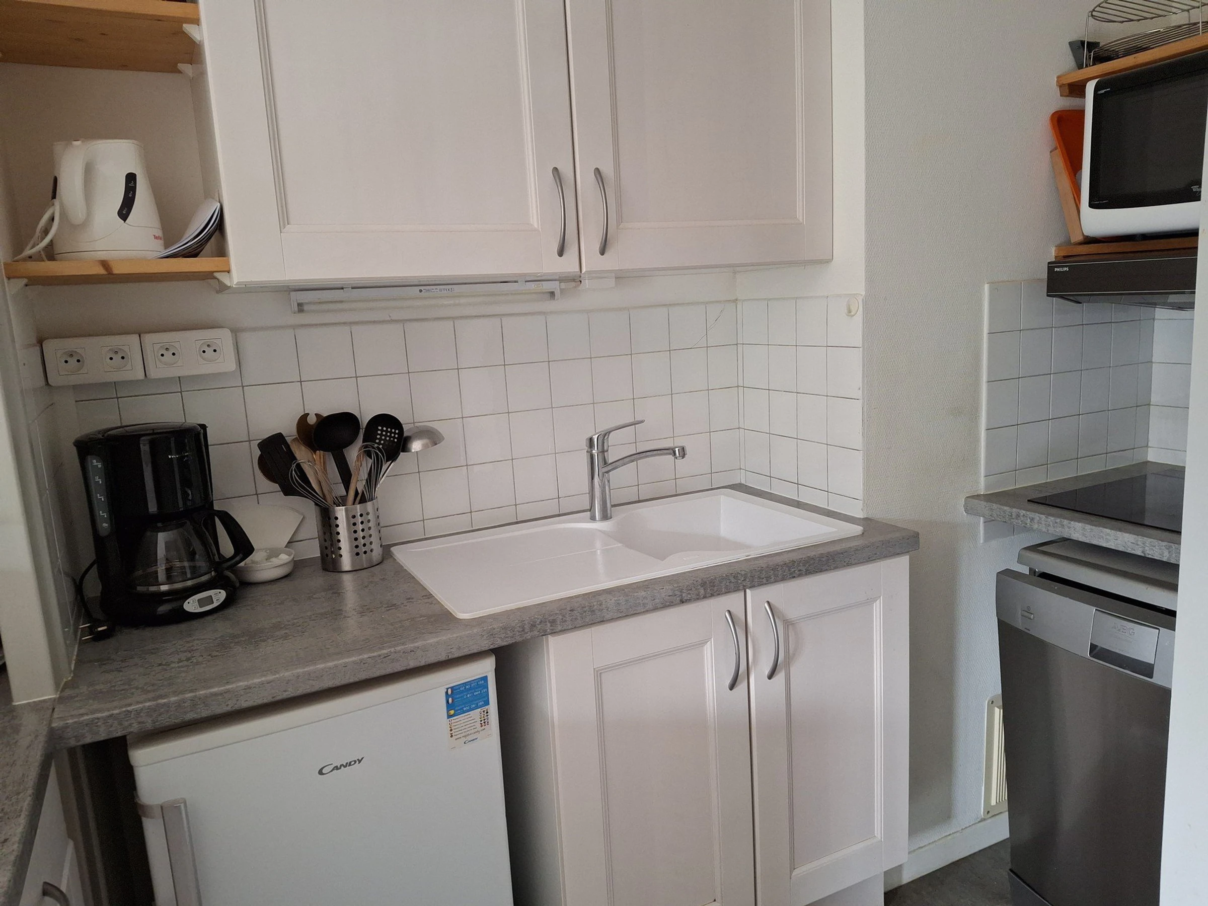 Küchenbereich mit Cerankochfeld, Backofen, Kühlschrank und Kaffeemaschine.