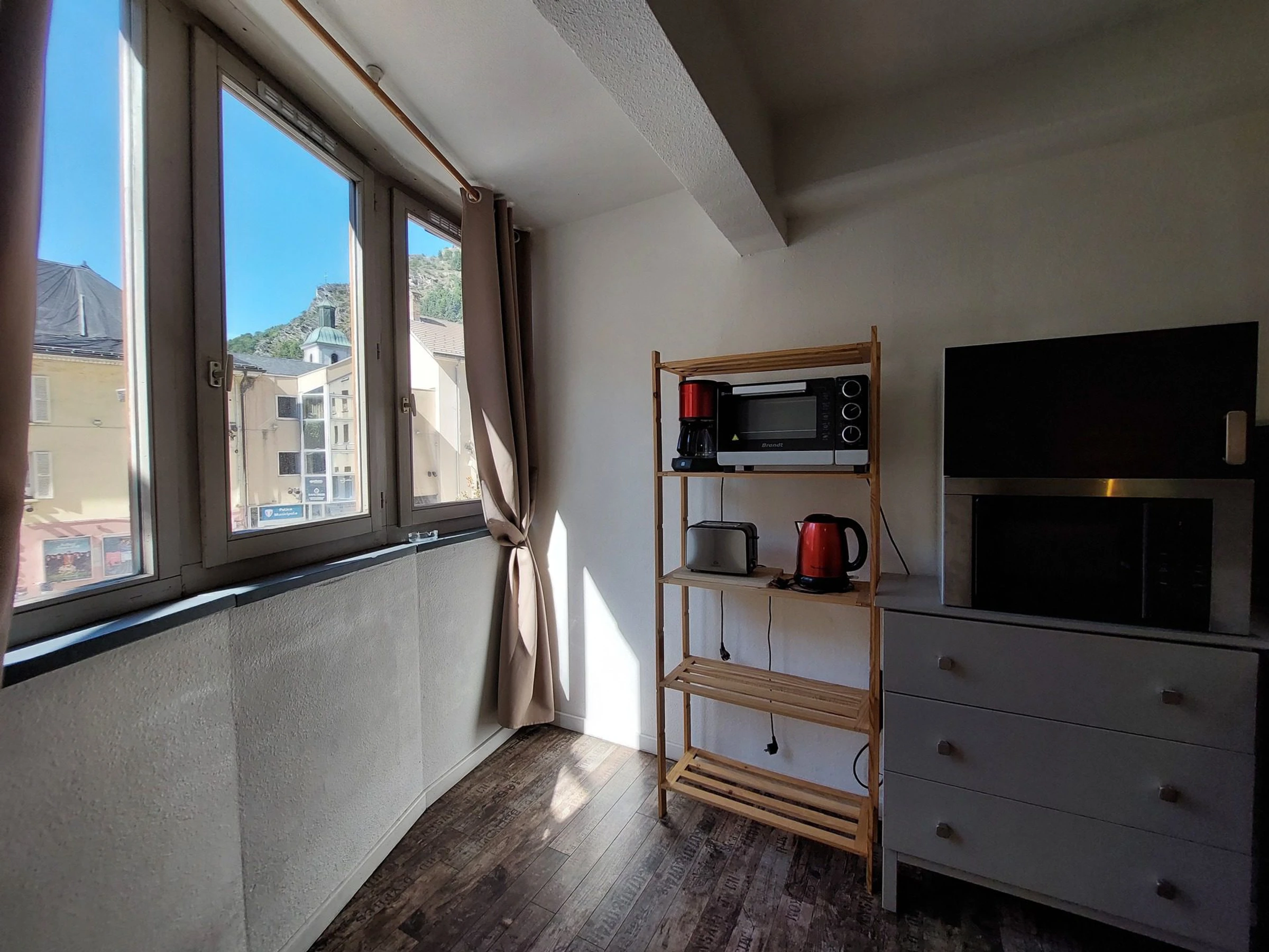 Apartment Typ T2, 38 m², für maximal 6 Personen, im 1. Stock mit Aufzug, Westlage. Blick auf die Straße, den Rathausplatz und die Touristinformation.