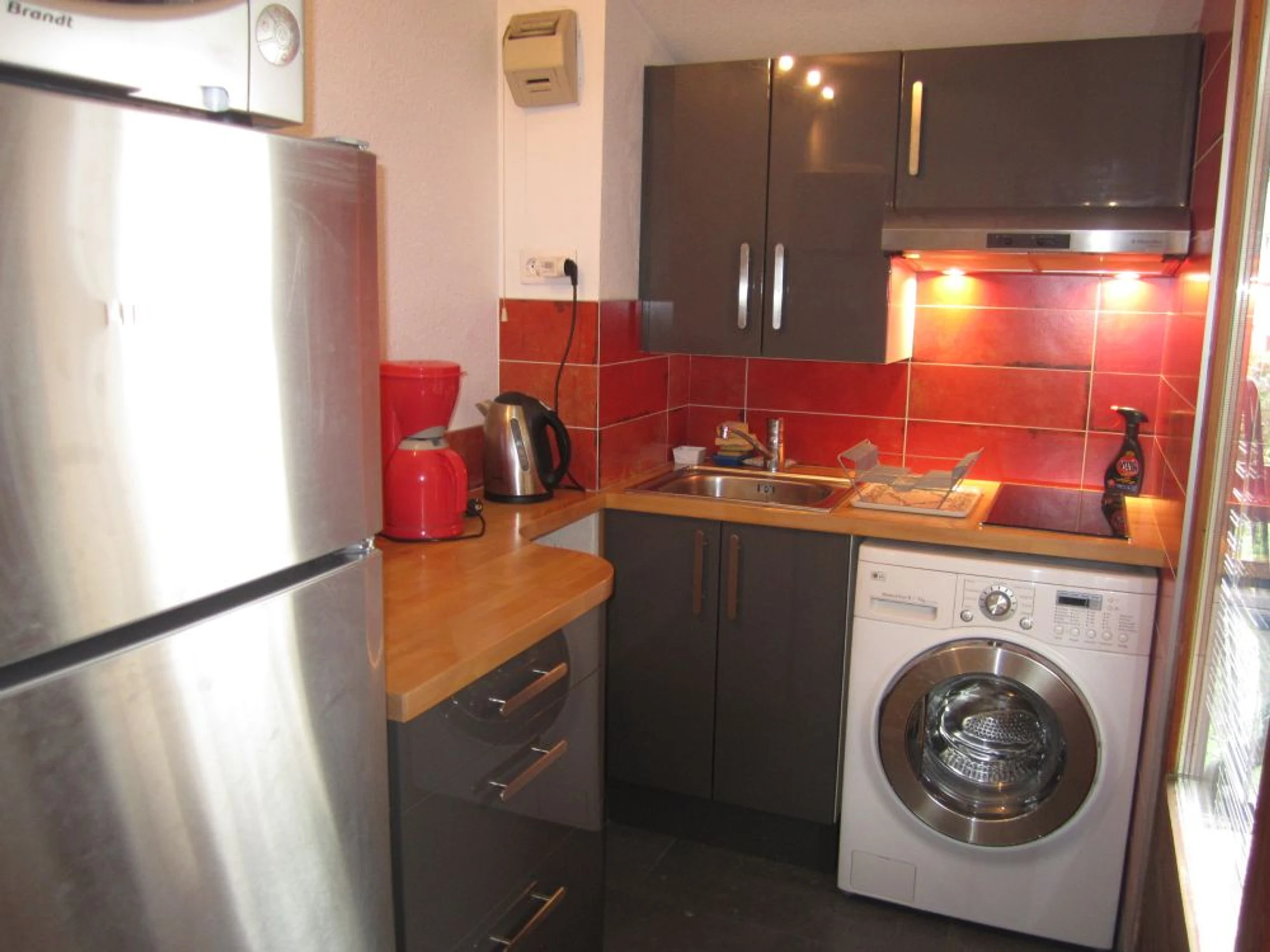 Küchenbereich: Cerankochfeld, Dunstabzugshaube, Mikrowelle, Kühl- und Gefrierschrank, Waschmaschine und alle notwendigen Küchengeräte.
