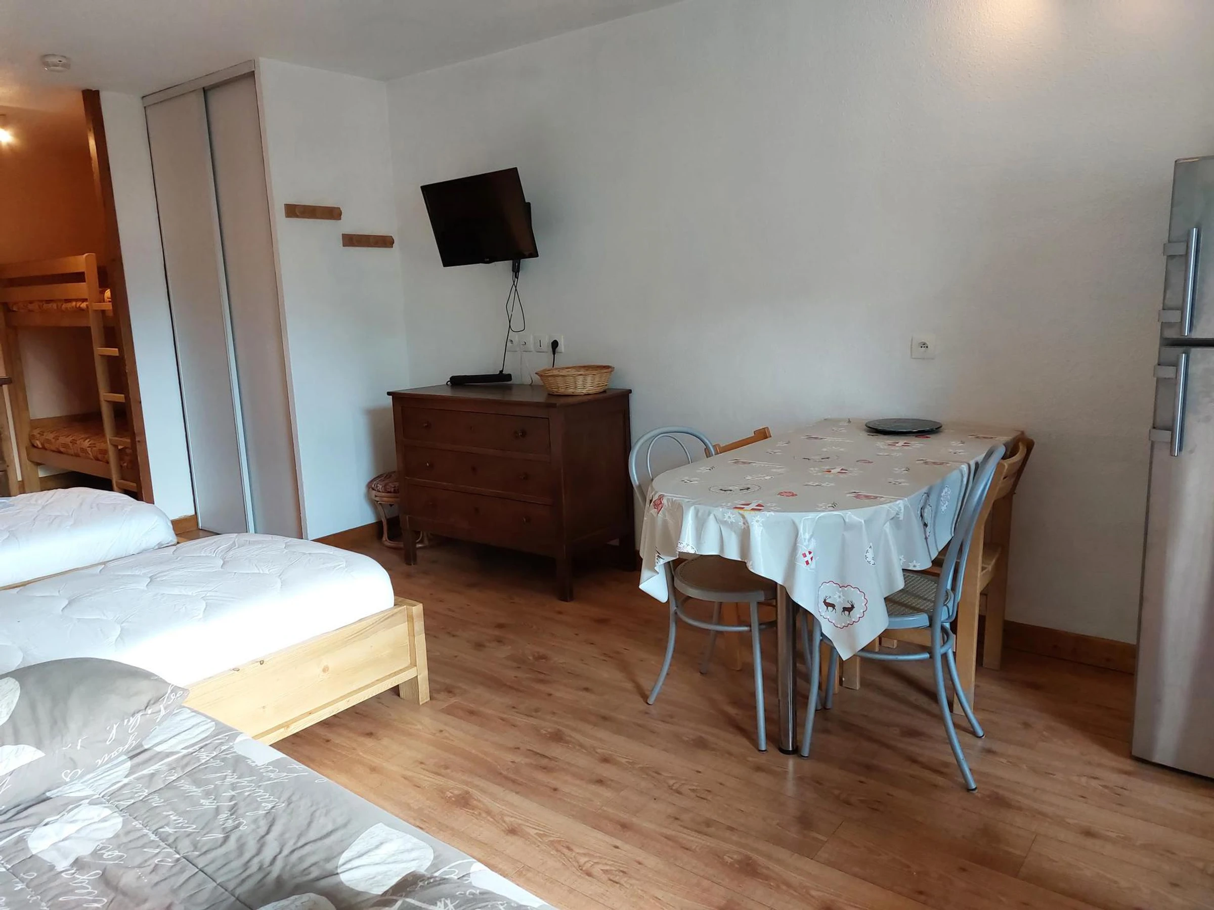 Wohnbereich mit Esstisch, 2 Einzelbetten, Stauraum und Flachbildfernseher.