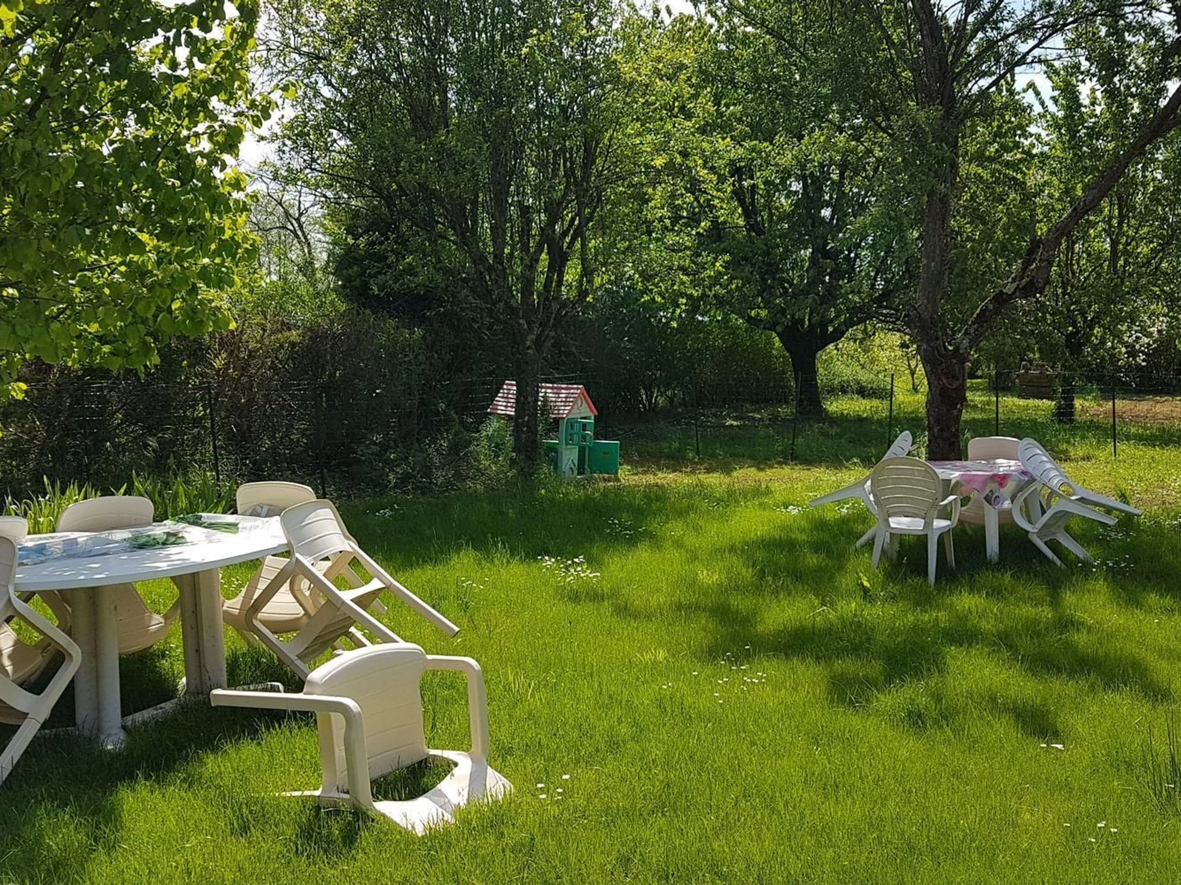 Gas-/Holzheizung. Kleiner Garten mit Rasen und überdachter Terrasse vor dem Haus und geschlossener Innenhof mit Rasen und Spielen, bepflanzt mit Markise hinter dem Haus.