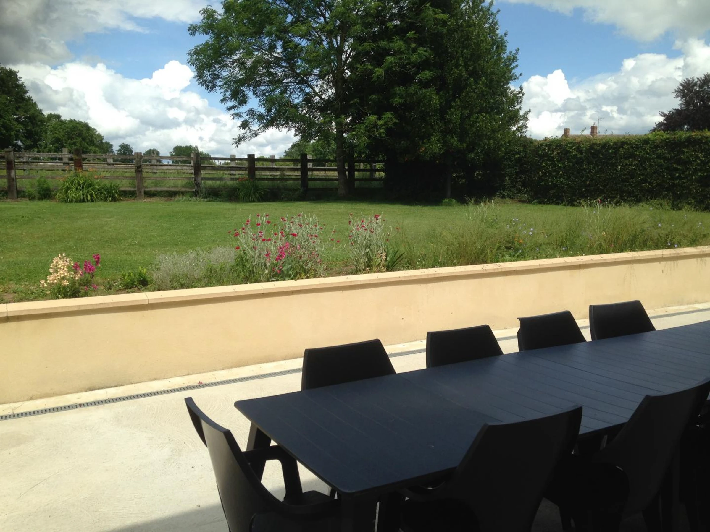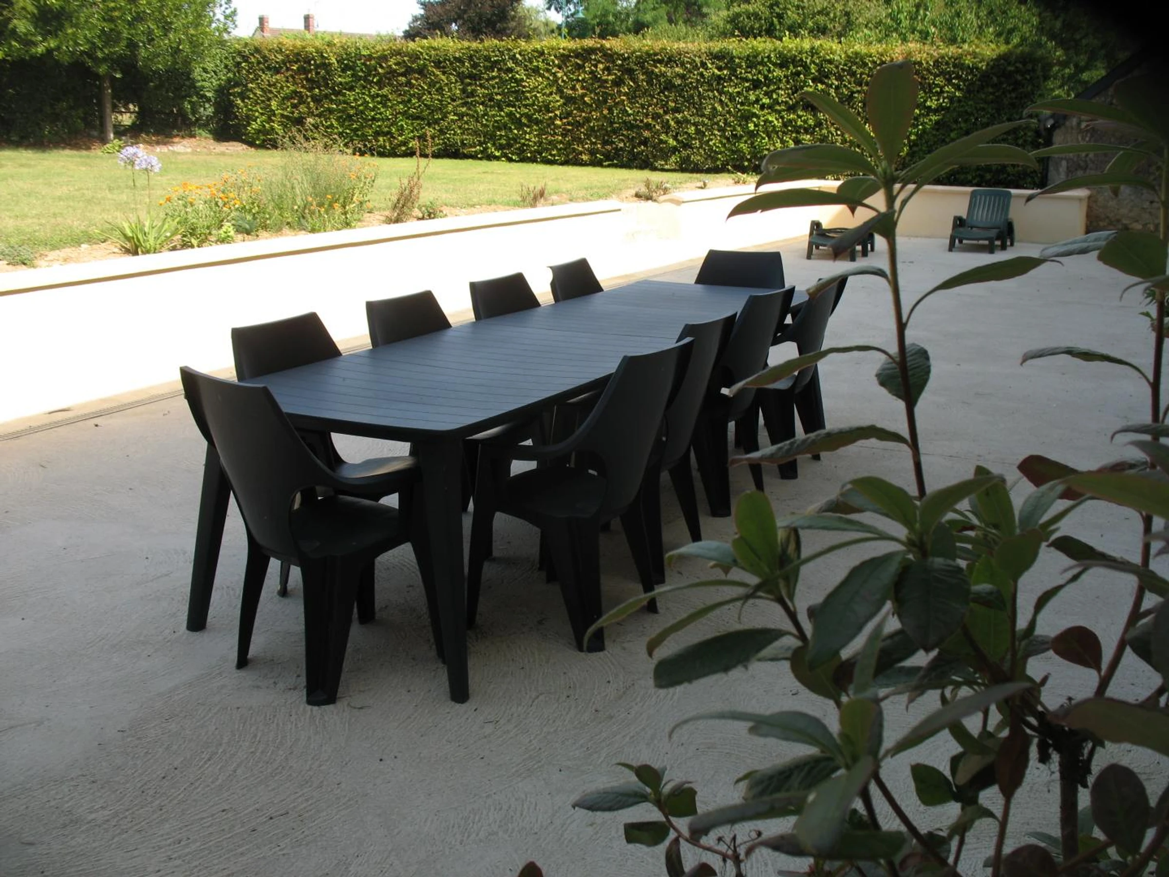 400 m² großer Garten mit Terrasse und Liegestühlen.