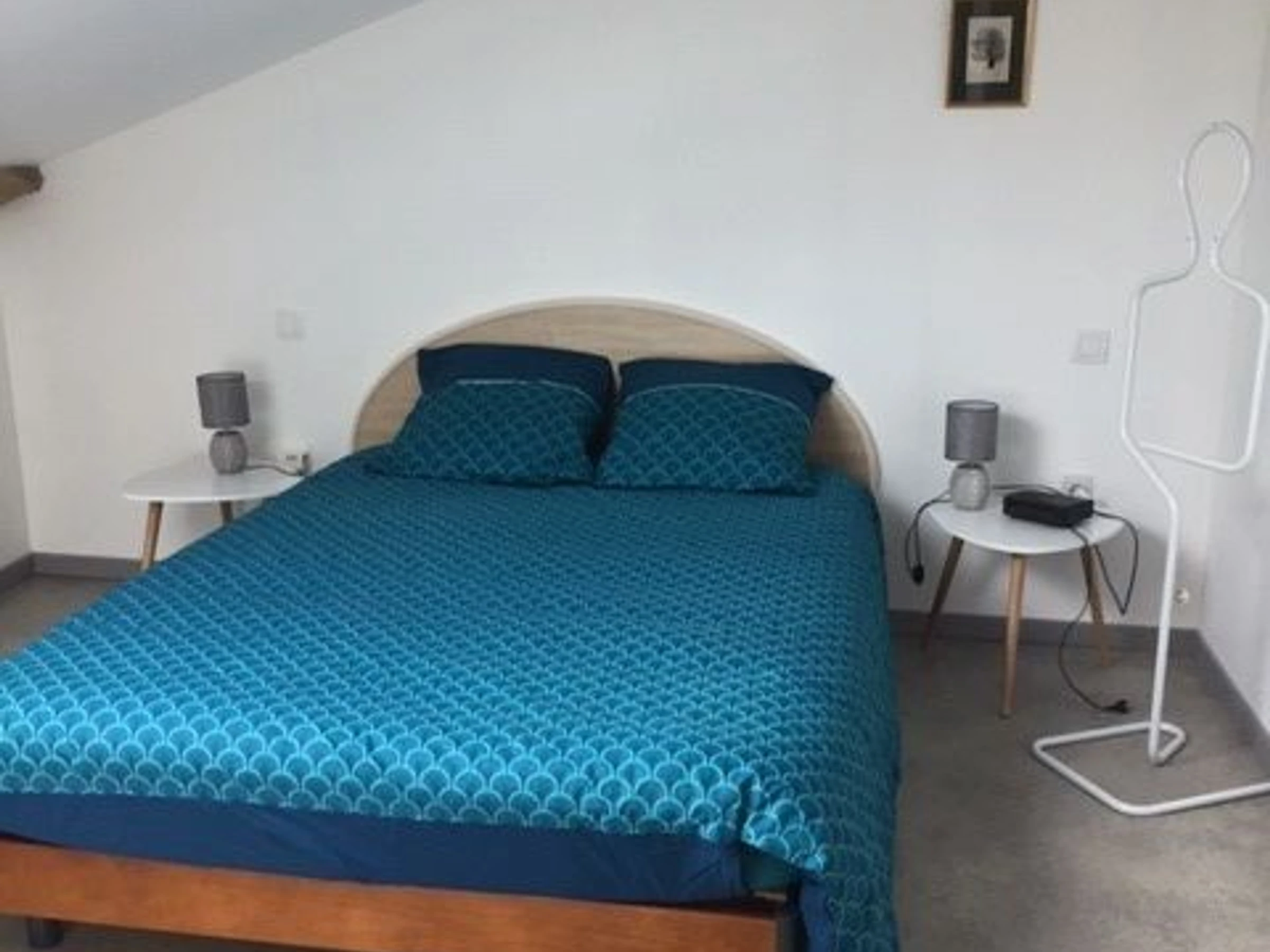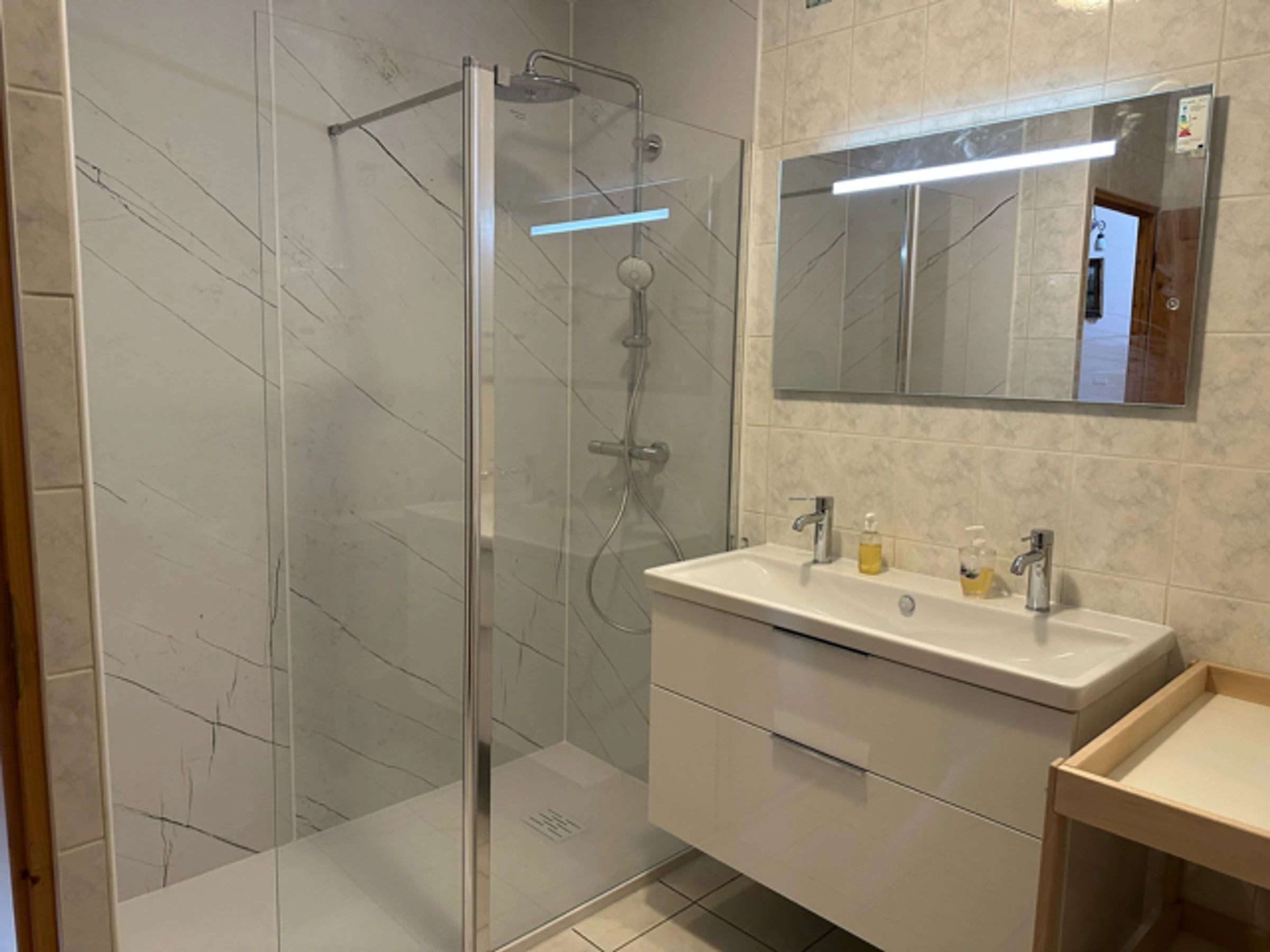 Zwischengeschoss: Über einen sonnigen Flur erreichbar, ein Schlafzimmer (ein Queensize-Bett (160 x 200 cm)) + Badezimmer mit Dusche und separatem WC.