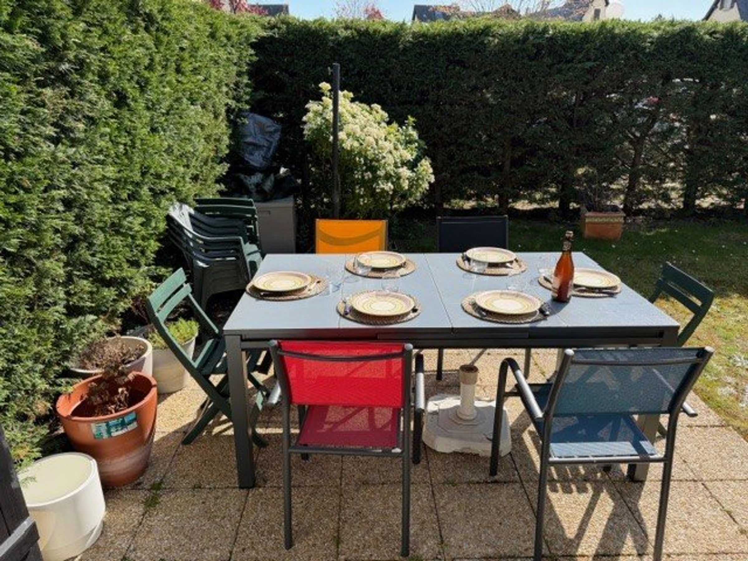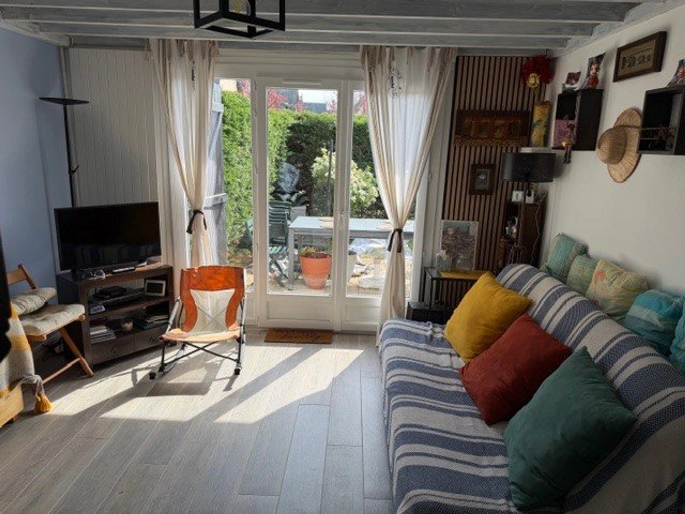 Vom Wohnzimmer gelangen Sie in einen schönen Garten mit Gartenmöbeln – ideal, um sonnige Tage zu genießen.