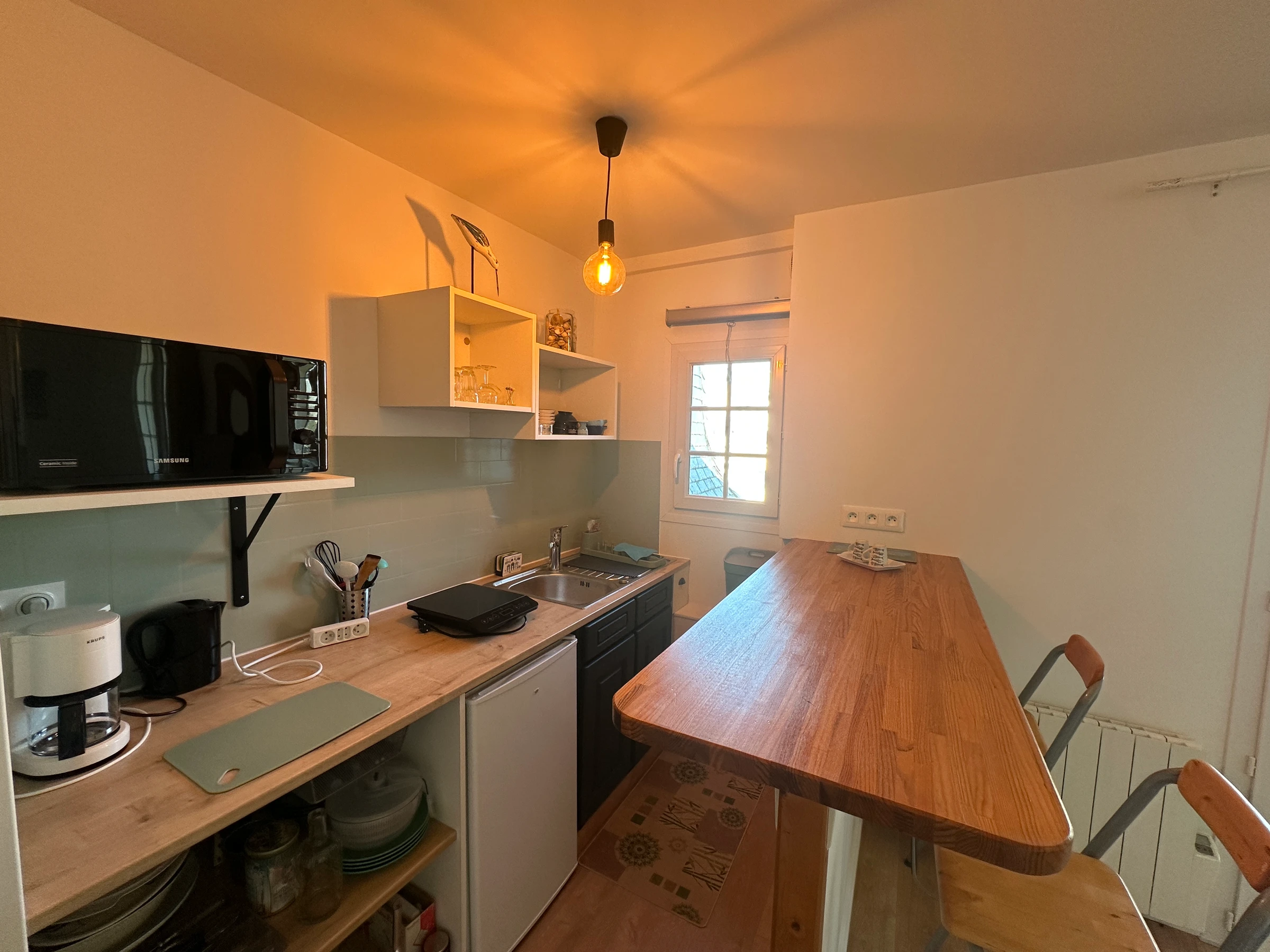 - Offene Einbauküche: Induktionskochfeld, kleiner Kühlschrank, Mikrowelle, Filterkaffeemaschine, Wasserkocher, Toaster und Fernseher