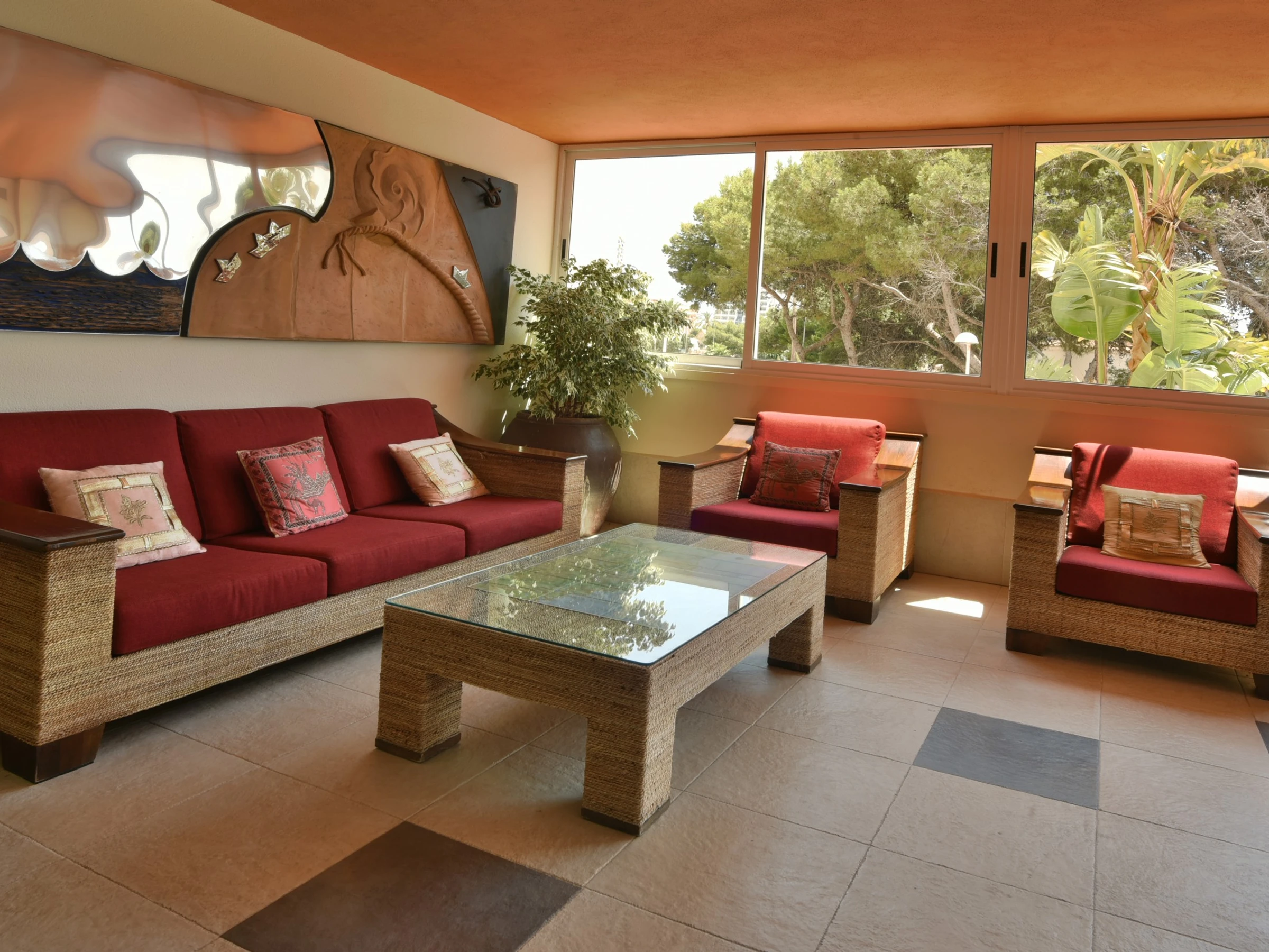 Das Apartment verfügt über ein Hauptschlafzimmer mit einem komfortablen Doppelbett und einem Zusatzbett, perfekt für Reisende mit einem kleinen Kind. Der Wohnbereich verfügt über Klimaanlage und eine gemütliche Ruhezone mit Sofa, ideal zum Entspannen nach einem Tag in der Sonne.