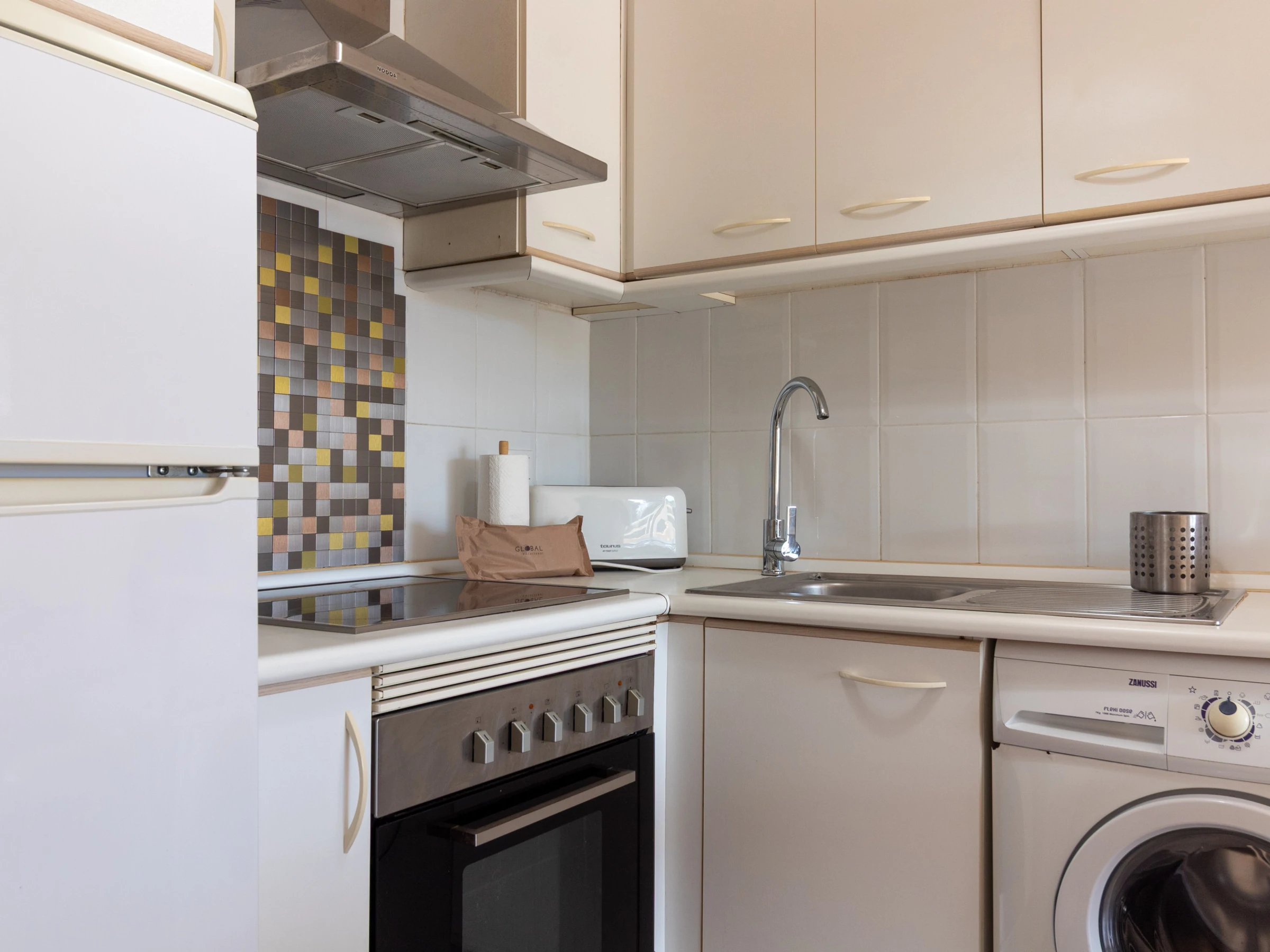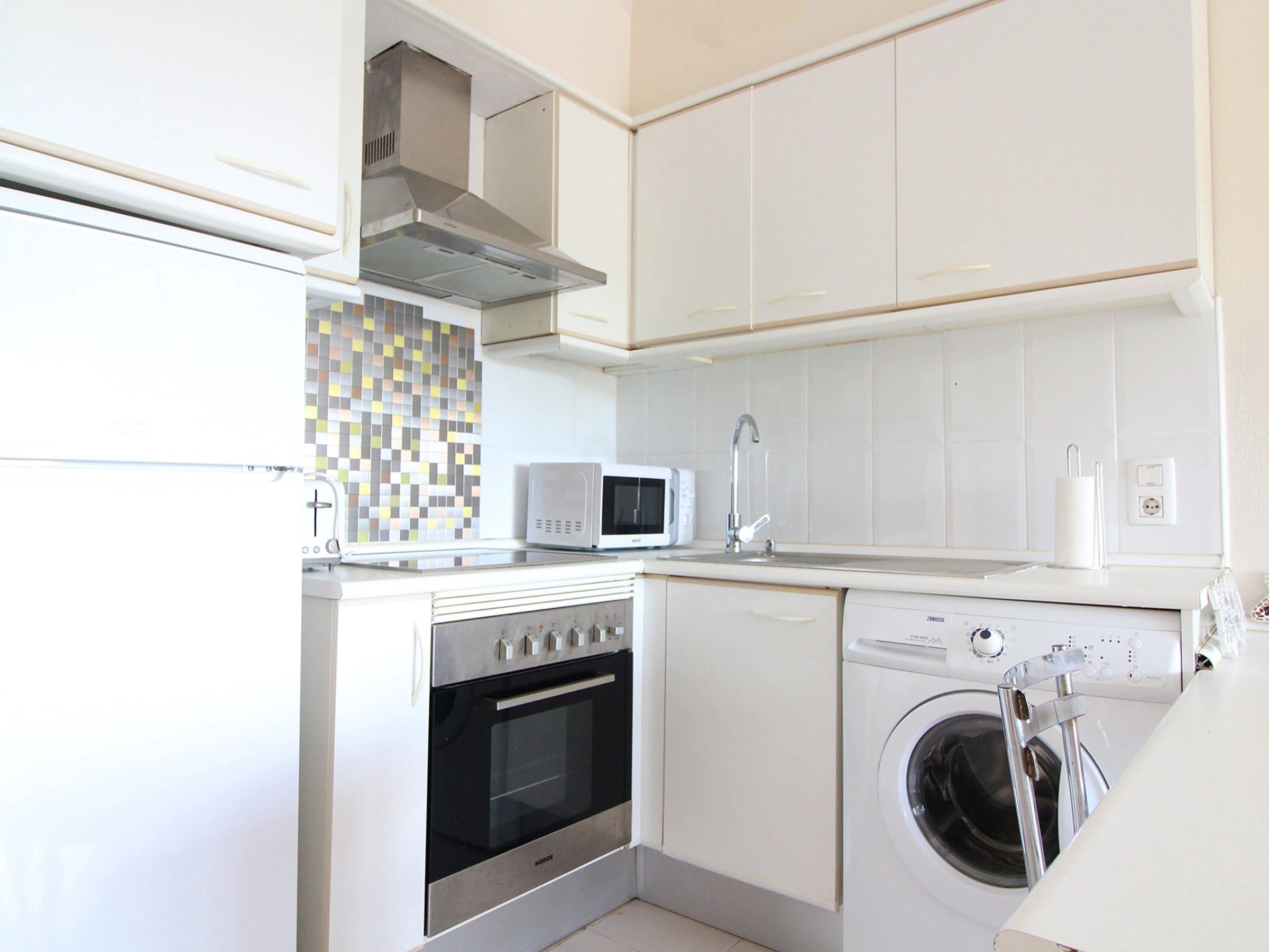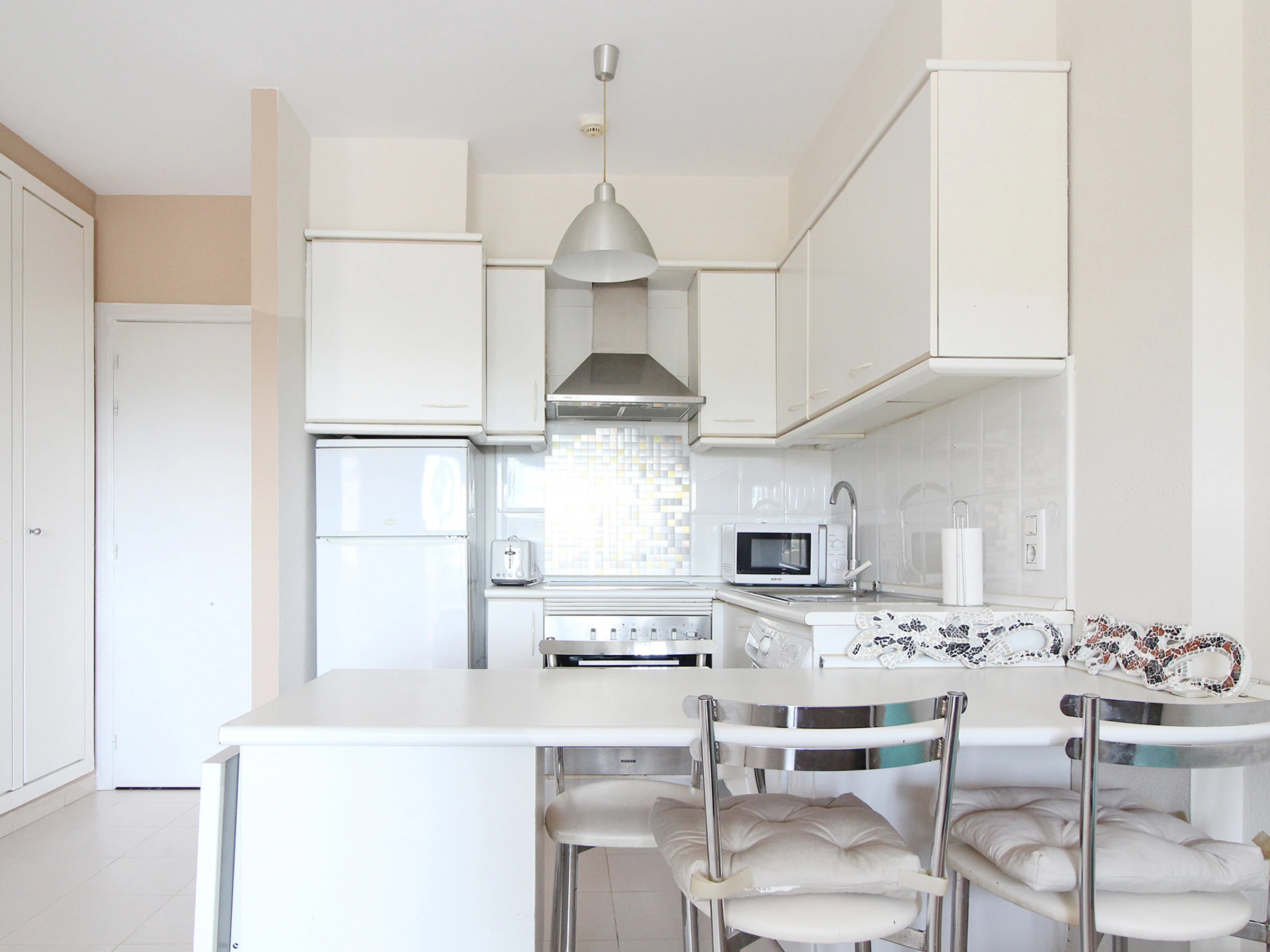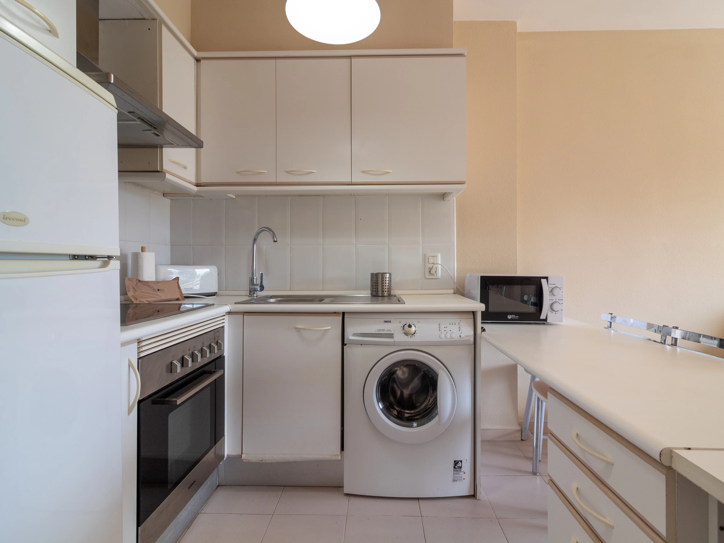 Dieses offene küche, mit ceranfeld, ist ausgestattet in kühlschrank, mikrowelle, backofen, gefrierschrank, geschirr/besteck, kaffeemaschine und toaster.