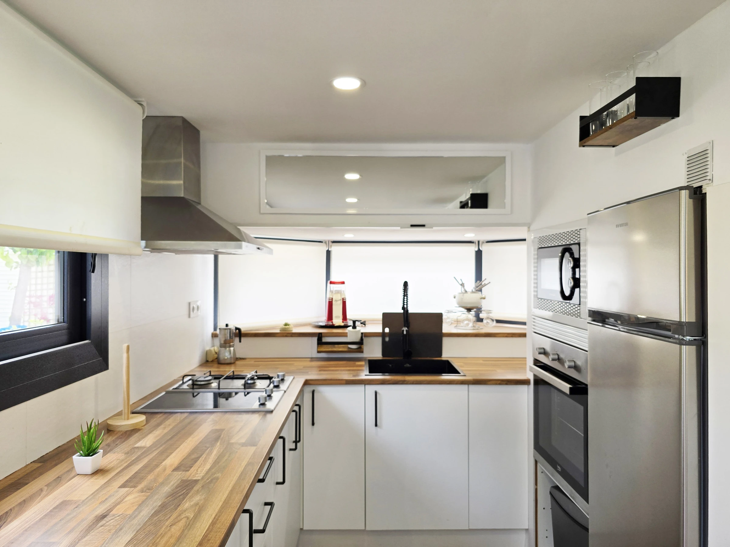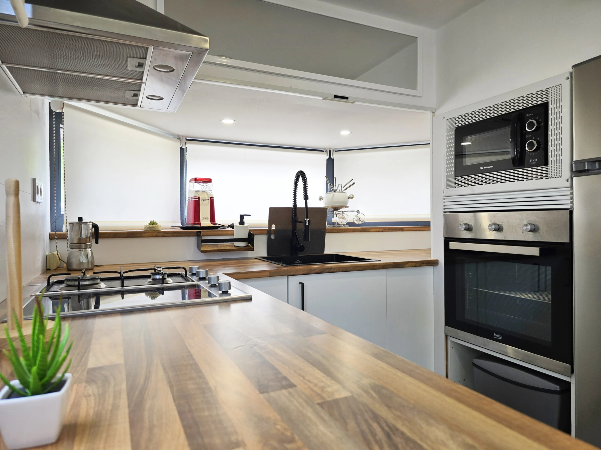 Dieses offene küche, mit gas-kochfeld, ist ausgestattet in kühlschrank, mikrowelle, gefrierschrank, geschirr/besteck, kochutensilien, kaffeemaschine, toaster, wasserkocher und saftpresse.
