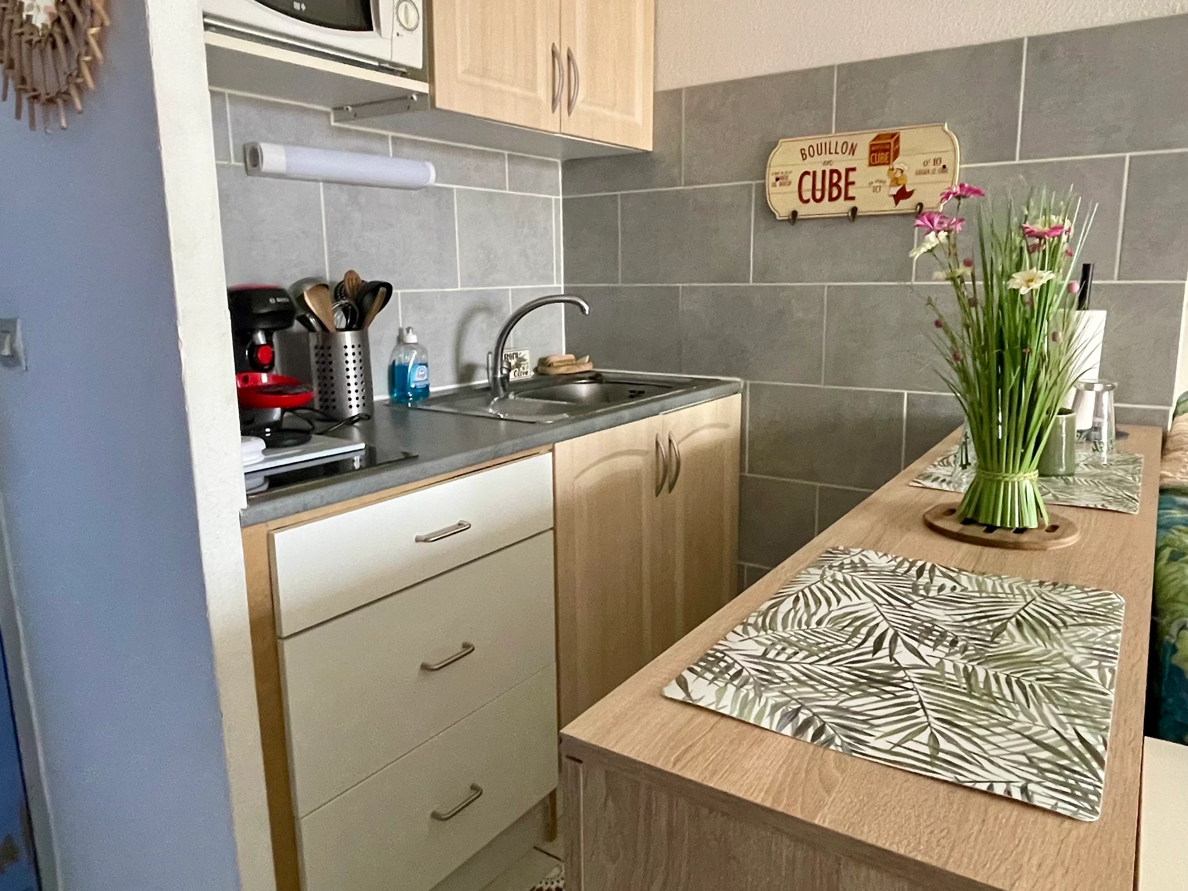 Komfortable 3-Zimmer-Wohnung mit 33 m², bestehend aus einem Eingangsbereich, einem Duschbad mit Waschmaschine, separatem WC, einer Einbauküche (Elektroherd, Kaffeemaschine, Mikrowelle, Kühlschrank), einem klimatisierten Wohnzimmer (TV, 2-Bett-Schlafsofa 80 x 200 cm).