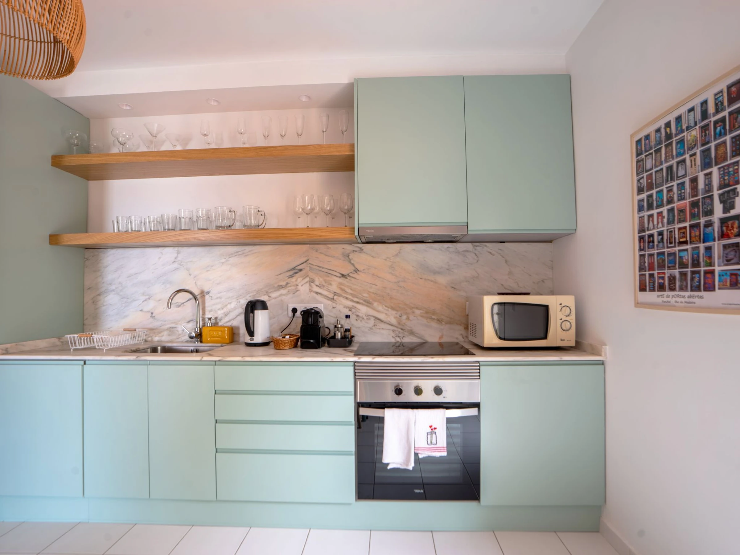 Die Zubereitung von Mahlzeiten ist in der Küche einfach, die vollständig mit allen Essentials ausgestattet ist. Ihnen stehen ein Kühlschrank, Gefrierschrank, Ofen, Mikrowelle, Herd und ein komplettes Set an Besteck und Tellern zur Verfügung. Ob Sie ein schnelles Frühstück oder ein vollständiges Abendessen zubereiten, die Einrichtungen sind bereit. Der Wohnbereich bietet einen Smart-TV mit Box für Ihre Unterhaltung.