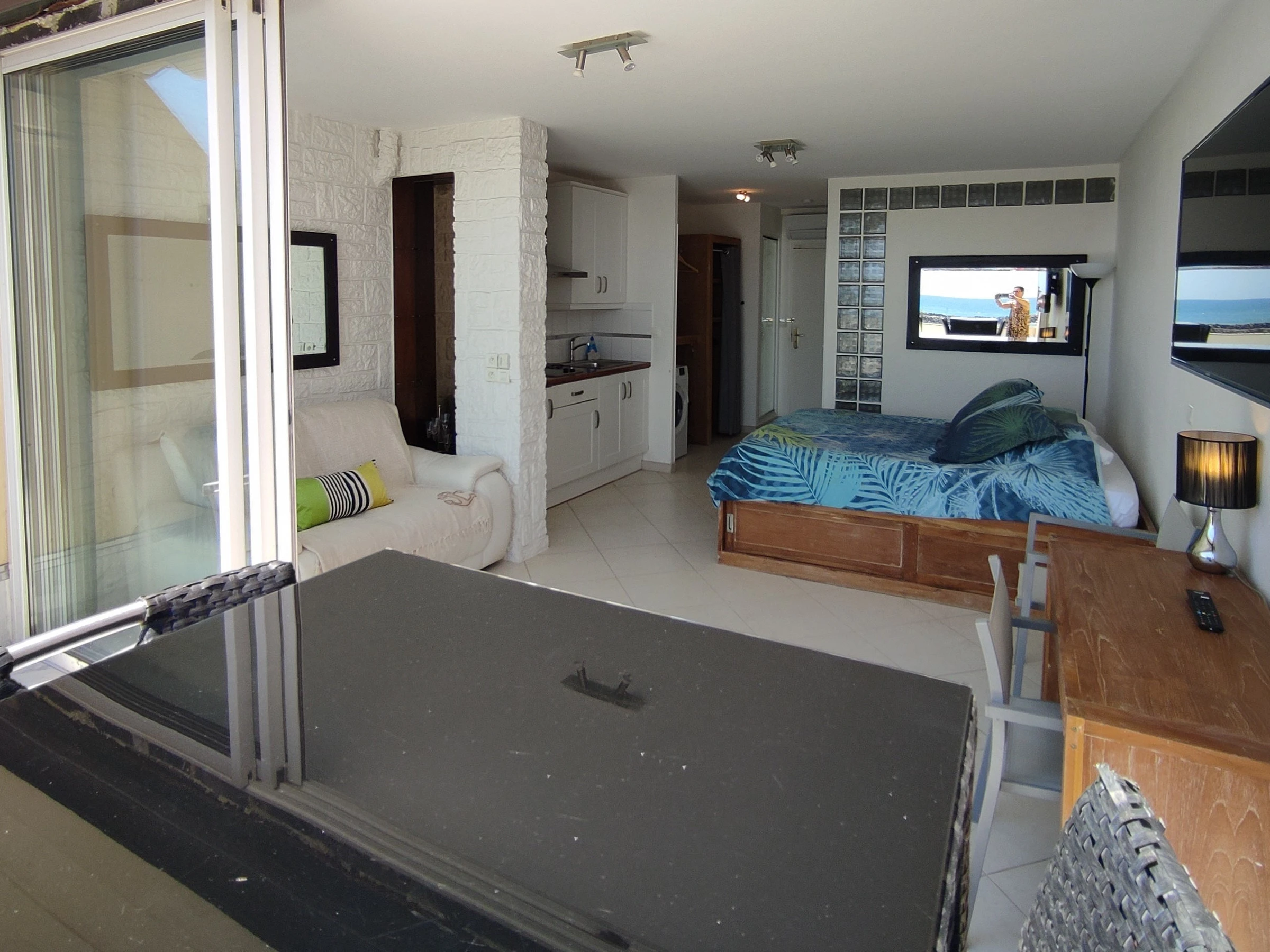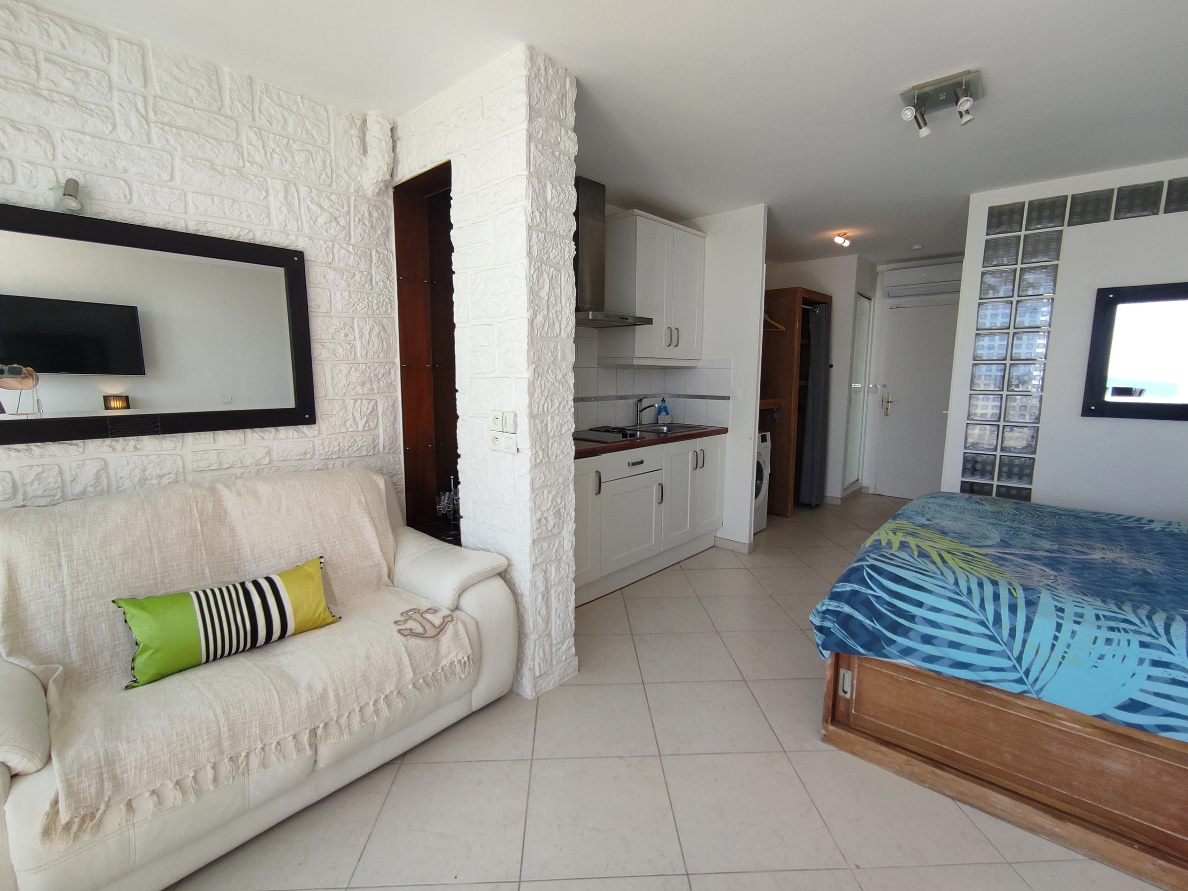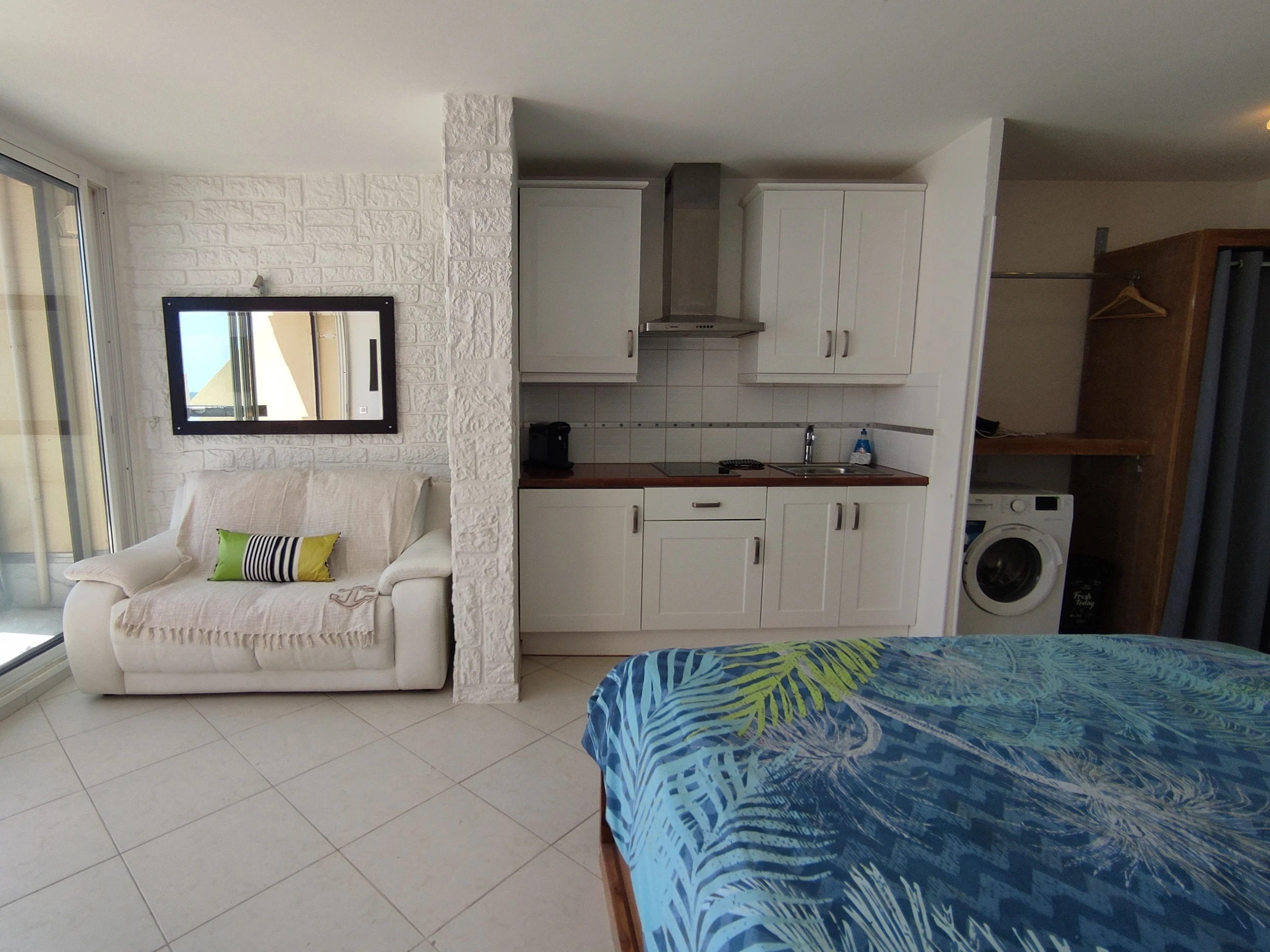 Monolocale climatizzato per 2 persone, situato Résidence Heliopolis Building C. Al 3° piano con ascensore. Soggiorno zona notte (letto matrimoniale 180 cm) e angolo cottura attrezzato : lavatrice, microonde, macchina per il caffè (tassimo). Bagno con wc. Terrazzo. Vista su Porto Natura e mare. Parcheggio privato n. 213.
