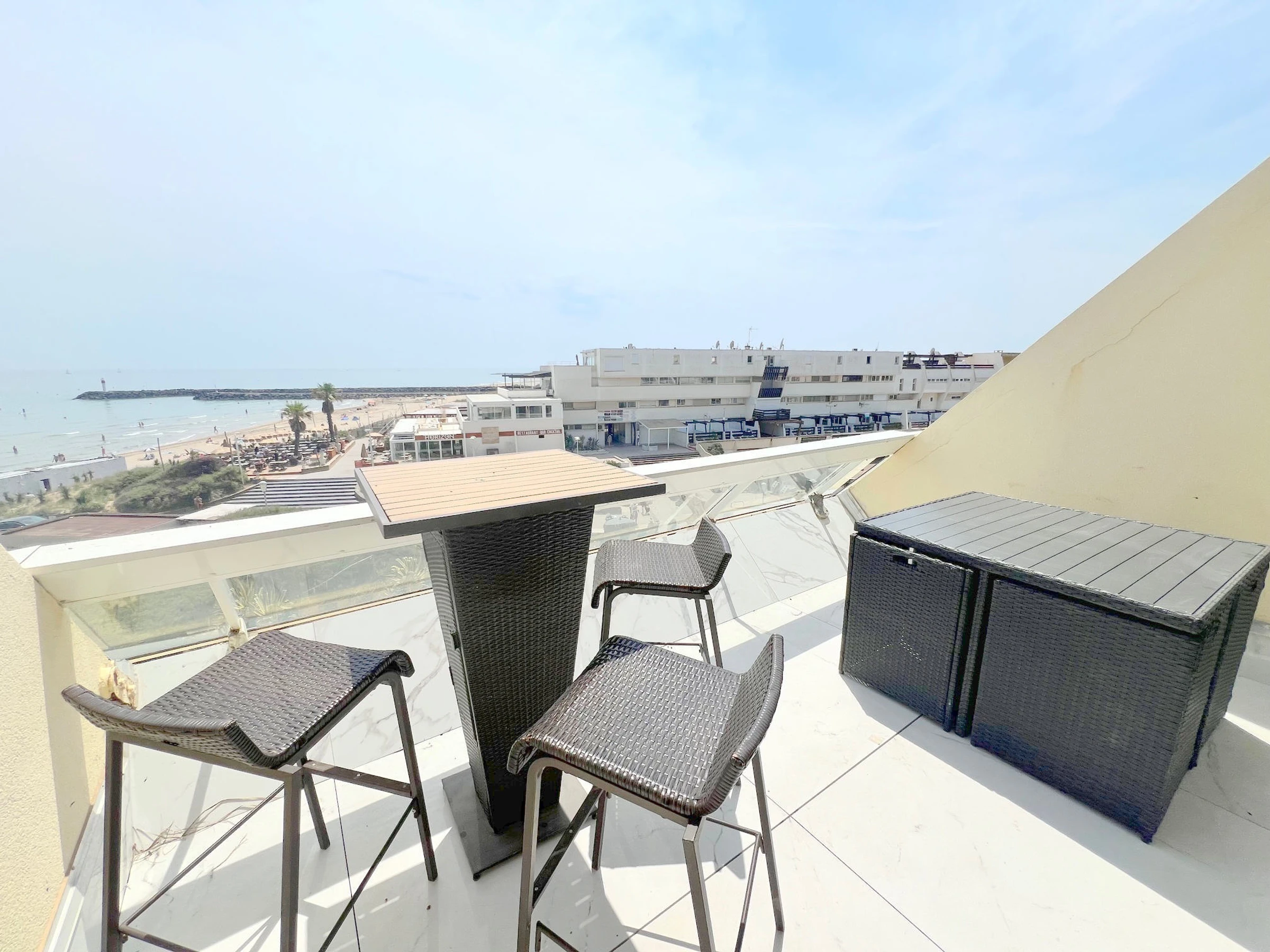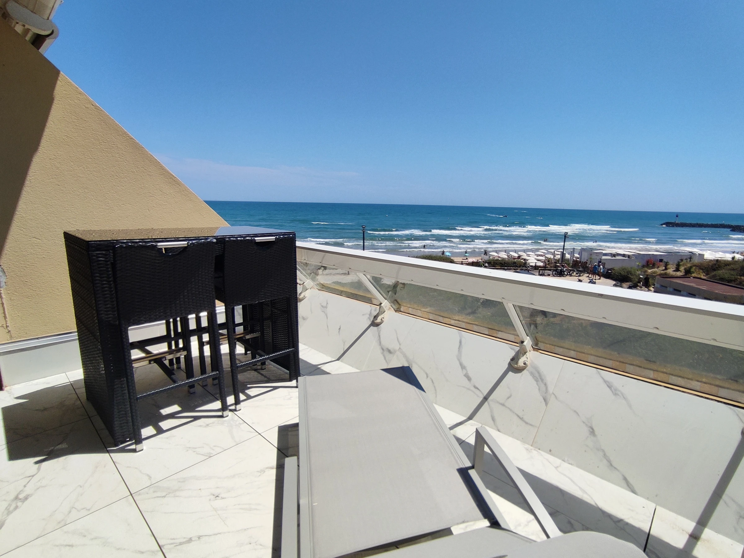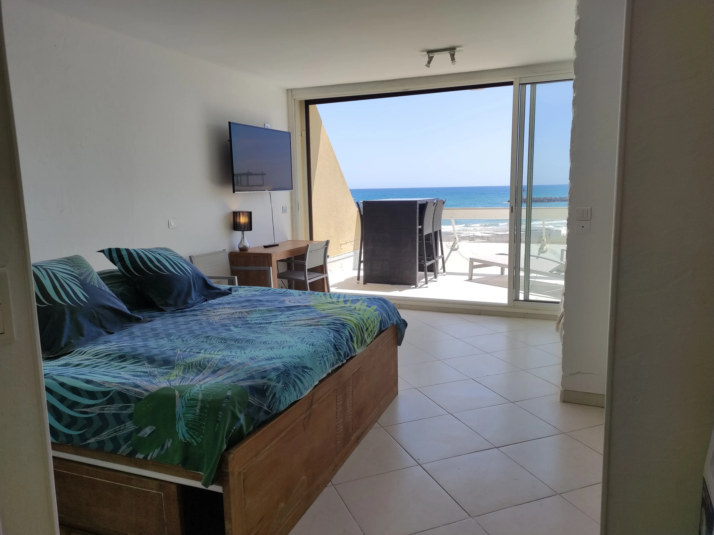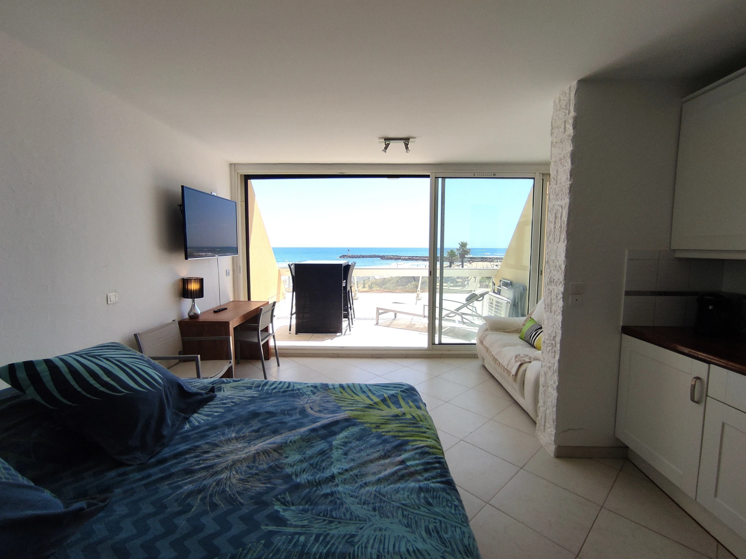 Monolocale climatizzato per 2 persone, situato Résidence Heliopolis Building C. Al 3° piano con ascensore. Soggiorno zona notte (letto matrimoniale 180 cm) e angolo cottura attrezzato : lavatrice, microonde, macchina per il caffè (tassimo). Bagno con wc. Terrazzo. Vista su Porto Natura e mare. Parcheggio privato n. 213.