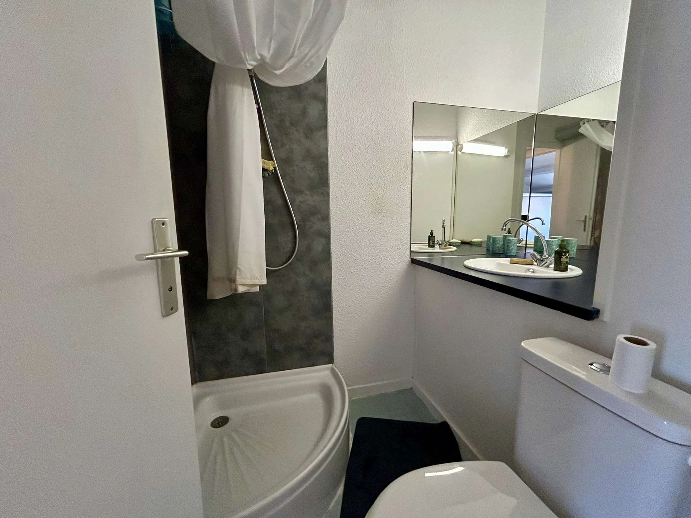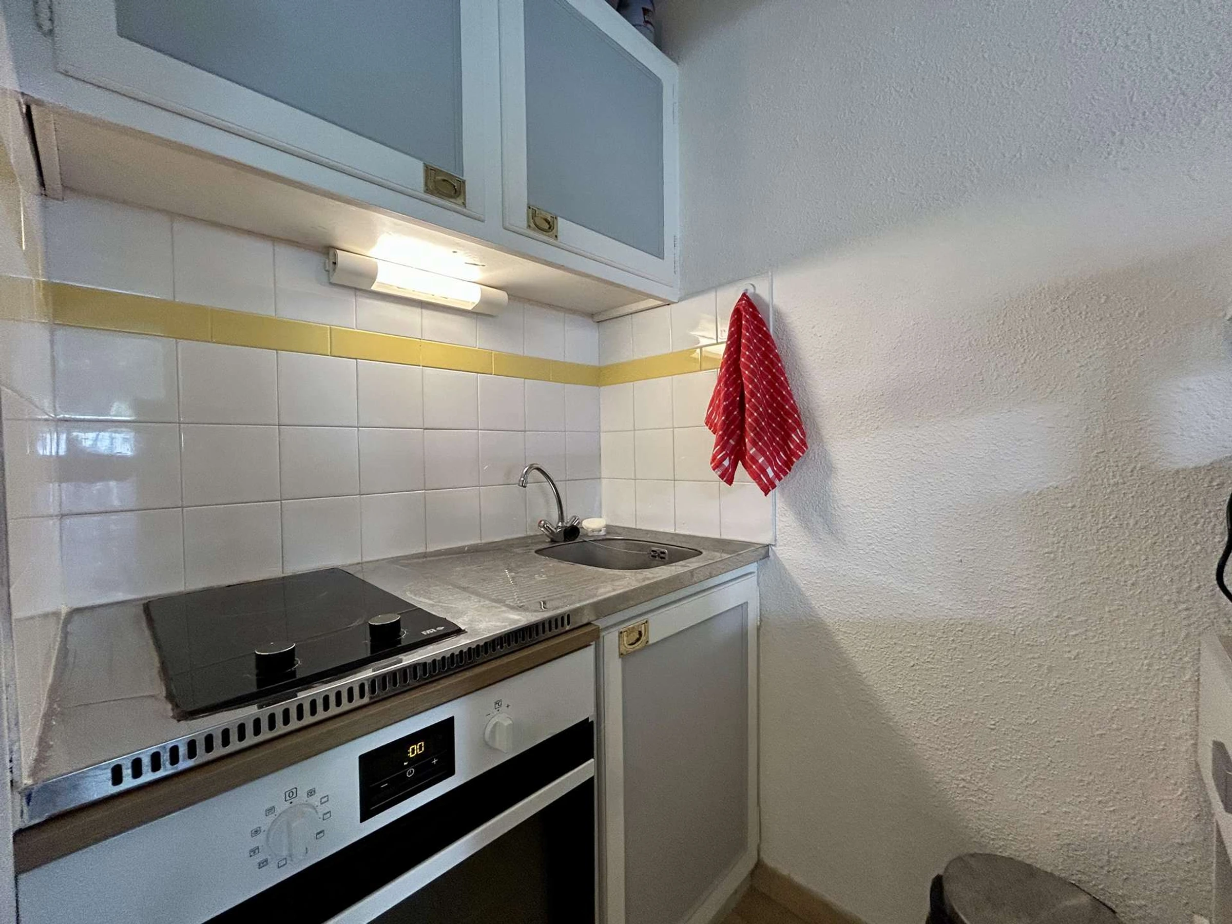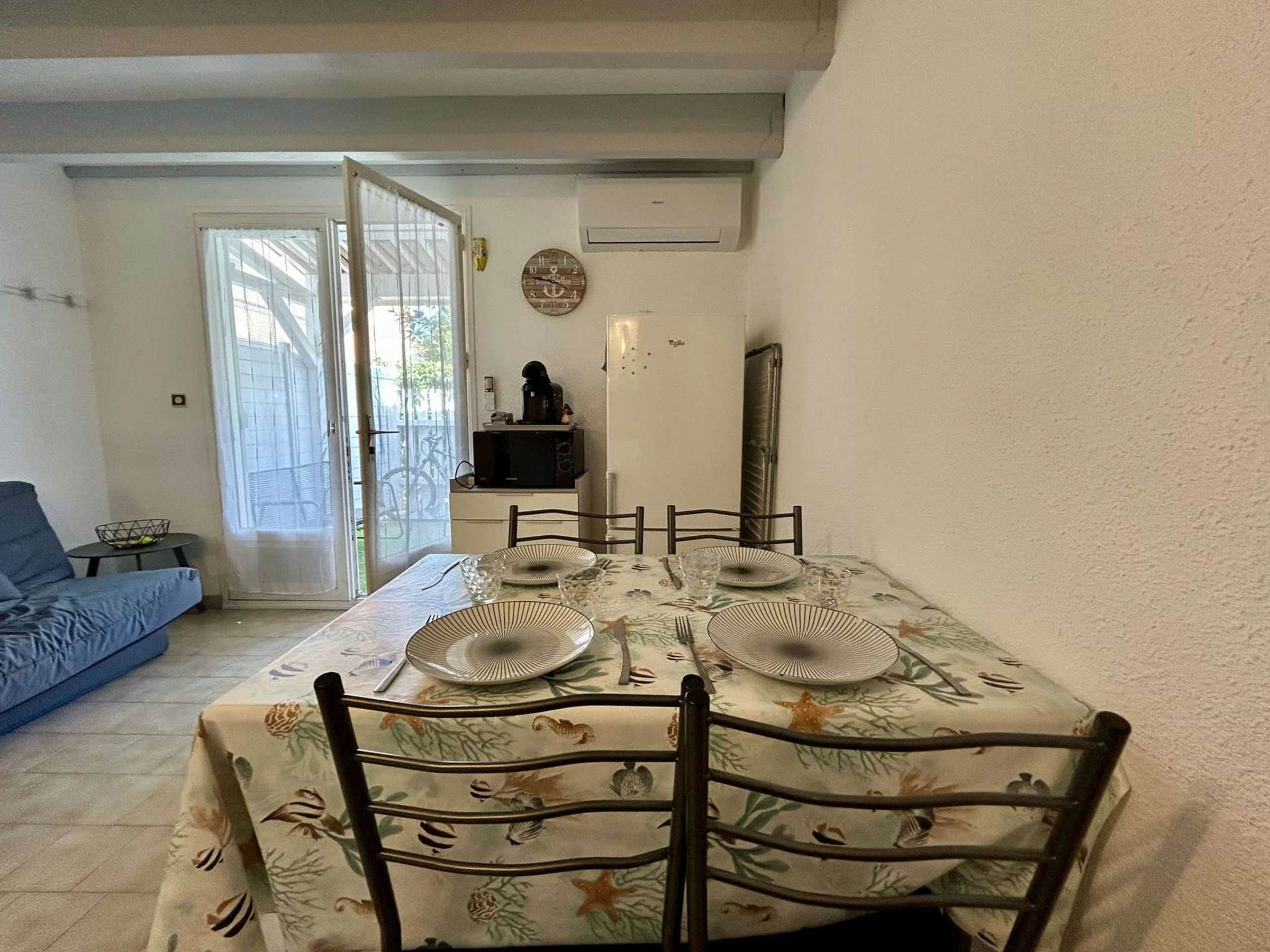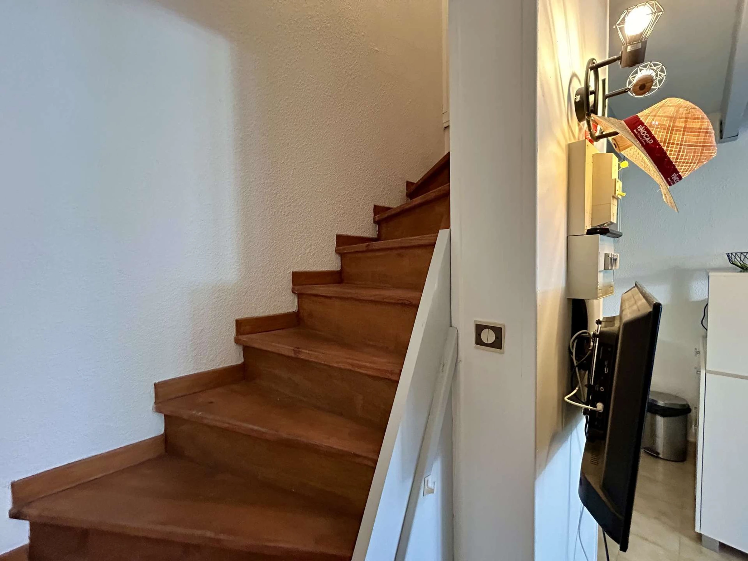 Der Zugang zur Villa erfolgt über eine schöne 13 m² große Terrasse, die über eine Glastür in die Wohnung führt. Diese kleine Zwei-Zimmer-Villa im Gartengeschoss besteht aus einem Wohnzimmer im Erdgeschoss mit festem Schlafsofa und Fernseher, einer ausgestatteten Küche und einem Abstellraum unter der Treppe. Im Obergeschoss befinden sich ein Schlafbereich mit zwei Etagenbetten (90 cm), ein Doppelzimmer mit Fenster und einem Doppelbett (140 cm) sowie ein Badezimmer mit WC.
