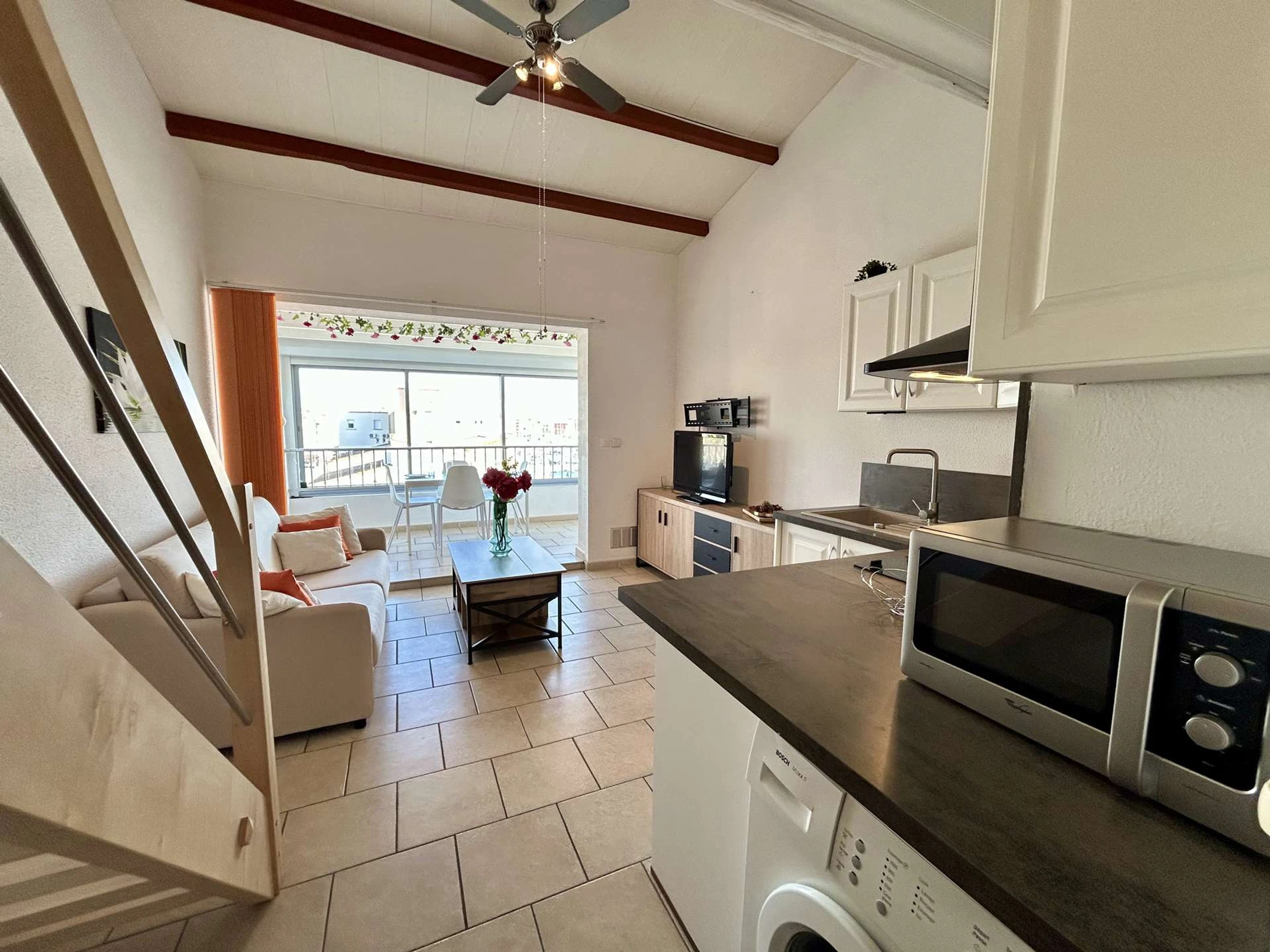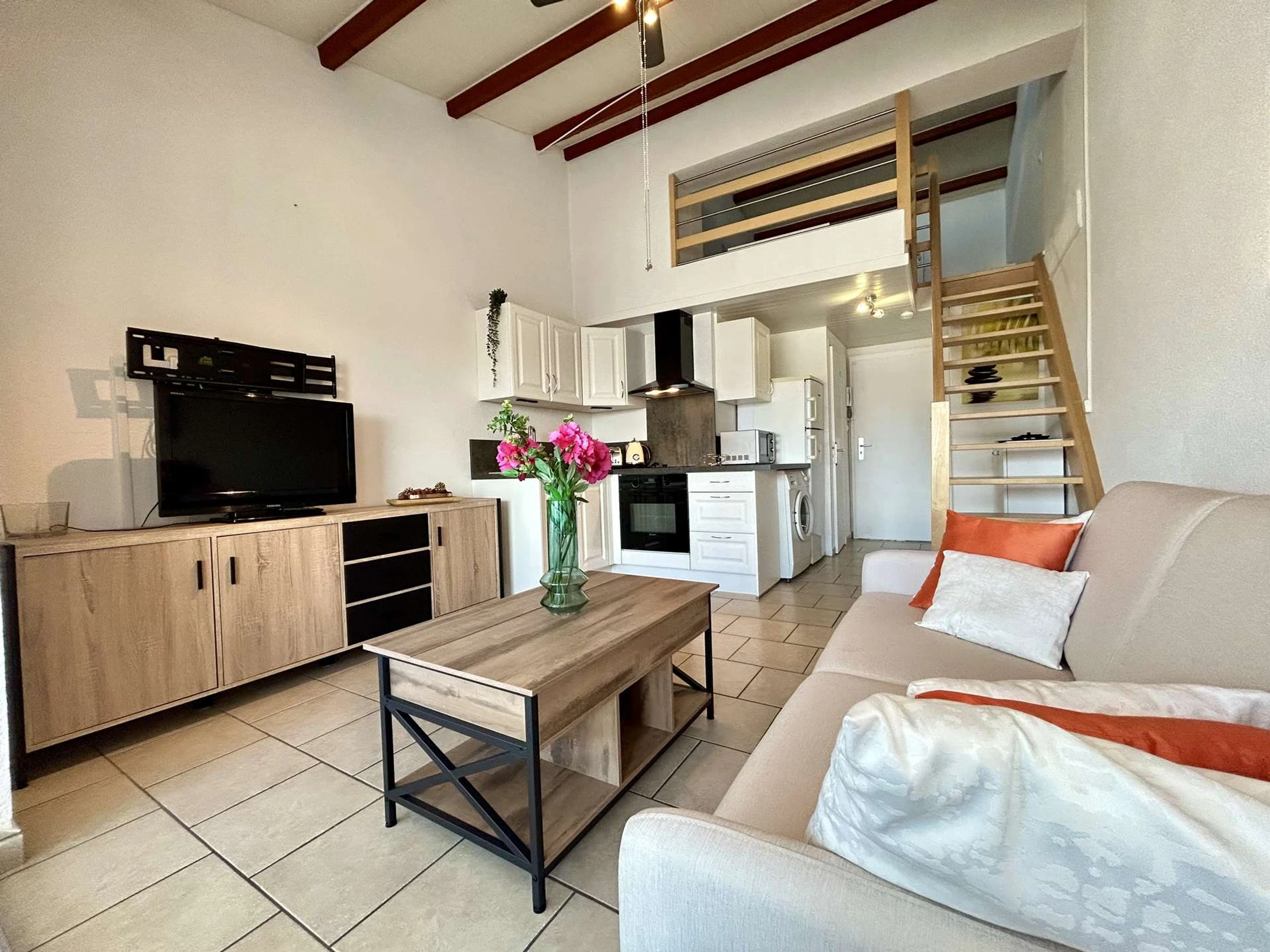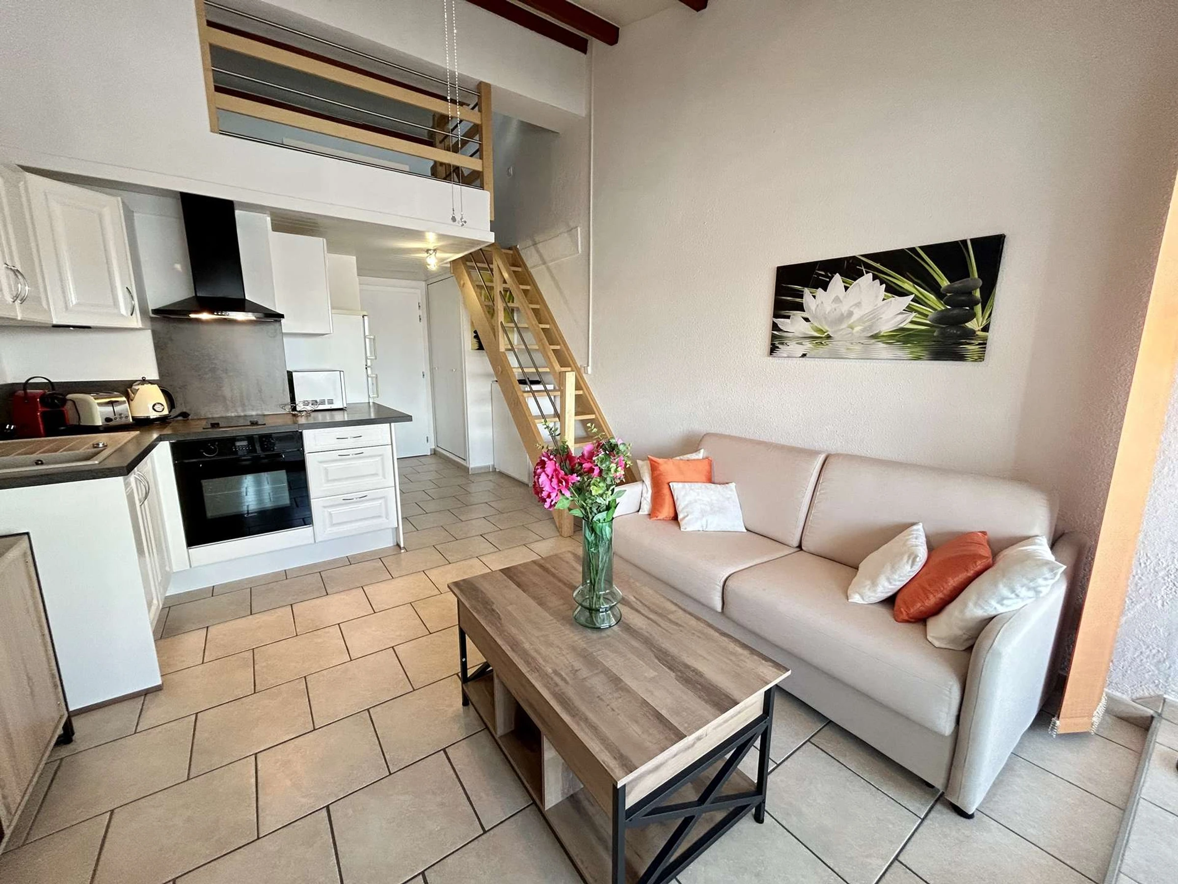 Diese Ferienwohnung im 3. Stock (ohne Aufzug) verfügt über ein Wohnzimmer mit Schlafcouch und Flachbildfernseher, ein Schlafzimmer auf der Galerie mit Doppelbett und großem Kleiderschrank, eine voll ausgestattete Küchenzeile sowie ein Duschbad mit WC.