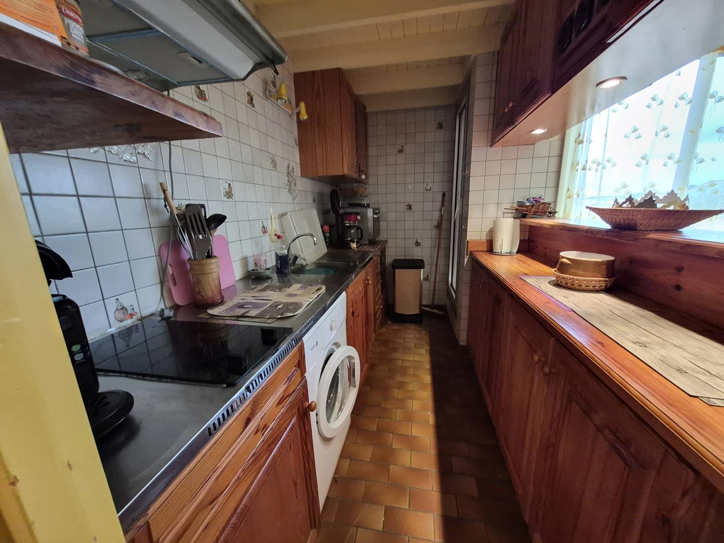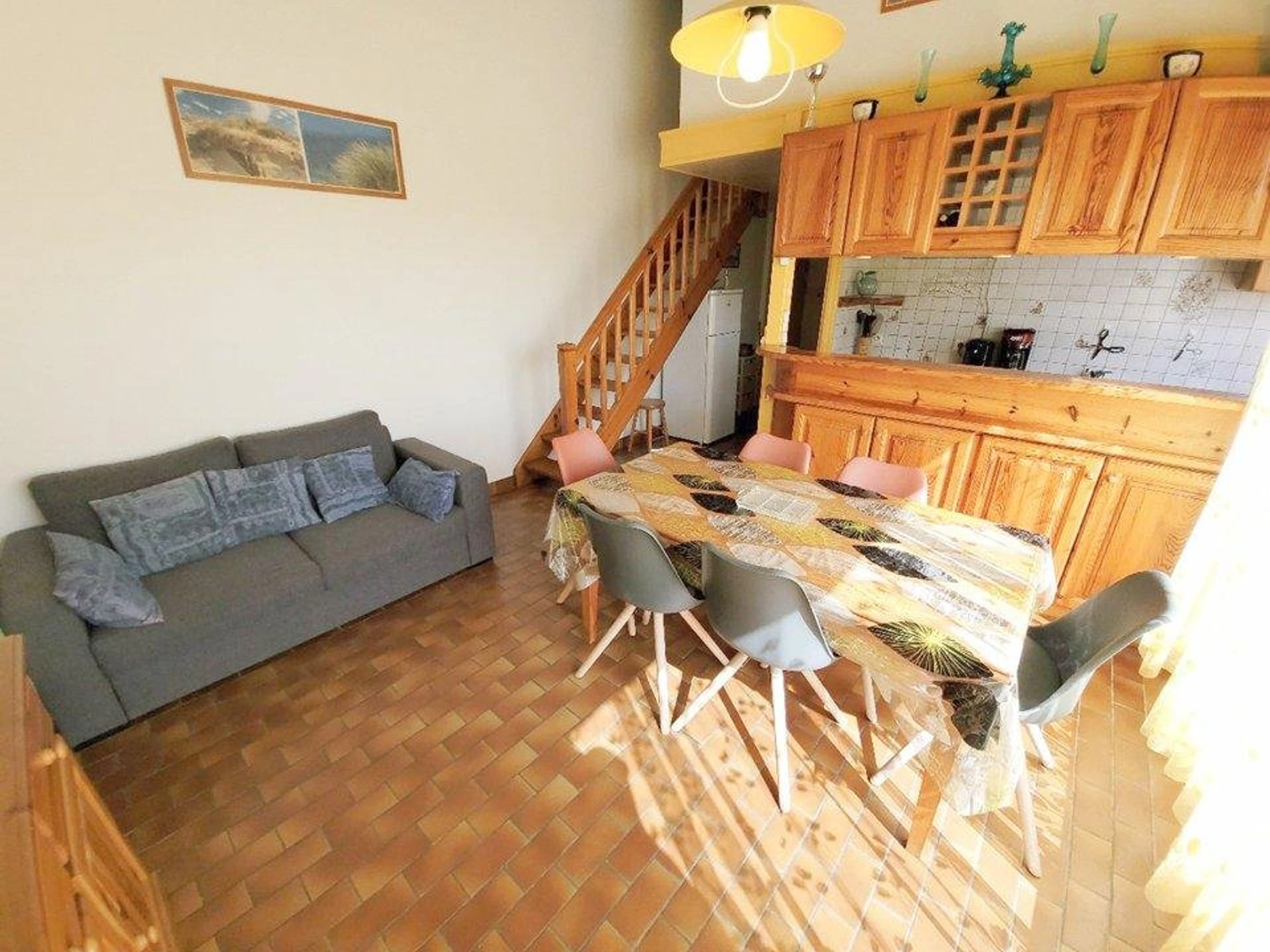 Wohnzimmer mit Zugang zu einer nach Osten ausgerichteten Terrasse (14 m²). Offene Küche: Induktionskochfeld mit 4 Kochplatten, Mikrowelle, Minibackofen, Kühl-/Gefrierkombination, Waschmaschine.