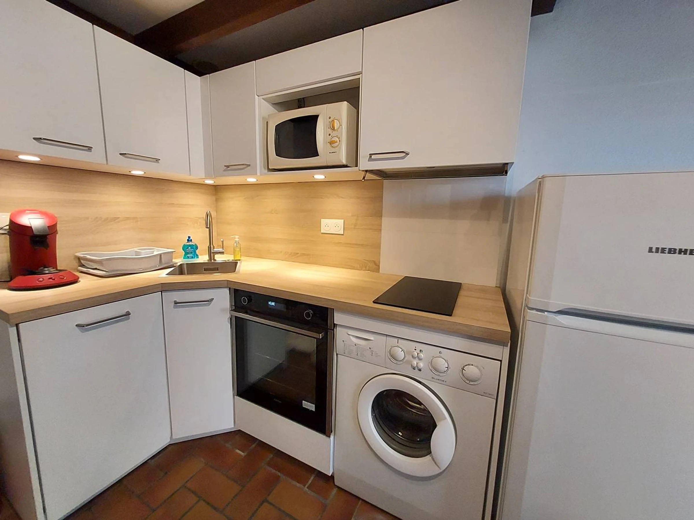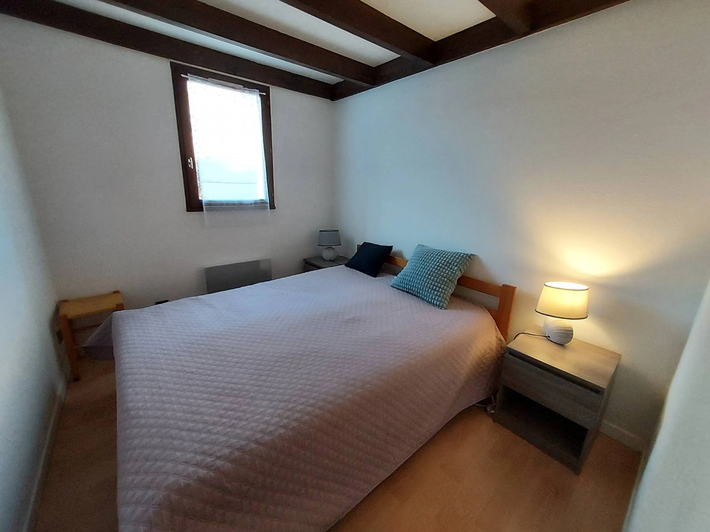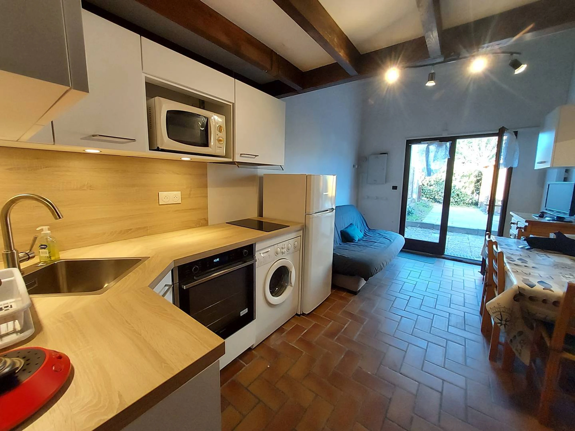 Wohnzimmer mit Zugang zur Terrasse. Kochnische: Induktionskochfeld mit 2 Kochplatten, Backofen, Mikrowelle, Kühl-/Gefrierkombination, Geschirrspüler und Waschmaschine. Duschbad (0,88 x 2,19 m): Waschbecken und Dusche. Separates WC. Schlafzimmer 1 (3,38 x 2,32 m): 1 Doppelbett (140 cm). Obergeschoss: Galerie (offen über dem Wohnzimmer) (2,74 x 1,25 m + 1,48 x 0,91 m): 1 Einzelbett (90 cm), Teppichboden. Schlafzimmer 2 (3,36 x 2,31 m): 1 Doppelbett (140 cm), Teppichboden. Gartenmöbel und elektrischer Tischgrill. Der Pool ist von Juni bis September geöffnet.