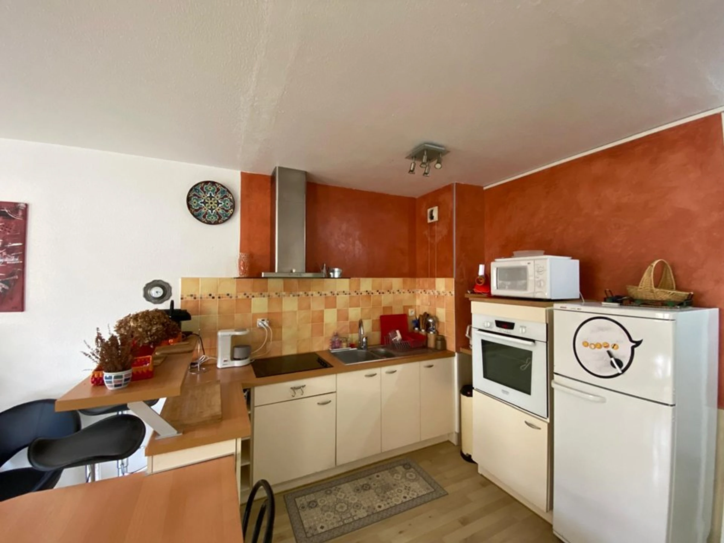 - eine offene Küche mit Kühlschrank, Backofen, Mikrowelle, Kaffeemaschine