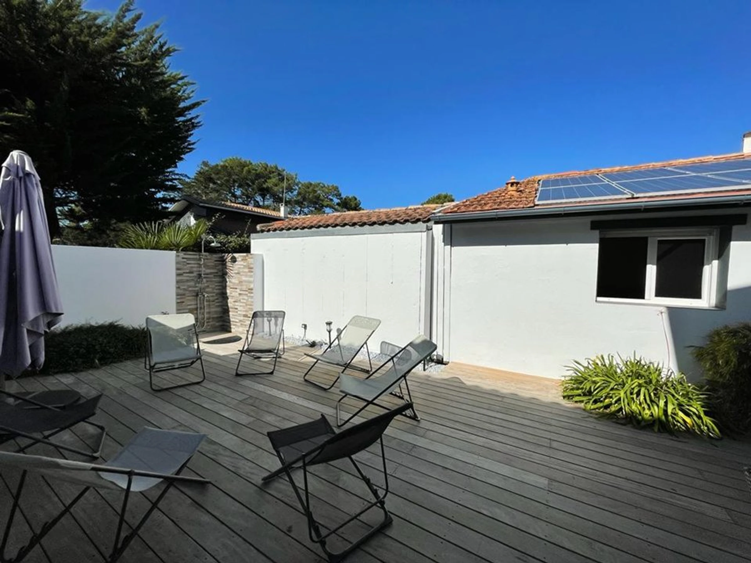 Eine große Terrasse mit Gartenmöbeln, einem Plancha-Grill und einer Außendusche.