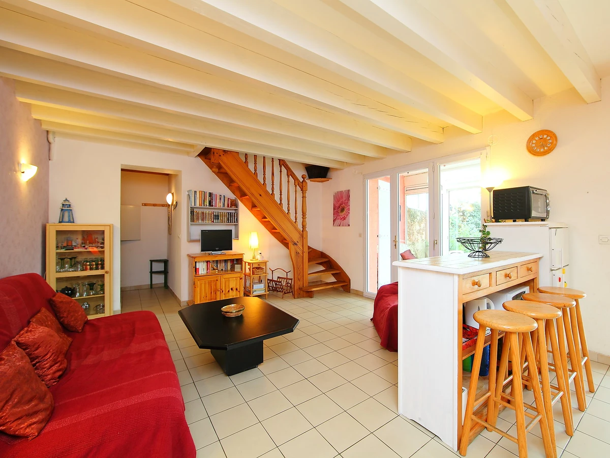 2-Zimmer-Wohnung 55 m2 auf 2 Stockwerken. Wohnzimmer mit TV. Ausgang zur Veranda. Offene Küche (4 Kochplatten, Mini-Backofen, Mikrowelle). Sep. WC. Obergeschoss: abgeschrägt 1 Zimmer mit 1 Bett (90 cm, Länge 190 cm), 1 franz. Bett (140 cm). Galerie mit 1 Bett (90 cm). Dusche. Garten 130 m2. Terrassenmöbel, Gartengrill. Zur Verfügung: Waschmaschine. Internet (Wireless LAN, extra). Parkplatz. Bitte beachten: Rauchmelder. [hidden]