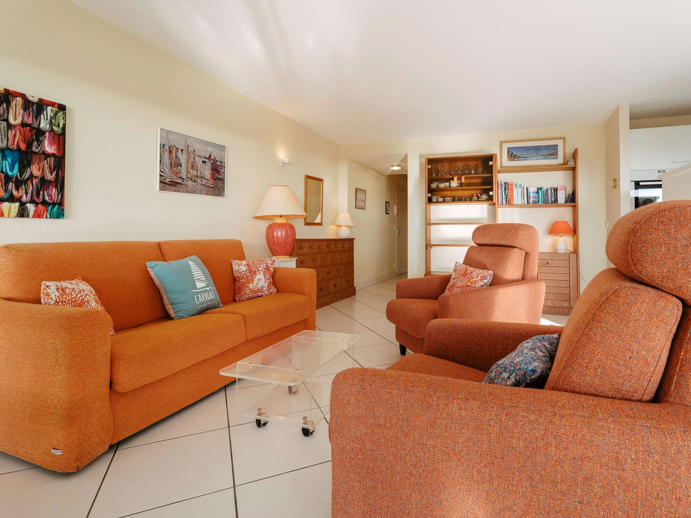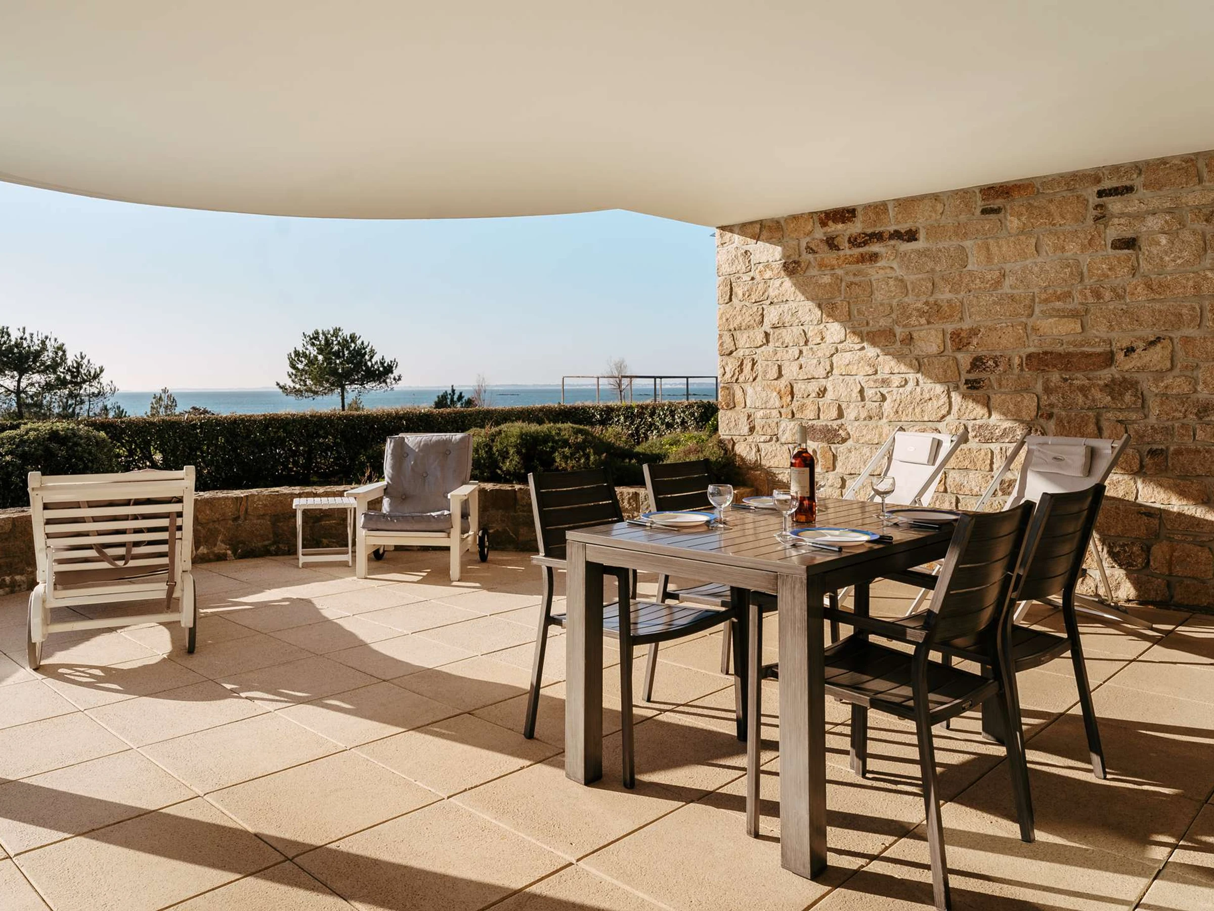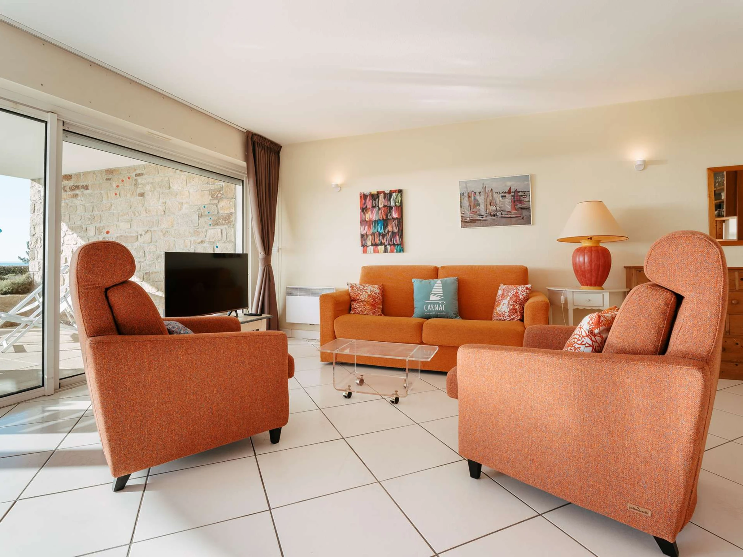 - Großes Wohnzimmer mit Essbereich (Tisch und Stühle) und Lounge-Bereich (TV, Sessel, Schlafcouch für 2 Personen, Decke) mit Zugang zu einer großen, überdachten Südterrasse mit Meerblick (Gartenmöbel)