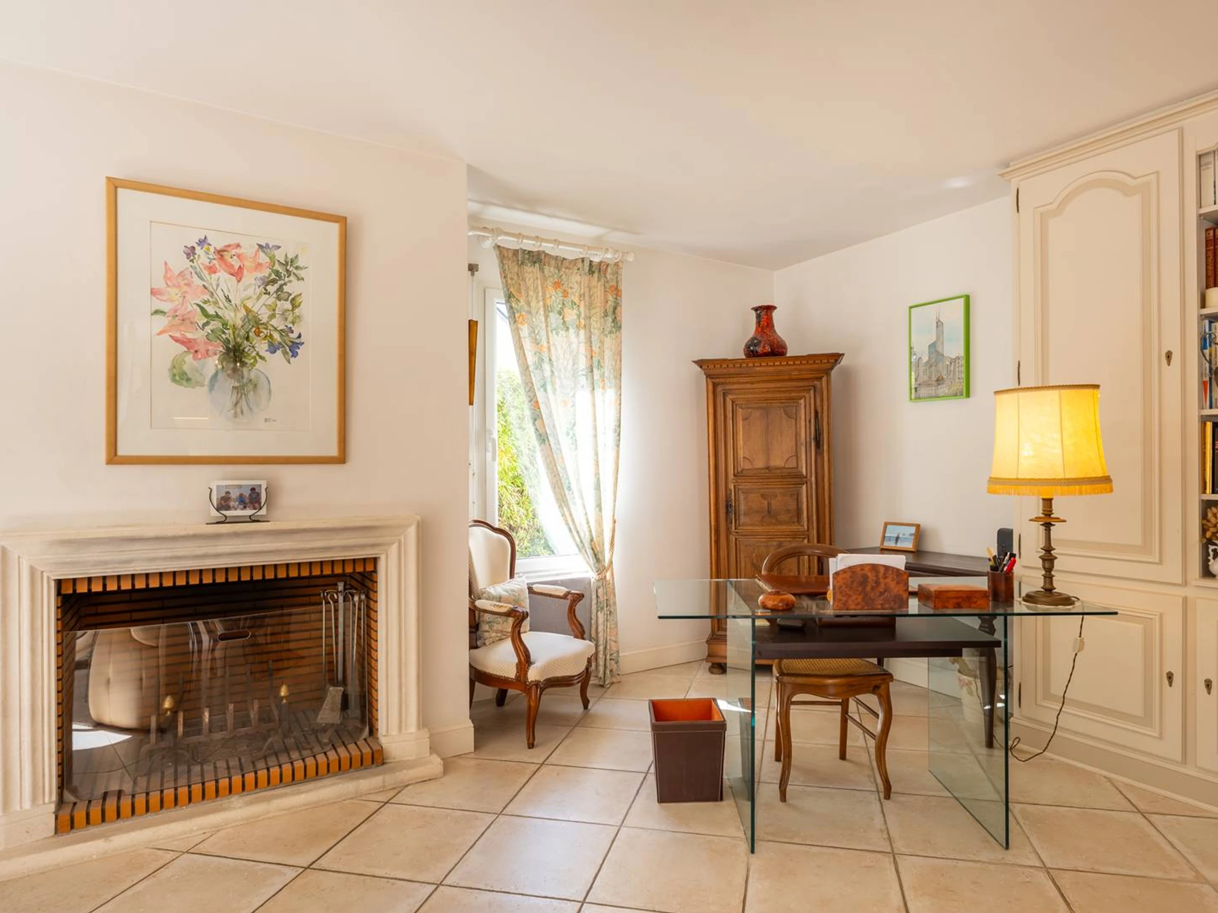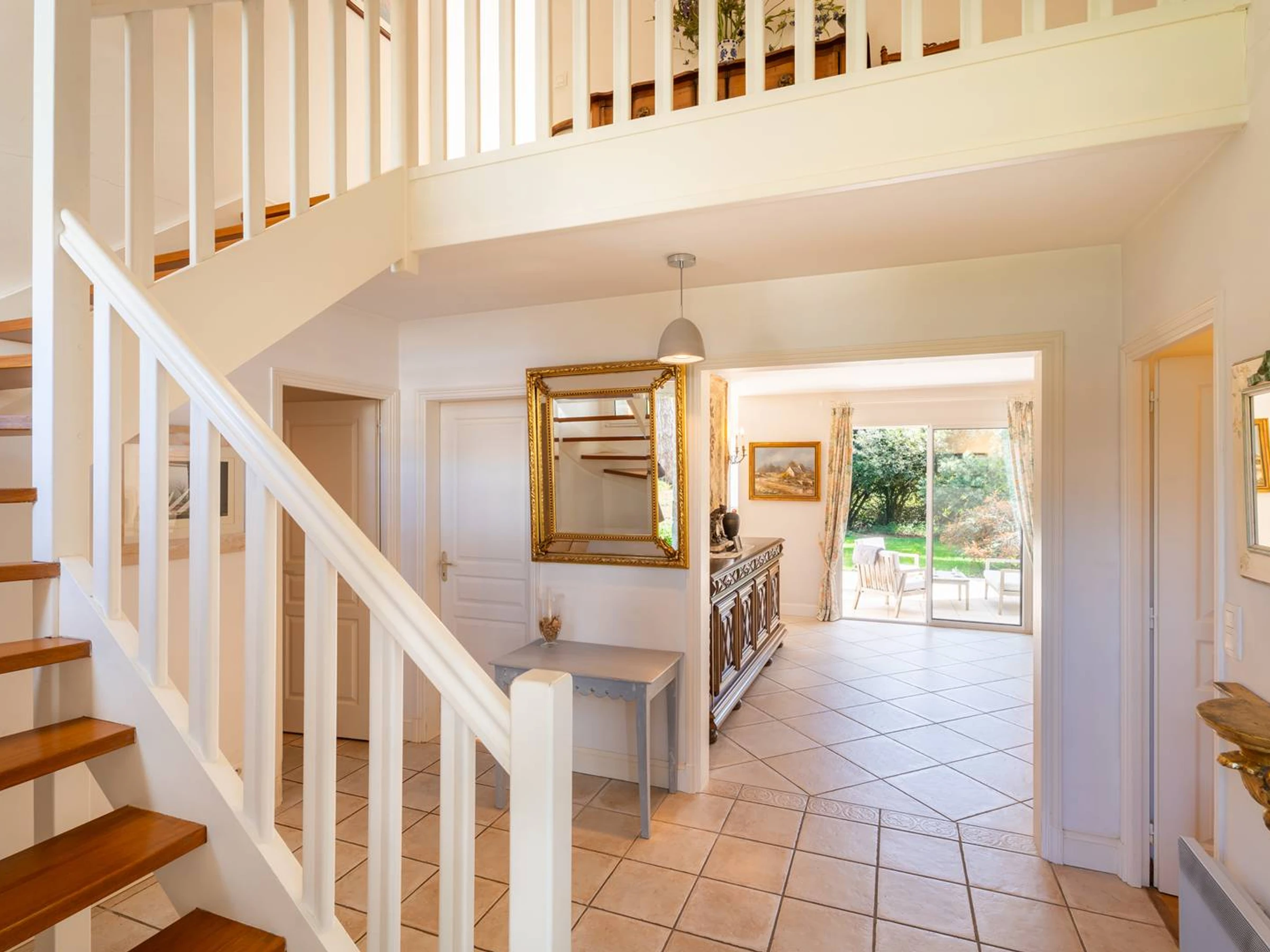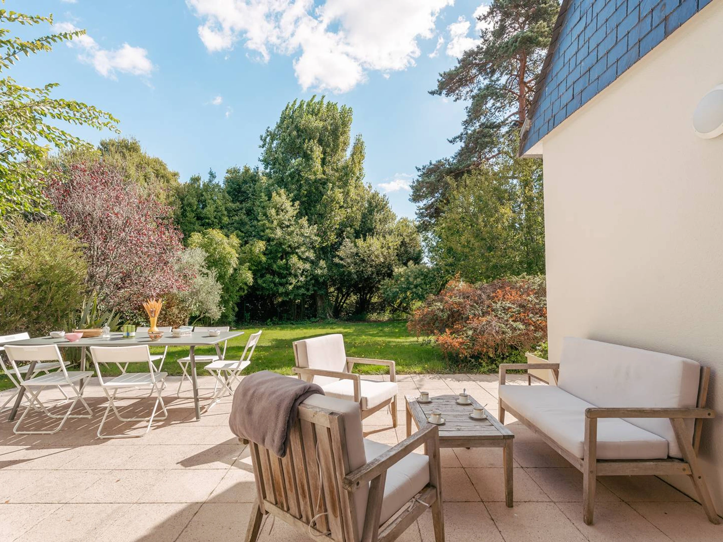 - Großes und helles Wohnzimmer mit Lounge-Bereich (Sofas, Sessel, TV, Kamin ohne Funktion) und Essbereich (Tisch und Stühle), das sich zu einer nach Süd-Südost ausgerichteten Terrasse öffnet, die in einen großen, umzäunten Privatgarten (ca. 860 m²) übergeht.