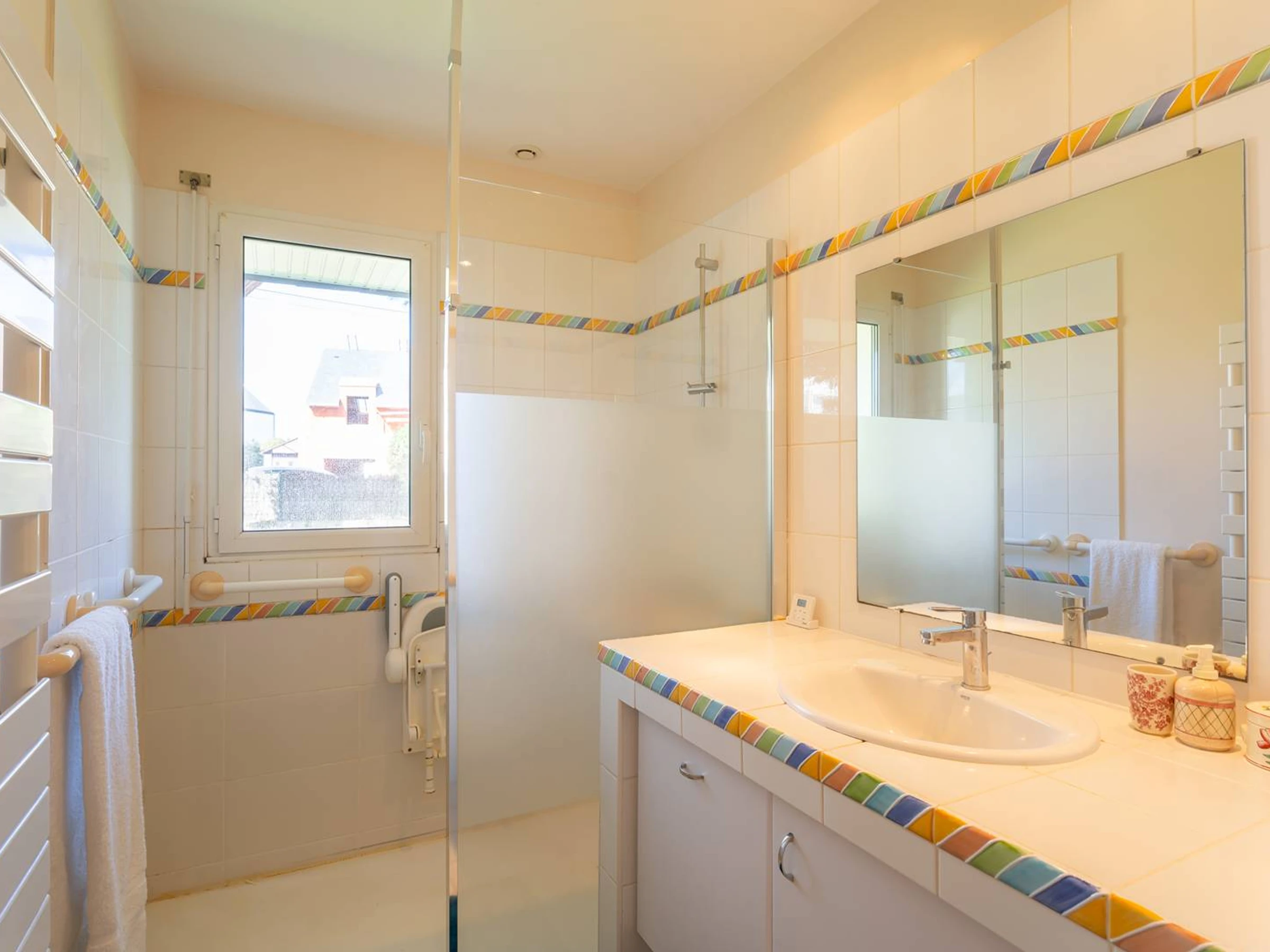 - 1 Badezimmer mit großer, ebenerdiger Dusche mit Duschsitz