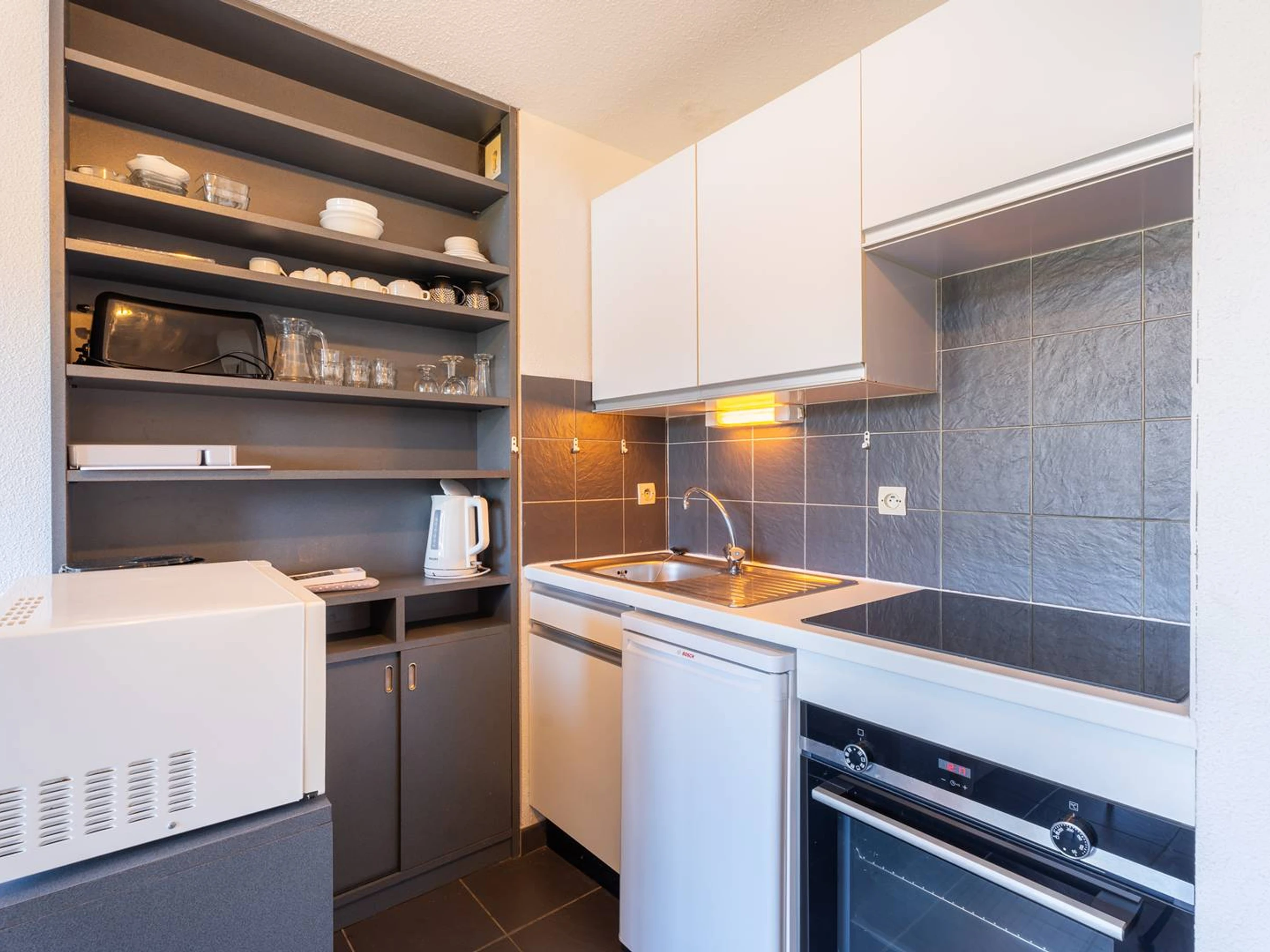 - Ausgestattete Küchenzeile (4-Platten-Cerankochfeld, Backofen, Kühlschrank, Mikrowelle)