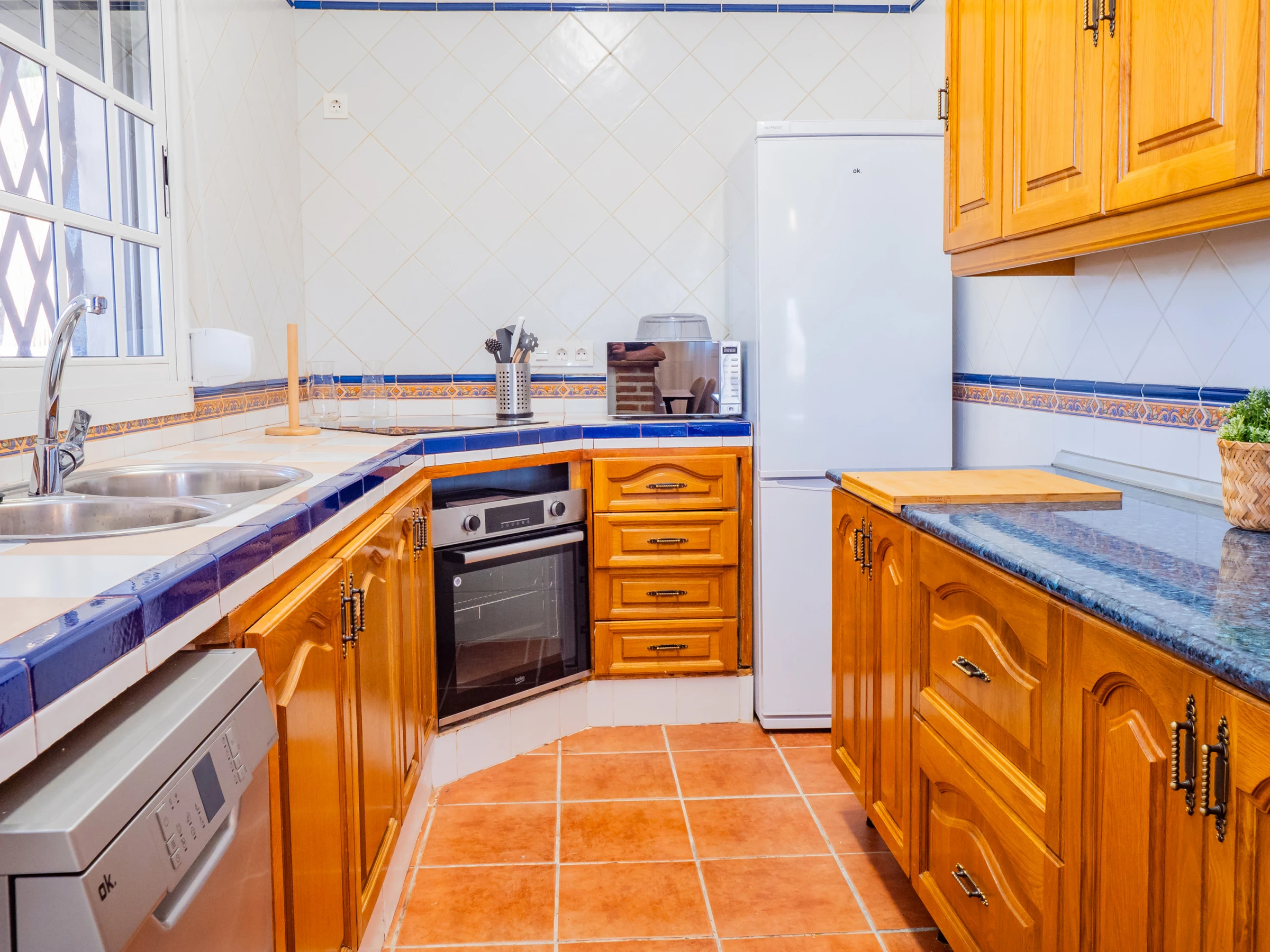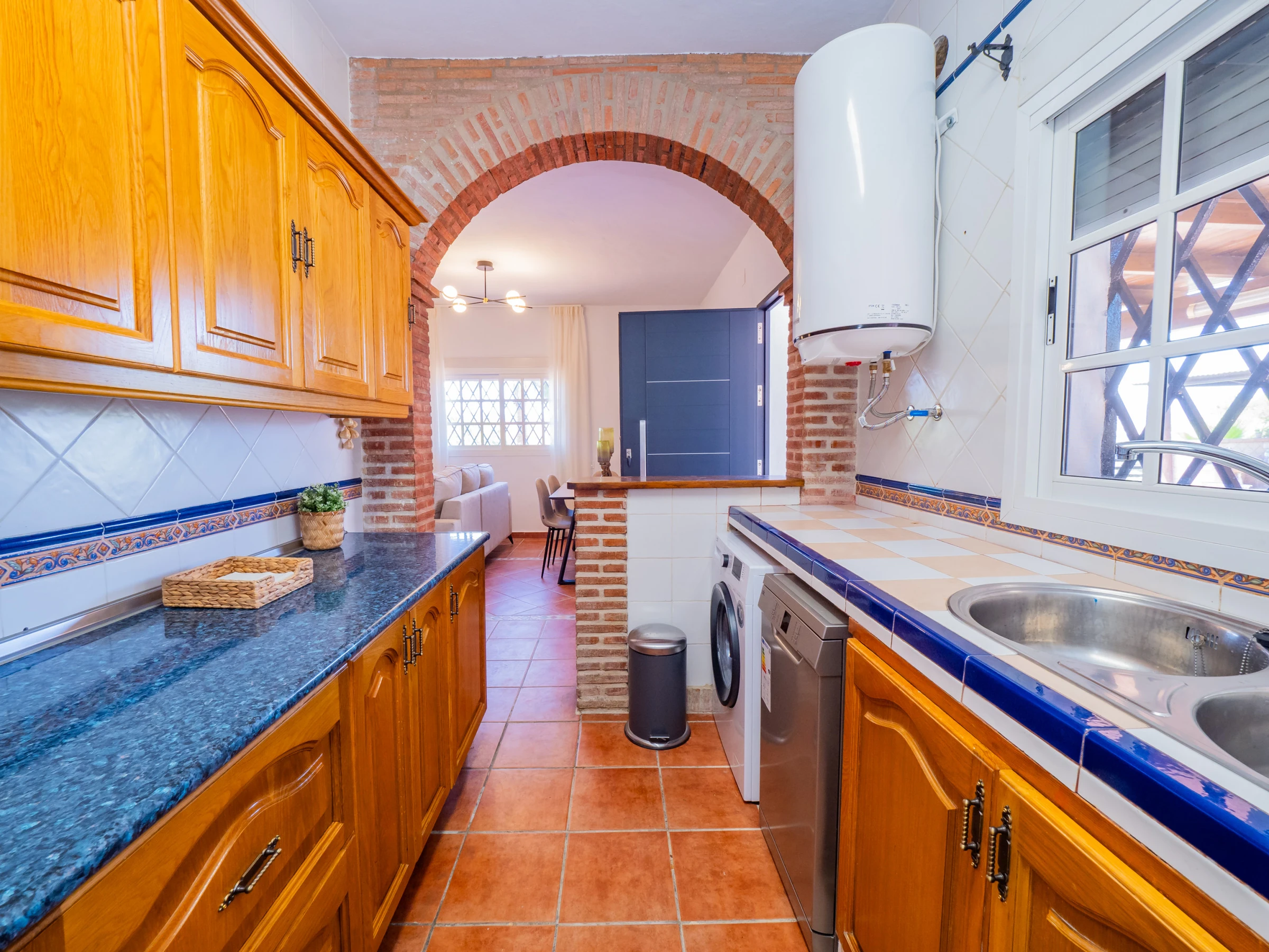Der Innenbereich bietet ein geräumiges und helles Wohn-Esszimmer, perfekt für Familientreffen, mit Kamin für kalte Jahreszeiten und Fernseher zur Unterhaltung. Die angrenzende Küche ist komplett ausgestattet mit modernen Haushaltsgeräten wie Kühlschrank, Mikrowelle, Backofen, Geschirrspüler, Kaffeemaschine, Toaster und mehr, zusätzlich zu einem vollständigen Küchengeschirr und einem Harz-Tisch, ideal für den Außenbereich oder für Kinder.
