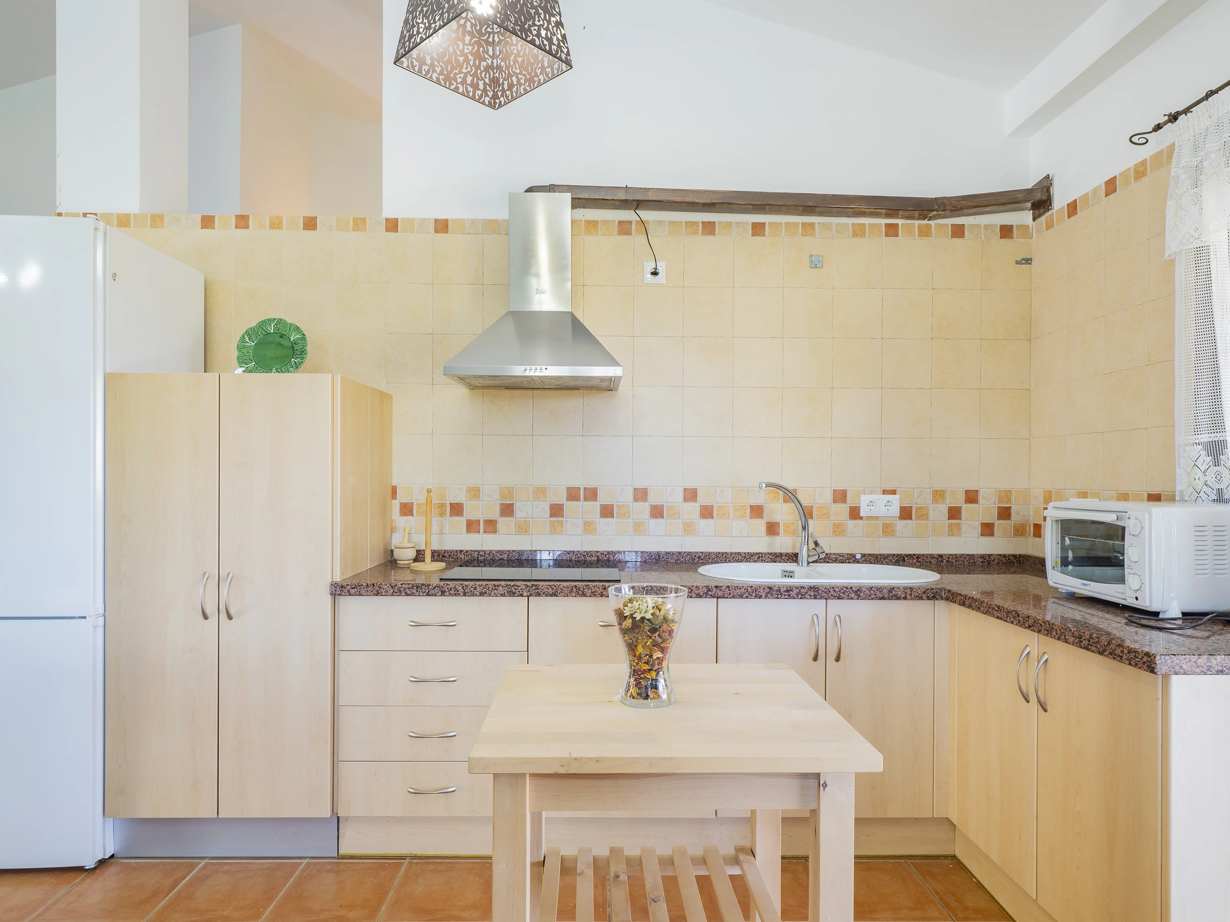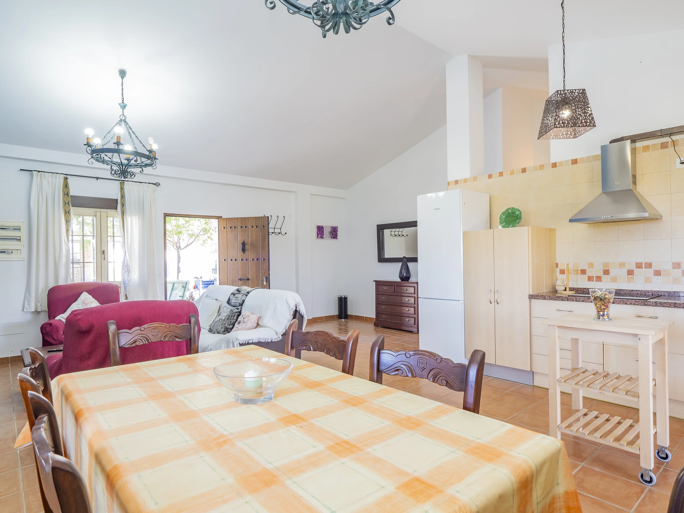Im Inneren finden Sie einen geräumigen Essbereich mit einer voll ausgestatteten amerikanischen Küche: Glaskeramikkochfeld, Kühlschrank, Mikrowelle, Gefrierschrank, Kaffeemaschine, Toaster, Wasserkocher und Entsafter. Diese Aufteilung ermöglicht es der Familie, bequem zusammenzuleben, sei es beim Fernsehen oder beim gemeinsamen Genießen von Mahlzeiten. 📺🍽️