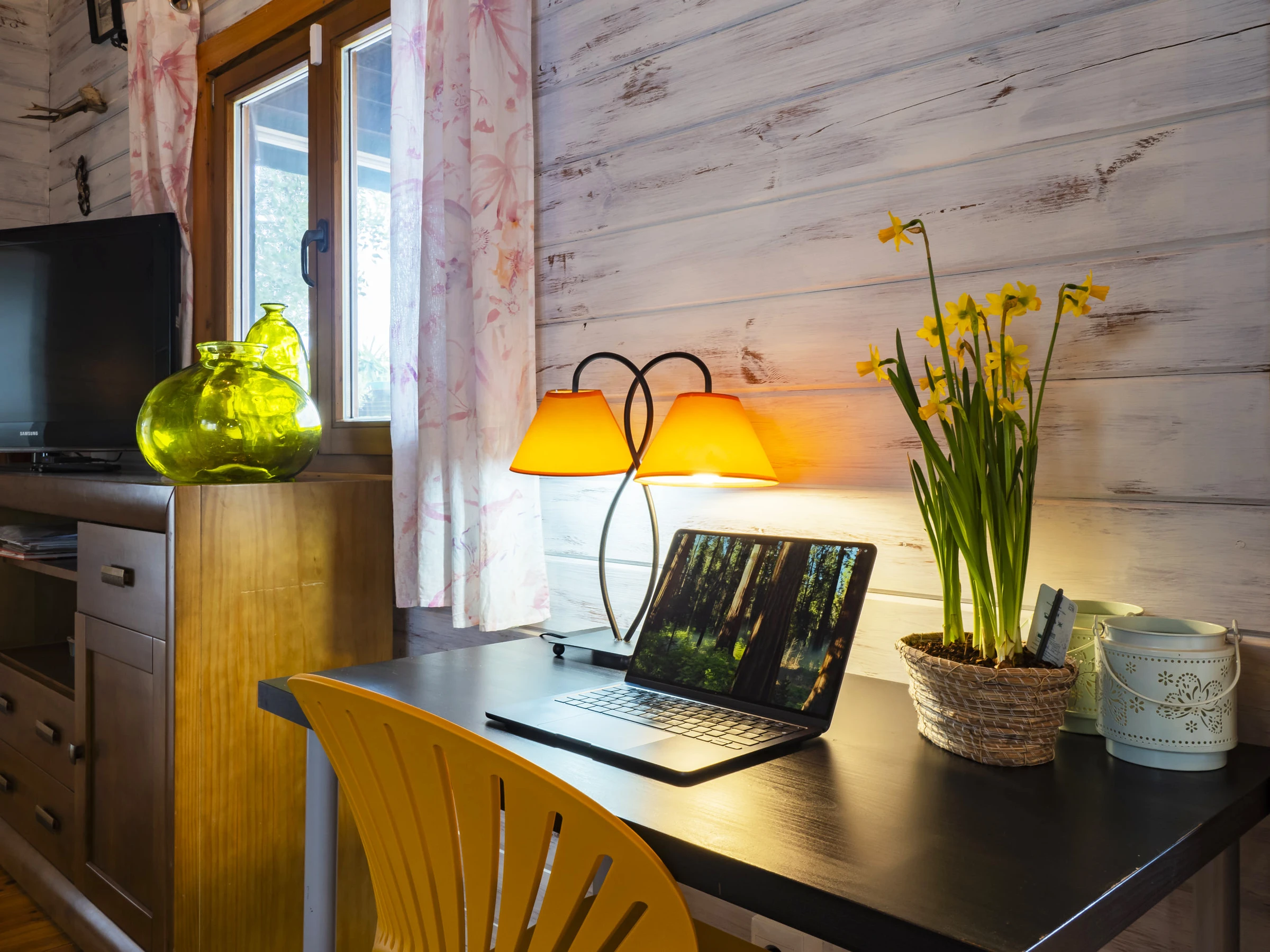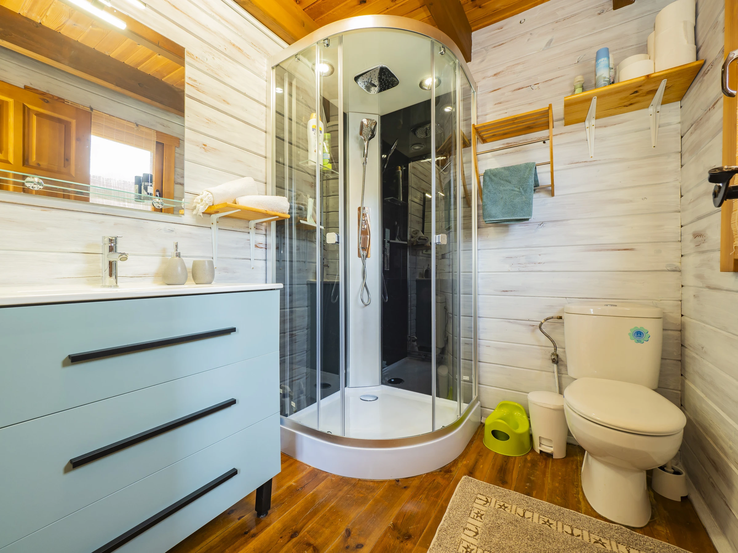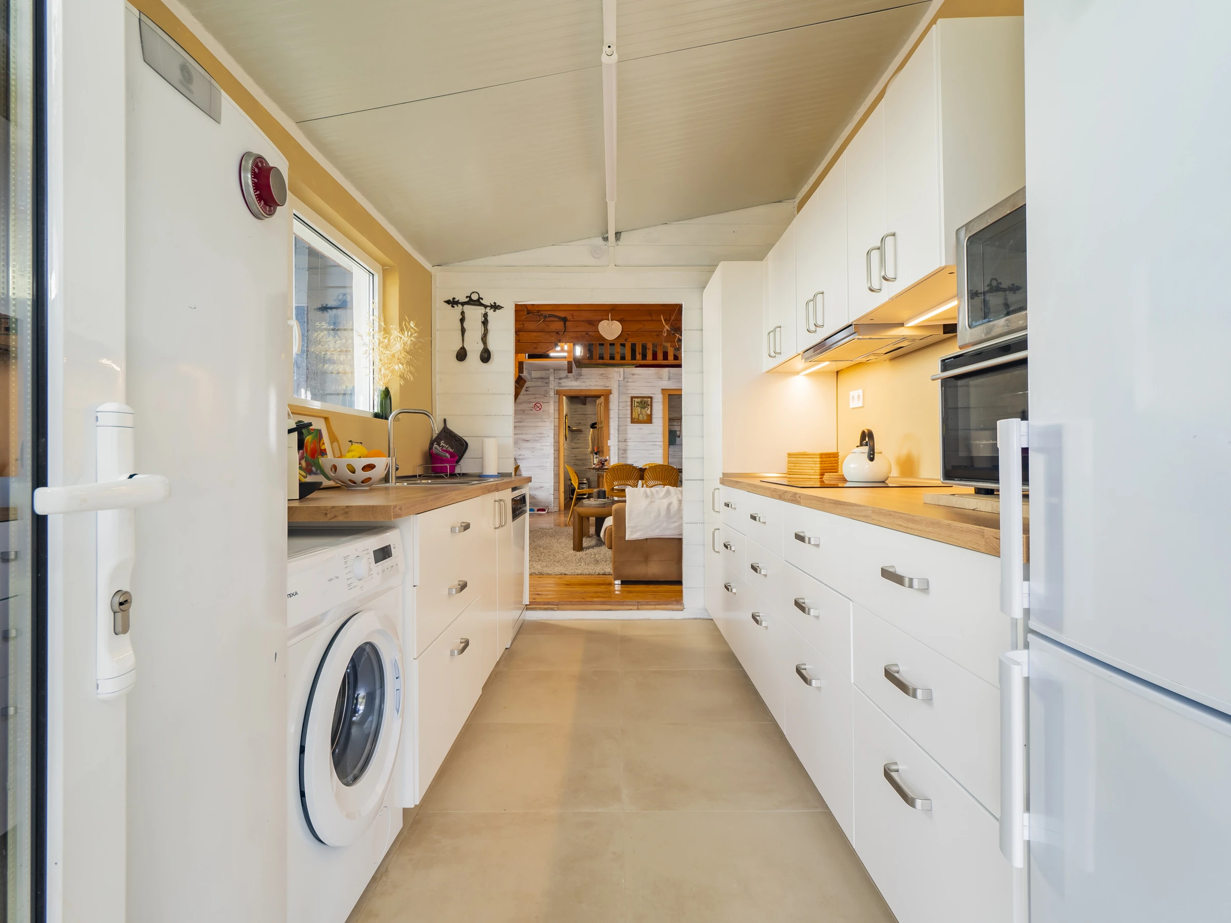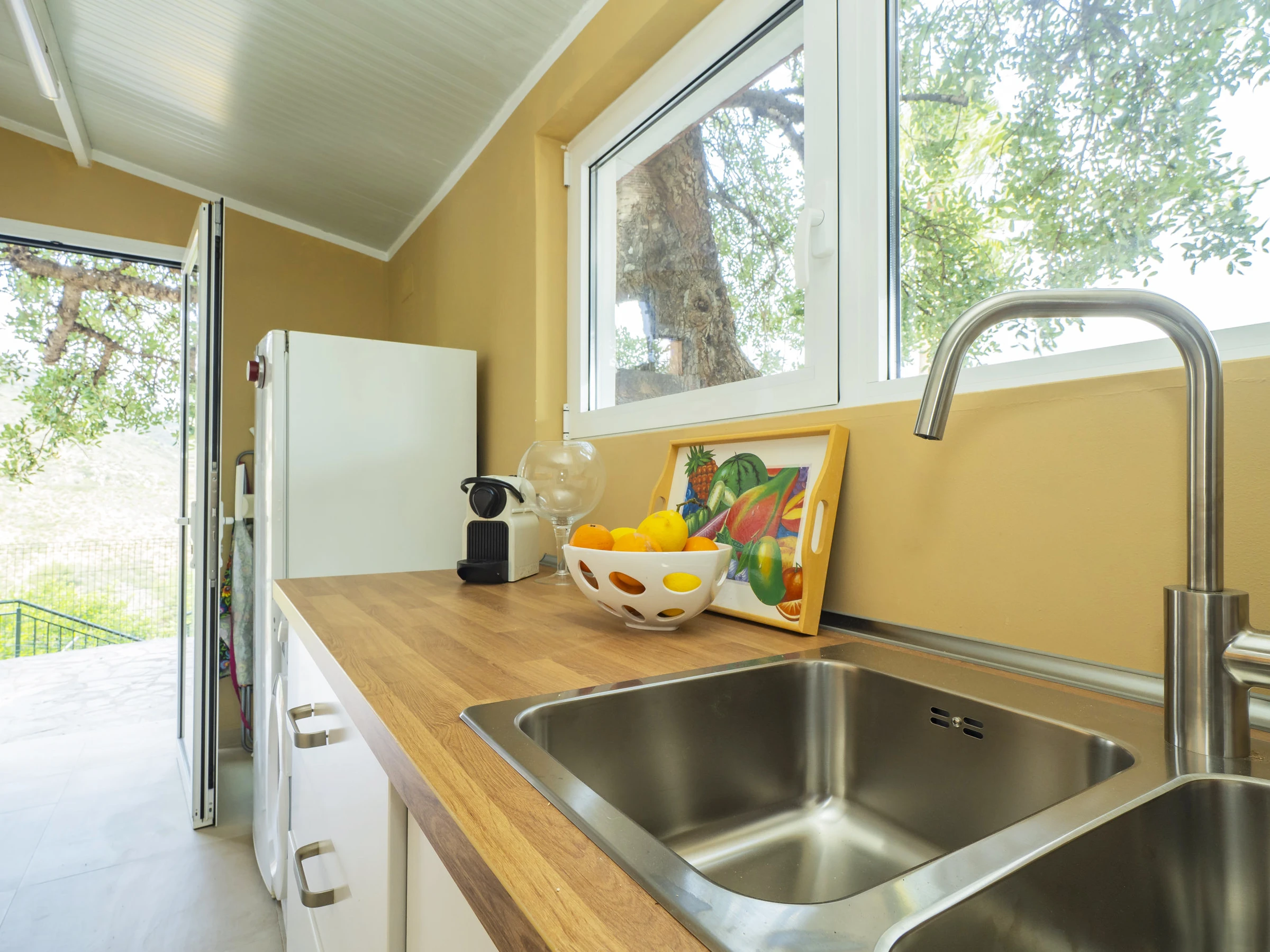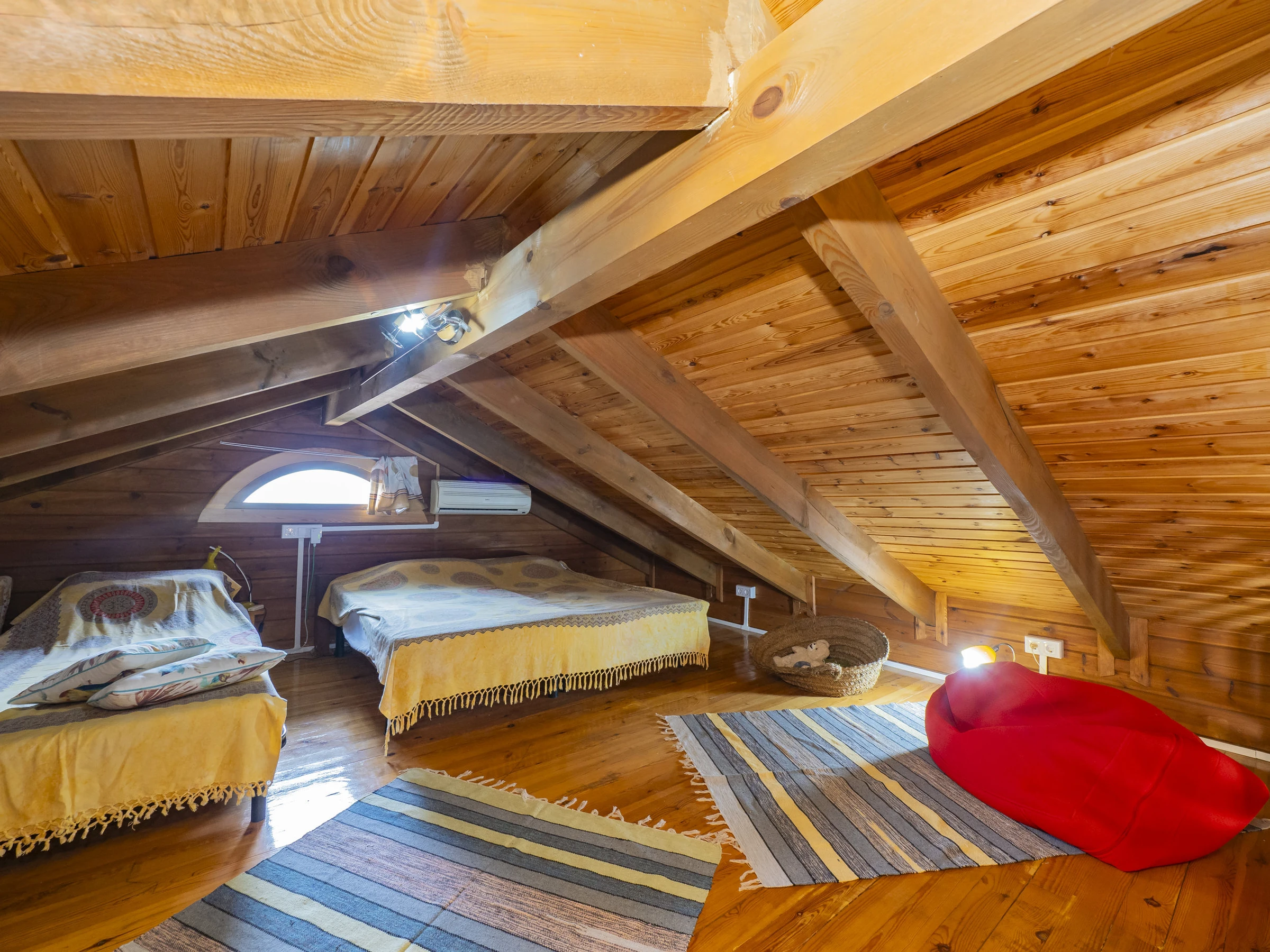 In ihren 80 m² verteilt auf zwei Etagen verfügt das Haus über drei Schlafzimmer für bis zu sechs Personen (obwohl die offizielle Kapazität für fünf Personen liegt), mit einem Doppelbett und einem Einzelbett in der oberen, dachgeschossartigen Etage, ideal für Kinder und Jugendliche, und zwei Schlafzimmern mit Doppelbett in der unteren Etage, neben einem geräumigen Wohn-Esszimmer und einer voll ausgestatteten Küche mit modernen Haushaltsgeräten (Kühlschrank, Mikrowelle, Ofen, Geschirrspüler, Kaffeemaschine, Toaster und mehr). Die feste Holztreppe, die zur oberen Etage führt, ist aufgrund ihrer Neigung nicht für sehr kleine Kinder geeignet.