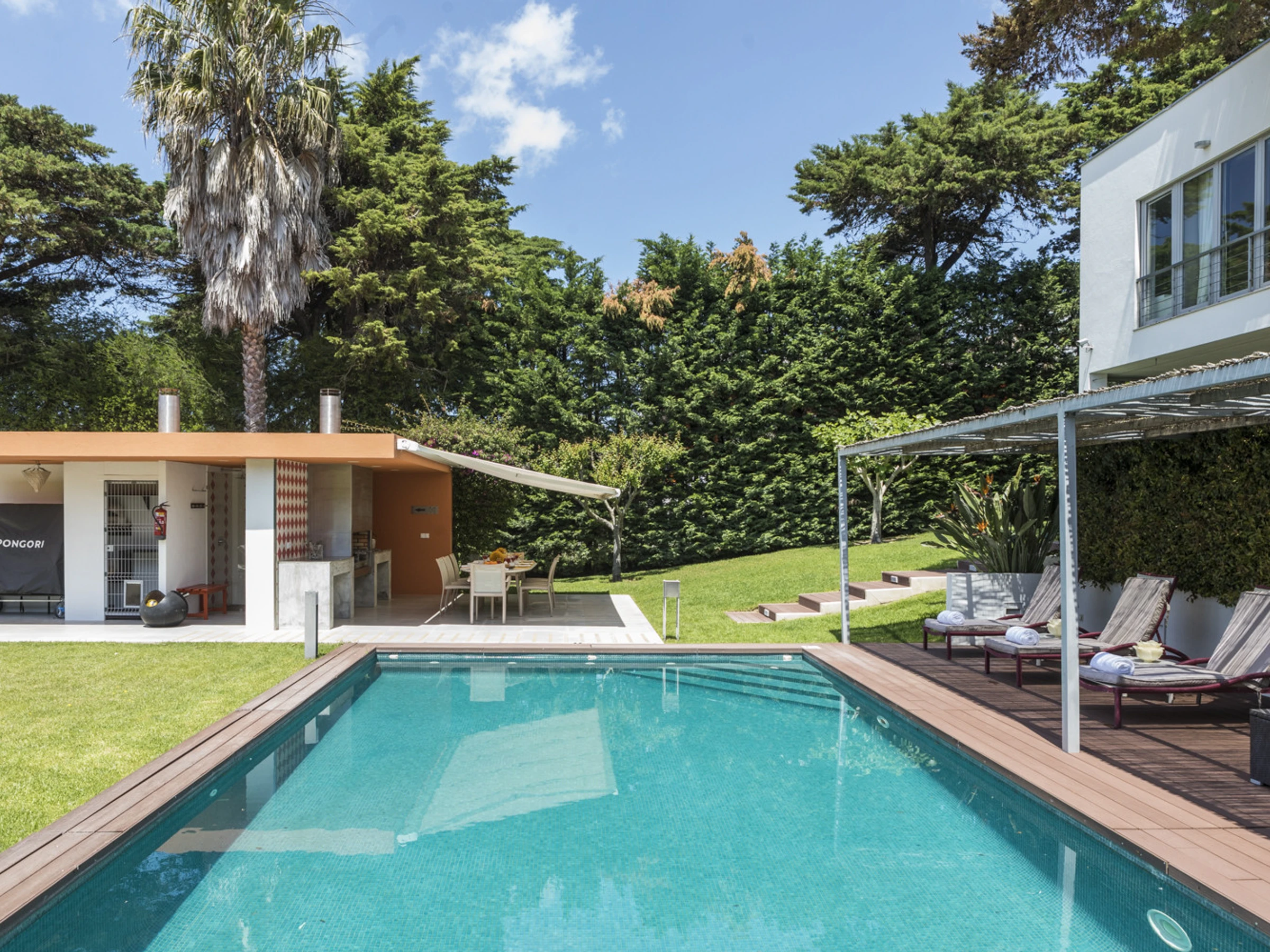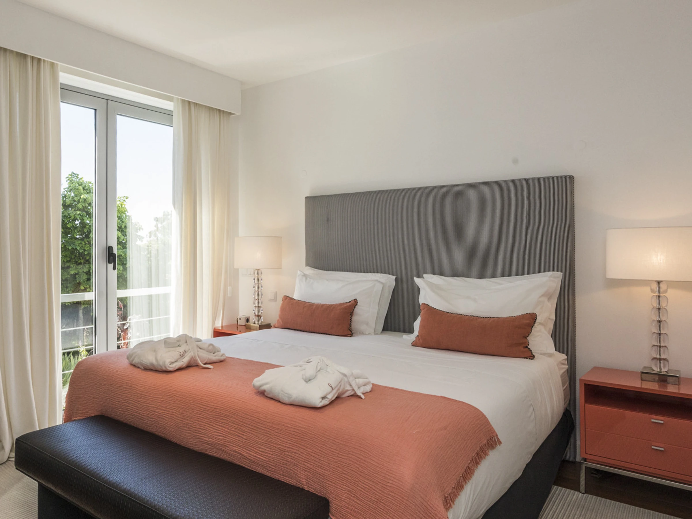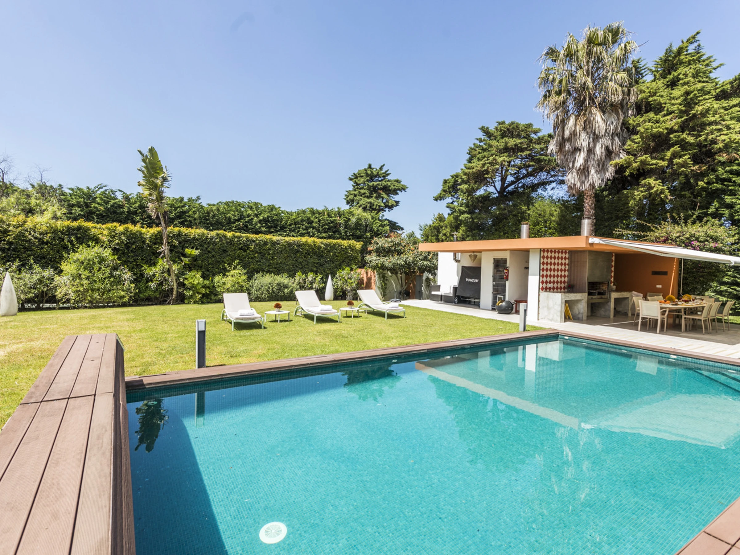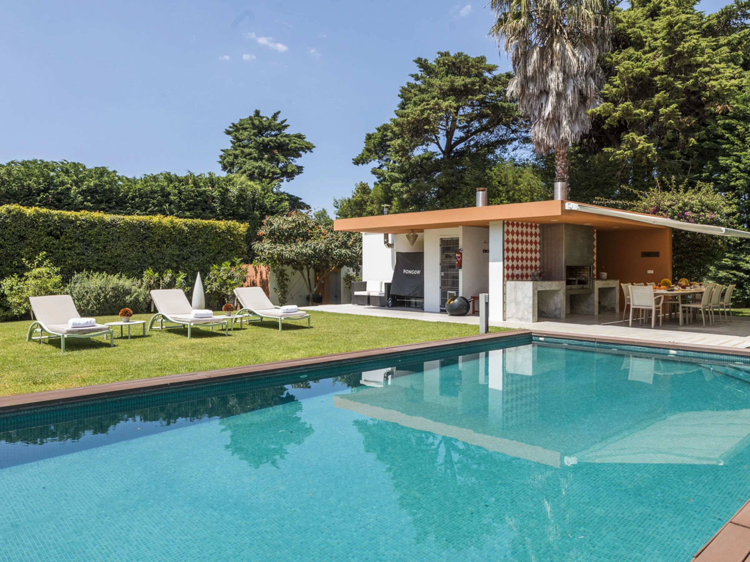 Das Cascais Orangery begrüßt bis zu dreizehn Gäste in vier gut gestalteten Schlafzimmern, darunter ein verspielter Familienraum mit leuchtend roten Etagenbetten. Jeder Raum ist großzügig bemessen, wobei viele auf private Terrassen hinausführen und einige ruhige Schreibtischbereiche bieten, ideal zum Lesen, Schreiben oder Abschalten. Alle Schlafzimmer verfügen über eigene Badezimmer, die jeweils einen eigenen Charakter haben, manche minimalistisch, andere mit einer Prise Persönlichkeit, wie eine limettegrüne freistehende Badewanne. Im Zentrum des Hauses wird der offene Wohnbereich von Bodentief-Glasfronten gerahmt, die den Raum mit natürlichem Licht füllen und den Garten hereinbringen. Ein skulpturaler, metallverkleideter Kamin verankert den Raum, umgeben von einem großen L-förmigen Sofa, das sowohl Komfort als auch Gesprächigkeit bietet. Ein Flügel verleiht eine dezente Note von Charme, bereit für spontane Momente. Der Übergang zwischen Ess- und Loungebereich ist entspannt und mühelos, abgerundet mit polierten Holzböden, üppiger Samtpolsterung in Branntorangen und tiefen Rottönen sowie kuratierter moderner Kunstwerke. Tägliche Haushaltsführung wird von 8.30 Uhr bis 16.30 Uhr angeboten, wobei die Villa mit ruhiger Effizienz gepflegt wird. Während der Wäschebereich dem Personal vorbehalten ist, können persönliche Kleidungsstücke auf Anfrage betreut werden, und ein Bügeleisen mit Bügelbrett steht zur Verfügung. Ob man sich mit Freunden trifft, einen Familienurlaub plant oder am Meer remote arbeitet, die Villa ist darauf ausgelegt, sich ruhig, wunderschön und mühelos anzupassen.