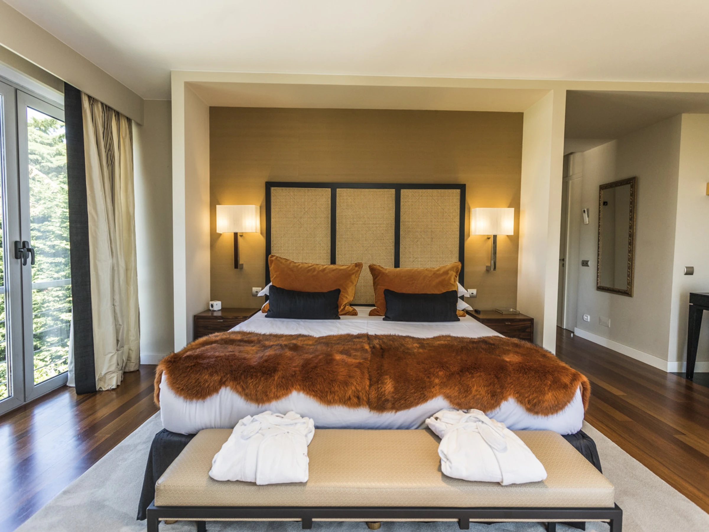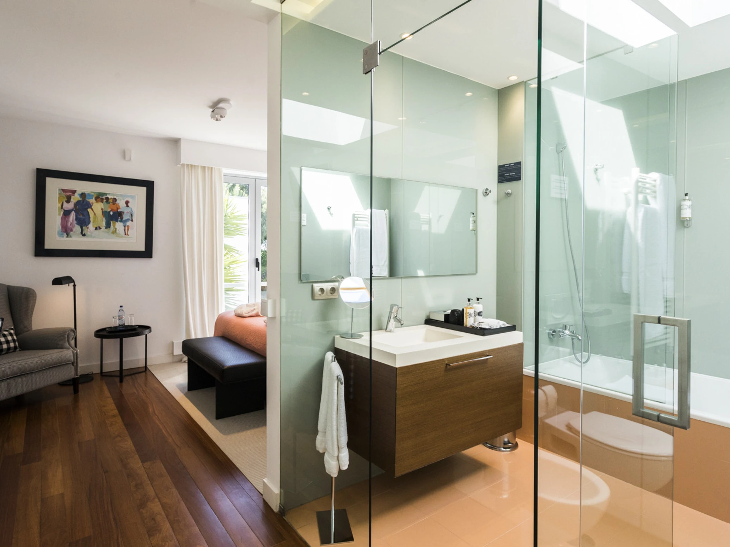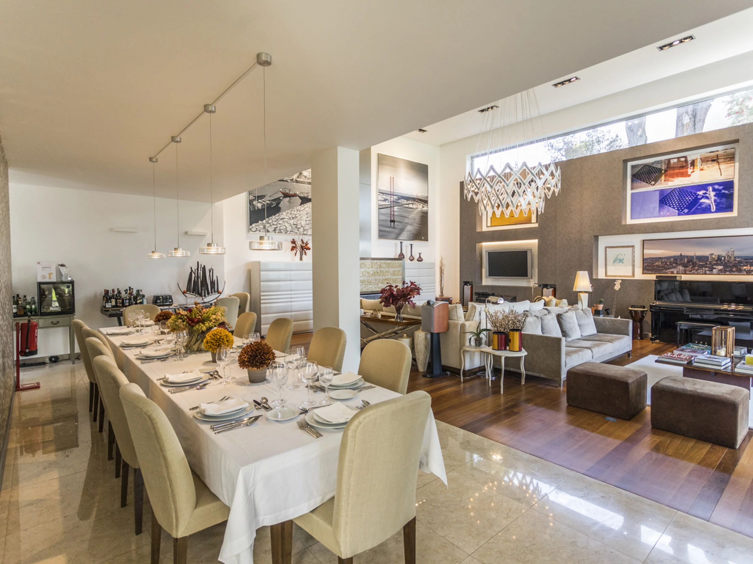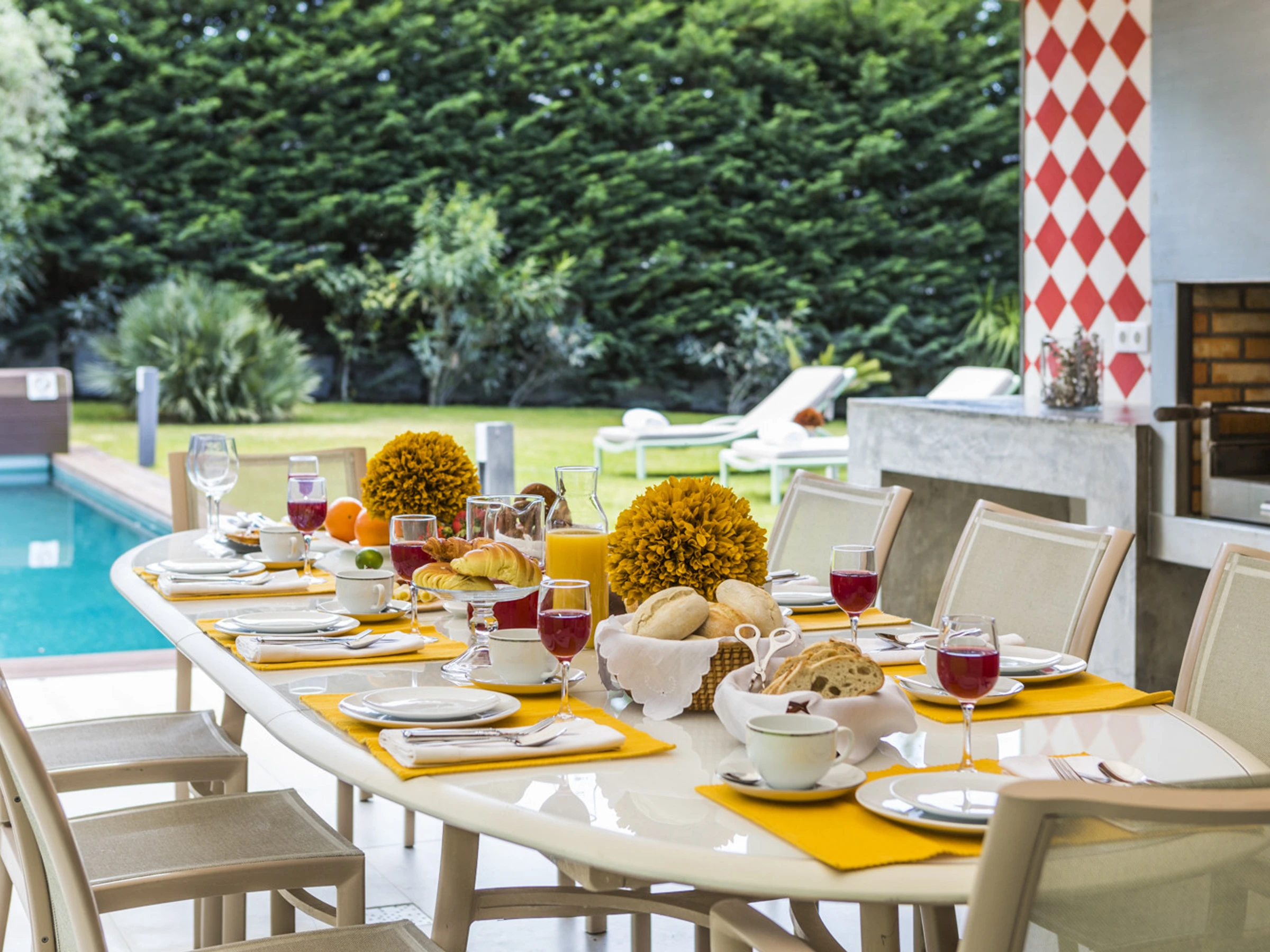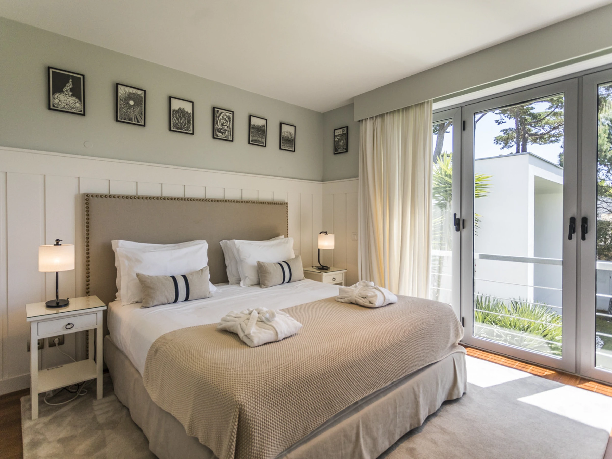 Das Cascais Orangery begrüßt bis zu dreizehn Gäste in vier gut gestalteten Schlafzimmern, darunter ein verspielter Familienraum mit leuchtend roten Etagenbetten. Jeder Raum ist großzügig bemessen, wobei viele auf private Terrassen hinausführen und einige ruhige Schreibtischbereiche bieten, ideal zum Lesen, Schreiben oder Abschalten. Alle Schlafzimmer verfügen über eigene Badezimmer, die jeweils einen eigenen Charakter haben, manche minimalistisch, andere mit einer Prise Persönlichkeit, wie eine limettegrüne freistehende Badewanne. Im Zentrum des Hauses wird der offene Wohnbereich von Bodentief-Glasfronten gerahmt, die den Raum mit natürlichem Licht füllen und den Garten hereinbringen. Ein skulpturaler, metallverkleideter Kamin verankert den Raum, umgeben von einem großen L-förmigen Sofa, das sowohl Komfort als auch Gesprächigkeit bietet. Ein Flügel verleiht eine dezente Note von Charme, bereit für spontane Momente. Der Übergang zwischen Ess- und Loungebereich ist entspannt und mühelos, abgerundet mit polierten Holzböden, üppiger Samtpolsterung in Branntorangen und tiefen Rottönen sowie kuratierter moderner Kunstwerke. Tägliche Haushaltsführung wird von 8.30 Uhr bis 16.30 Uhr angeboten, wobei die Villa mit ruhiger Effizienz gepflegt wird. Während der Wäschebereich dem Personal vorbehalten ist, können persönliche Kleidungsstücke auf Anfrage betreut werden, und ein Bügeleisen mit Bügelbrett steht zur Verfügung. Ob man sich mit Freunden trifft, einen Familienurlaub plant oder am Meer remote arbeitet, die Villa ist darauf ausgelegt, sich ruhig, wunderschön und mühelos anzupassen.