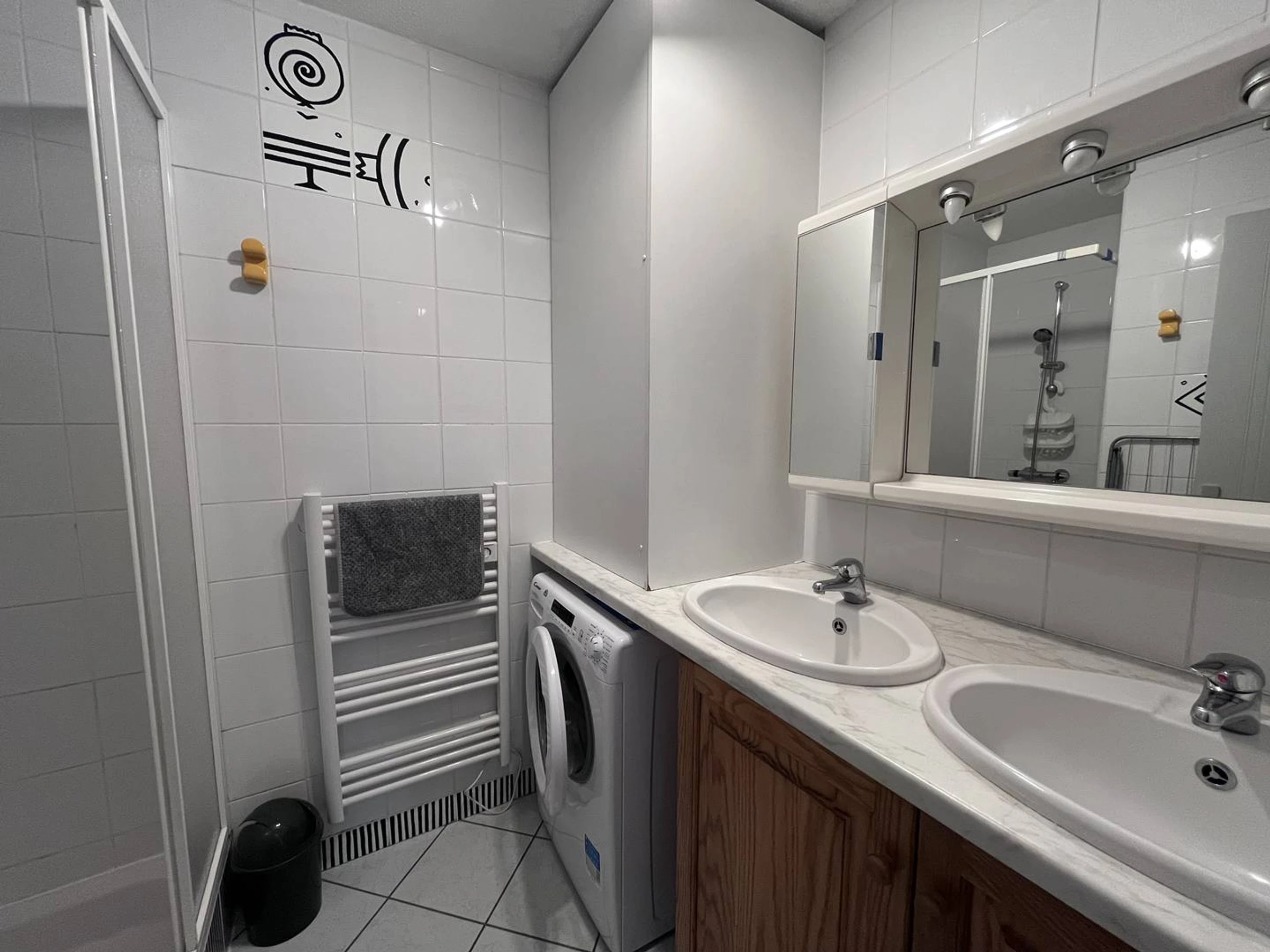 Ein Badezimmer mit Doppelwaschbecken und Dusche sowie ein separates WC sind ebenfalls vorhanden.