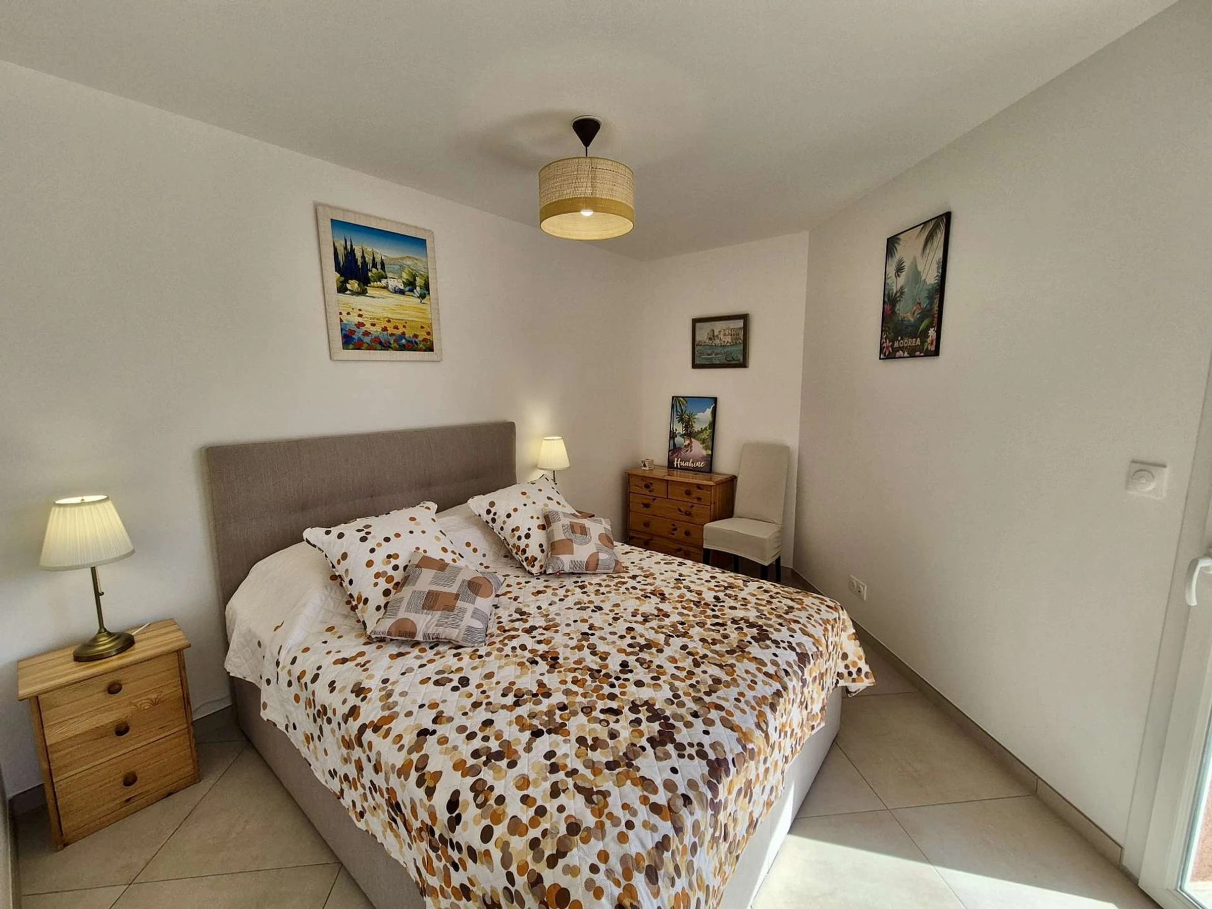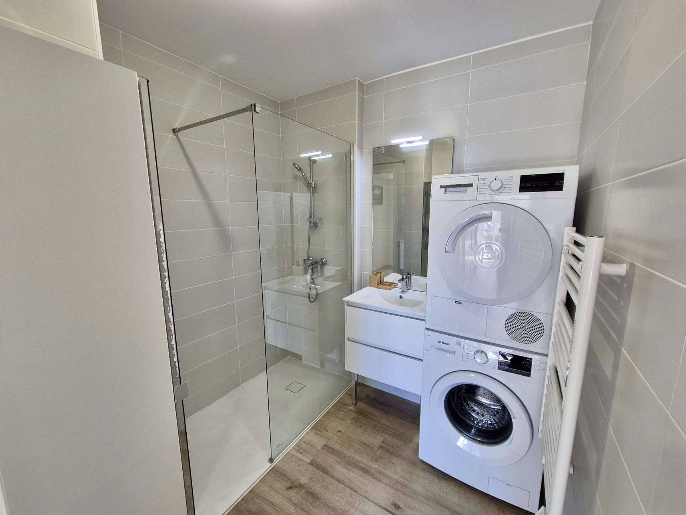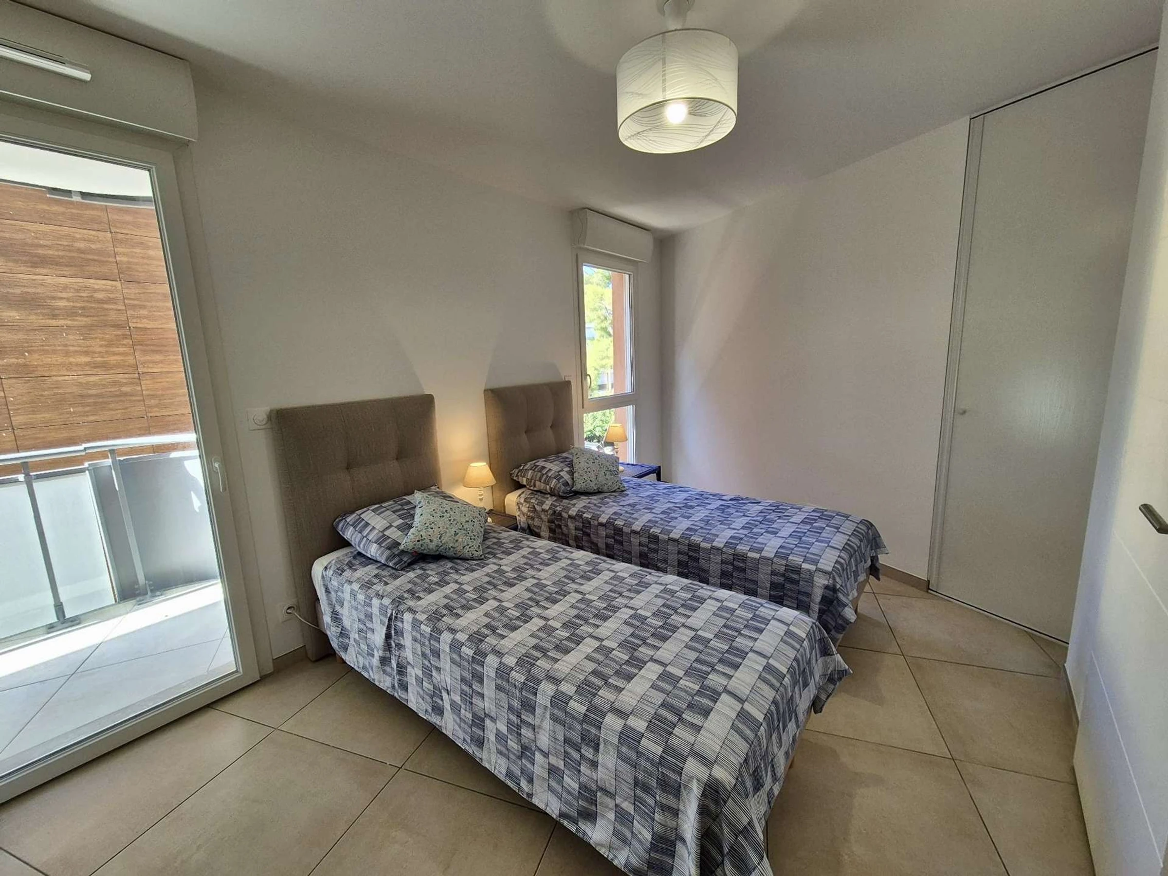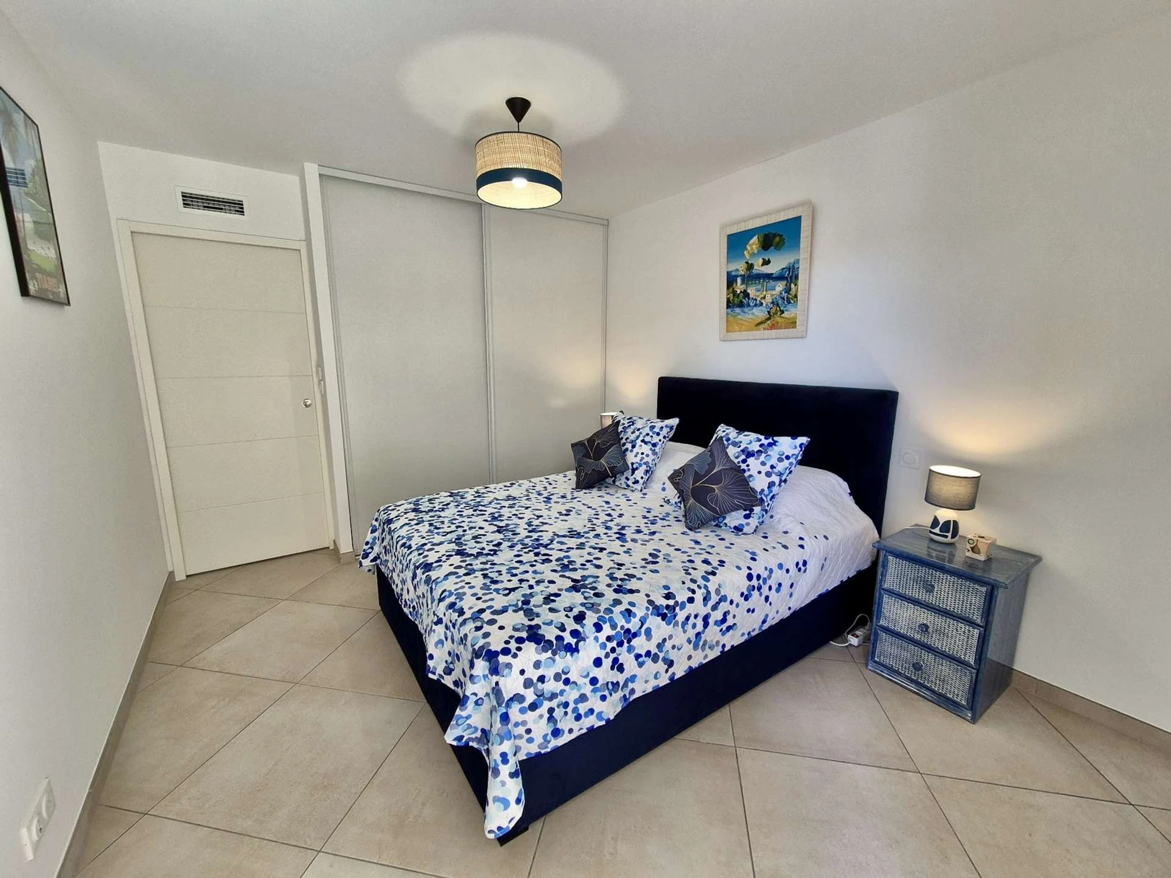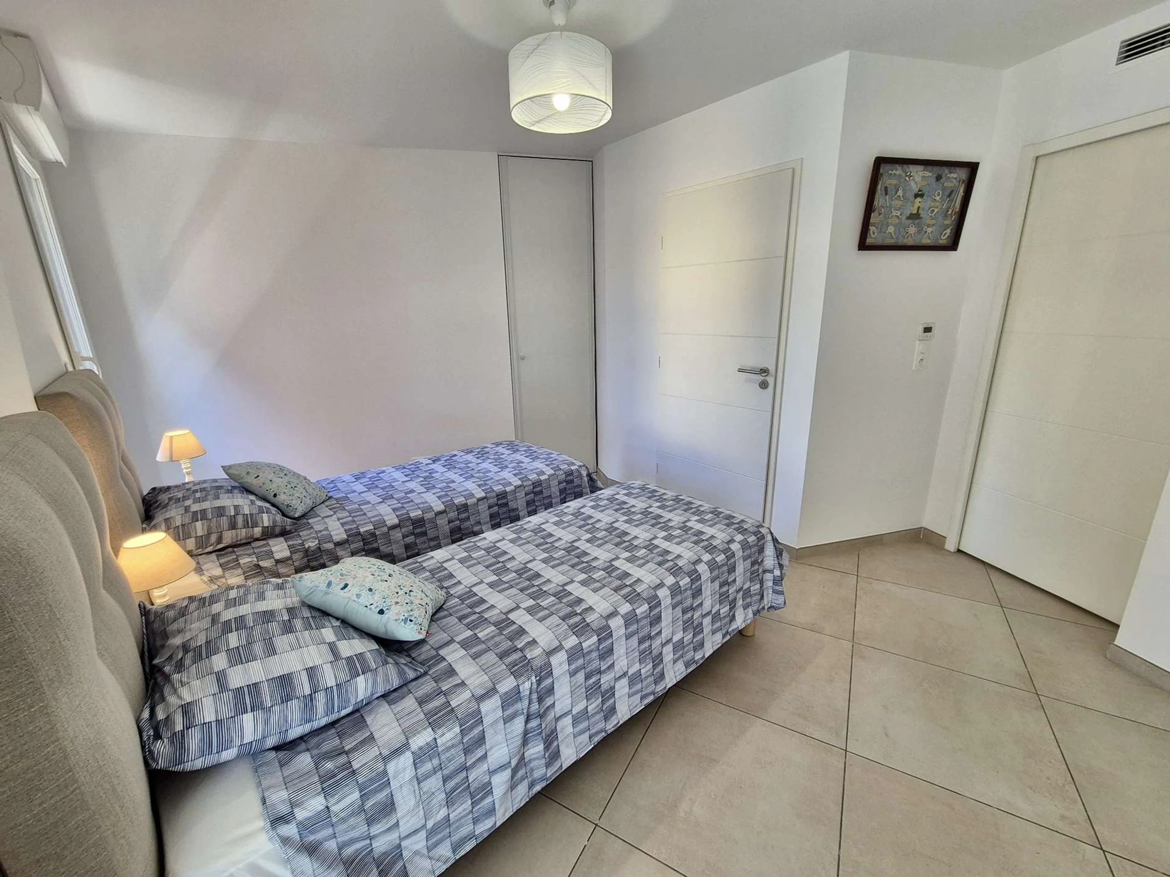 Das erste Schlafzimmer mit Zugang zur Terrasse ist mit einem 160 cm breiten Bett ausgestattet. Das zweite Schlafzimmer verfügt ebenfalls über ein 160 cm breites Bett. Im Flur teilen Sie sich ein Badezimmer mit Waschmaschine und Trockner. Das dritte Schlafzimmer verfügt über zwei 80 cm breite Betten und Zugang zu einem Badezimmer mit ebenerdiger Dusche.