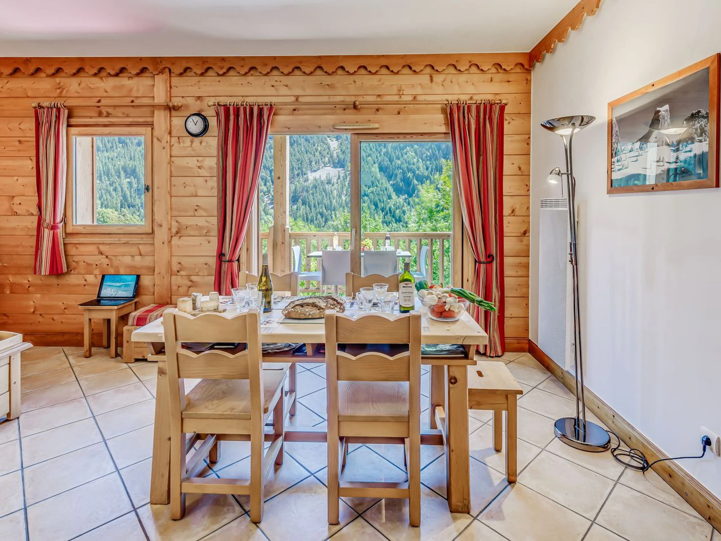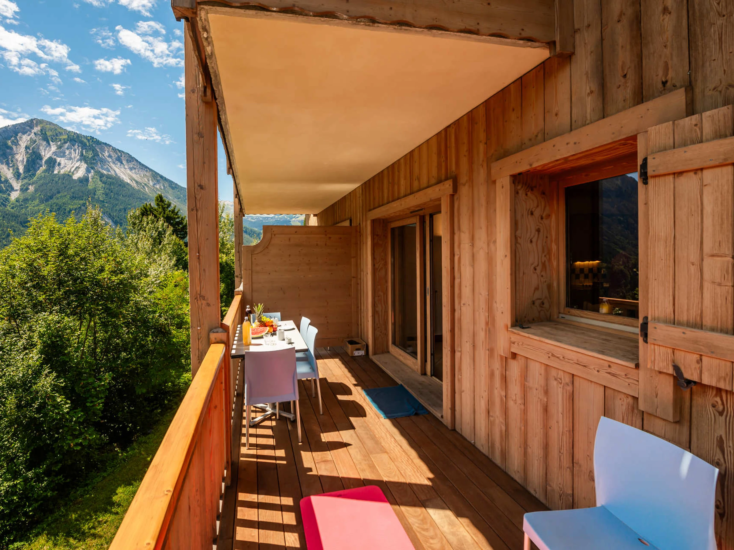 - 1 Südbalkon/Terrasse, Holzterrasse mit Tischen und Stühlen und Blick auf Vanoise und Courchevel