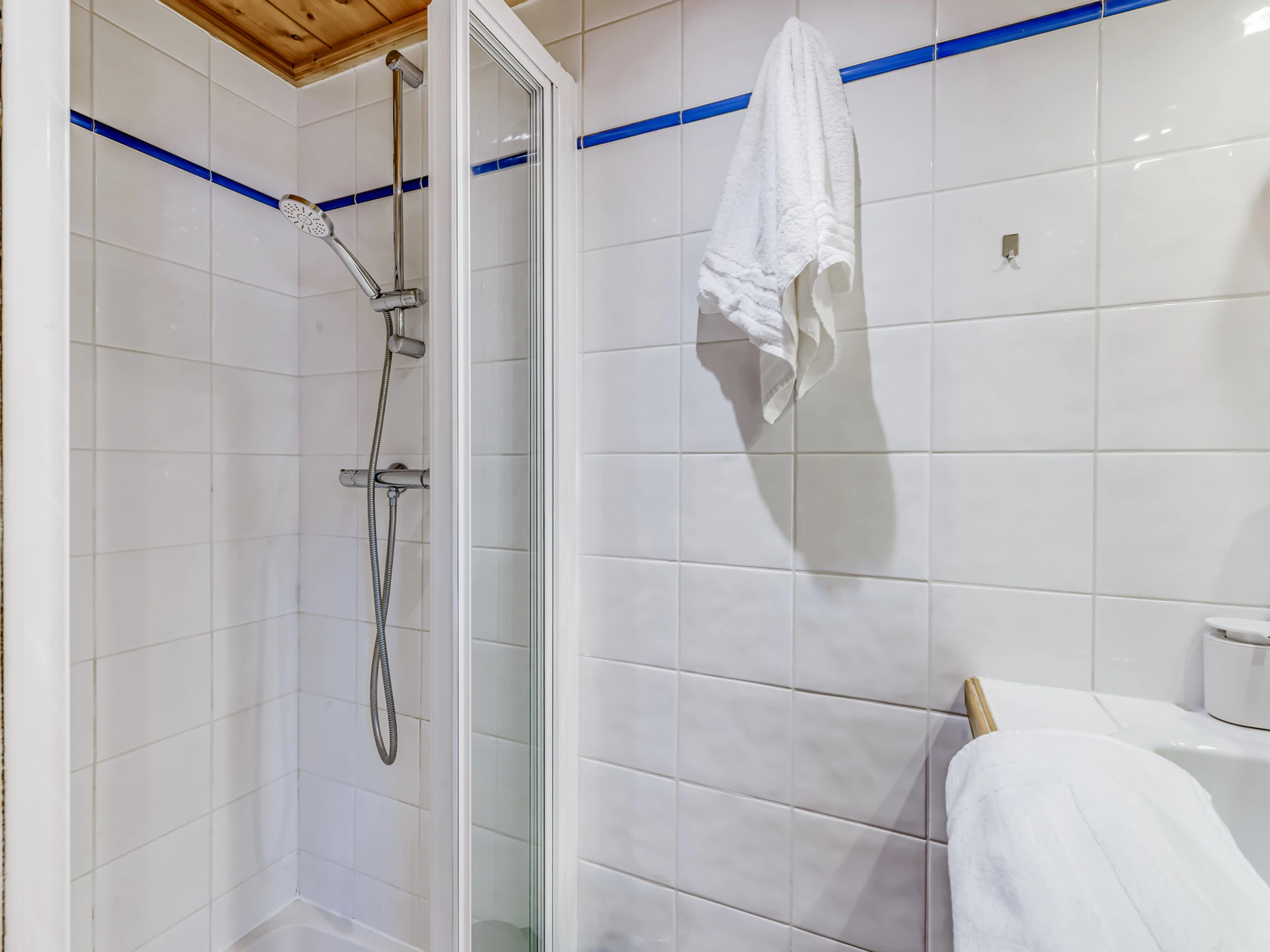 - 1 Badezimmer mit Badewanne, Dusche, Duschabtrennung, Waschtisch mit Stauraum, Handtuchheizkörper, Waschtrockner und Föhn