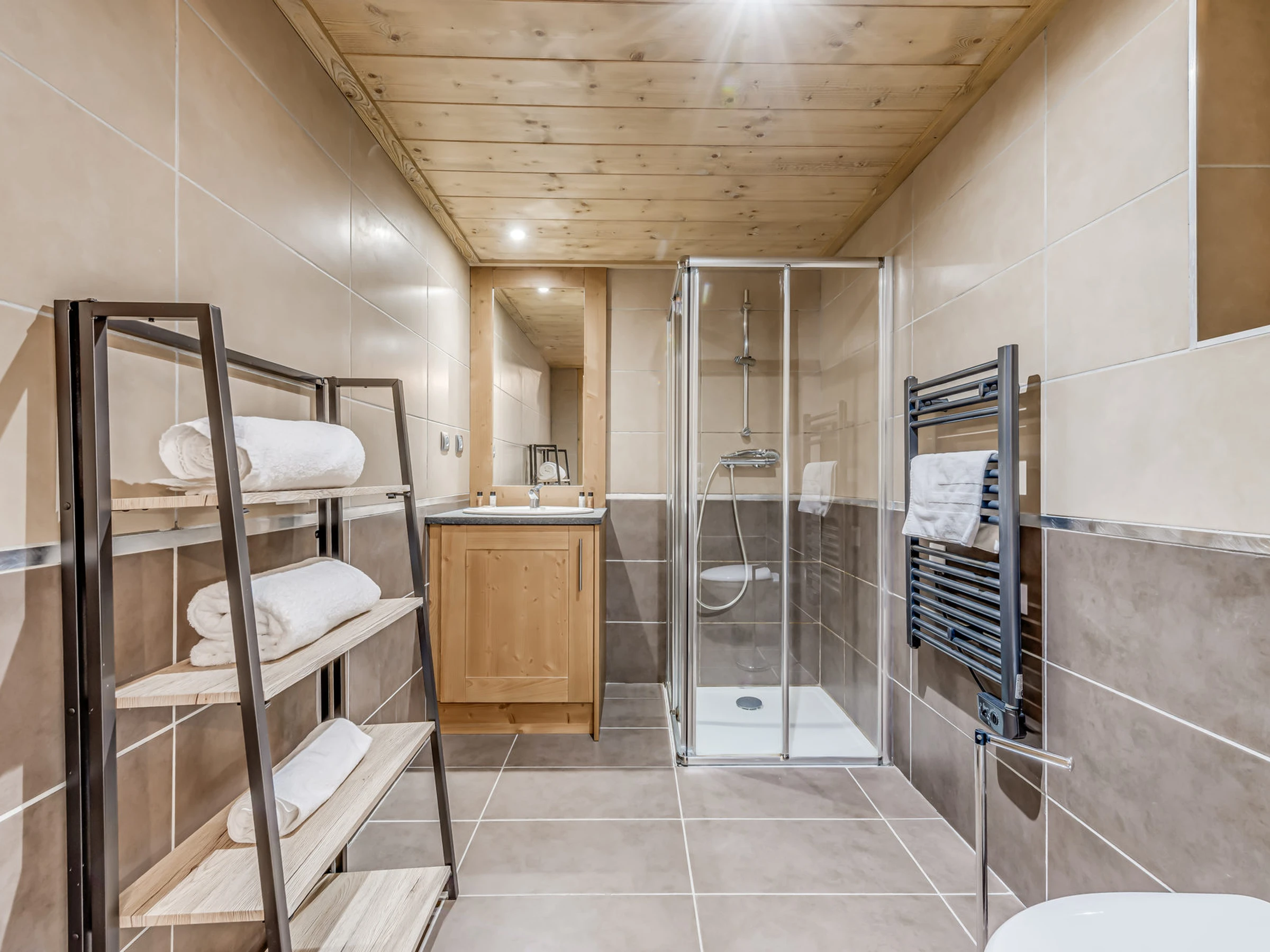 - 1 Badezimmer mit Dusche, Waschtisch, Handtuchheizkörper und WC