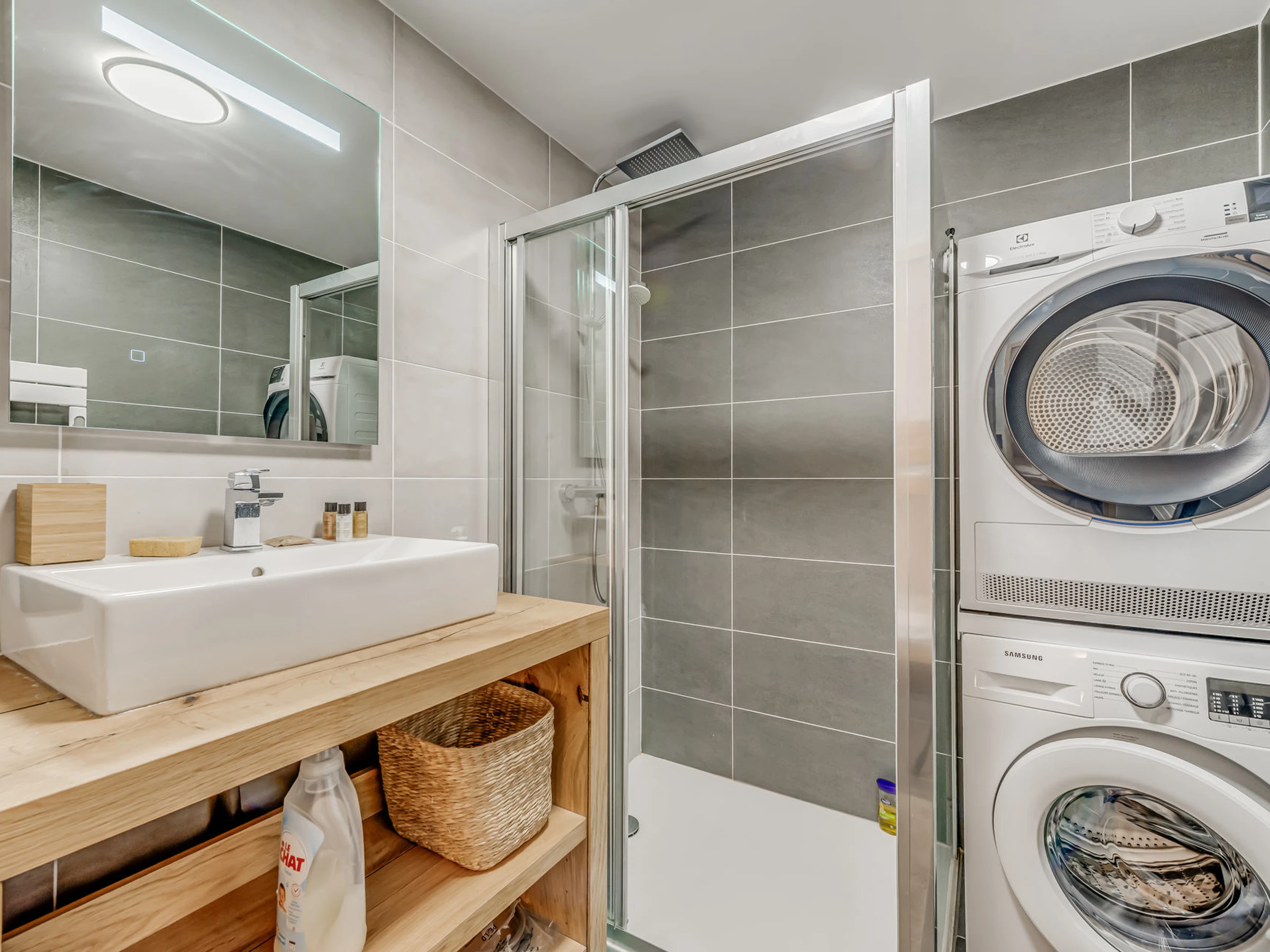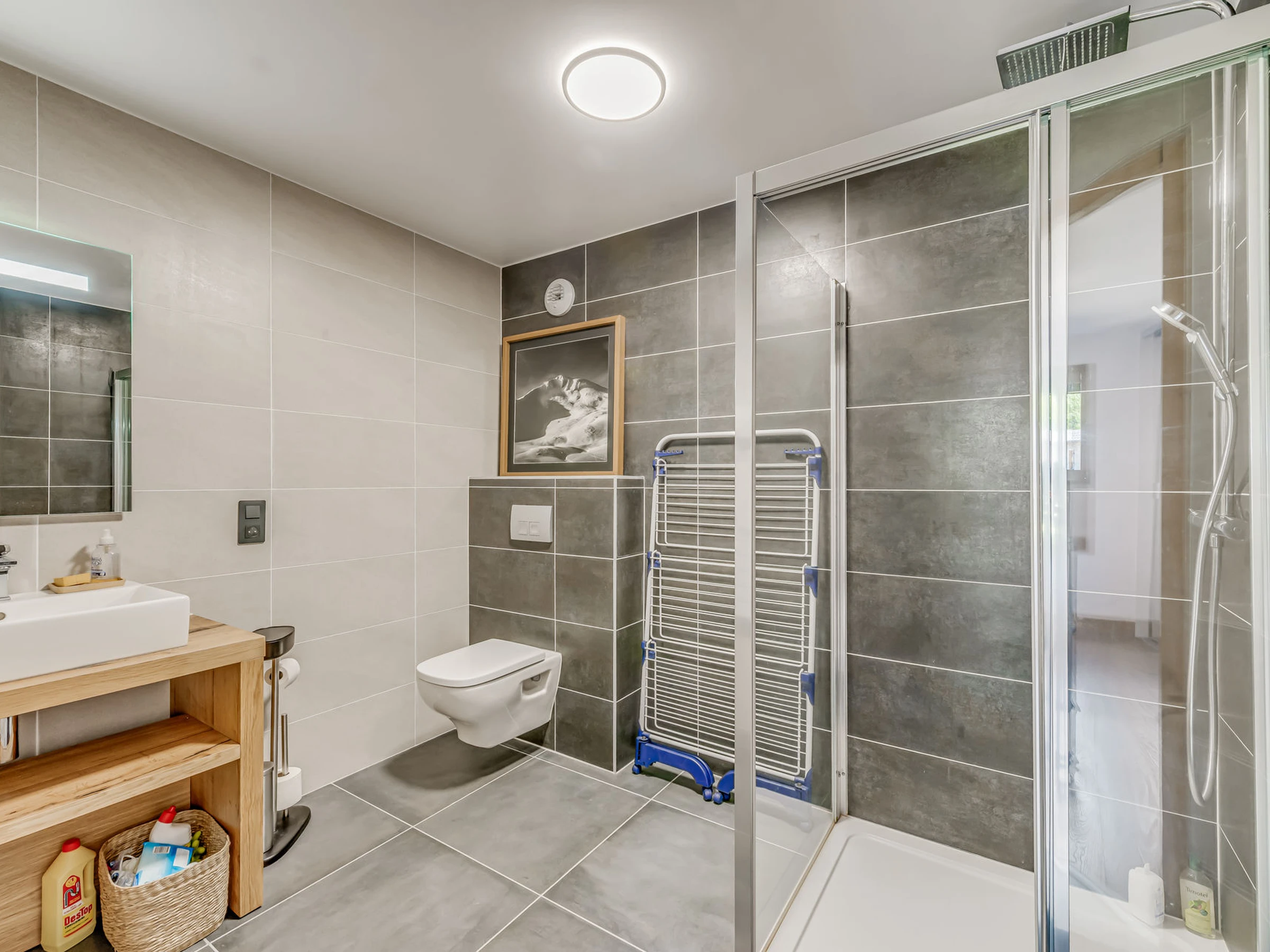 - 1 Badezimmer mit Dusche, Waschtisch und Handtuchheizkörper