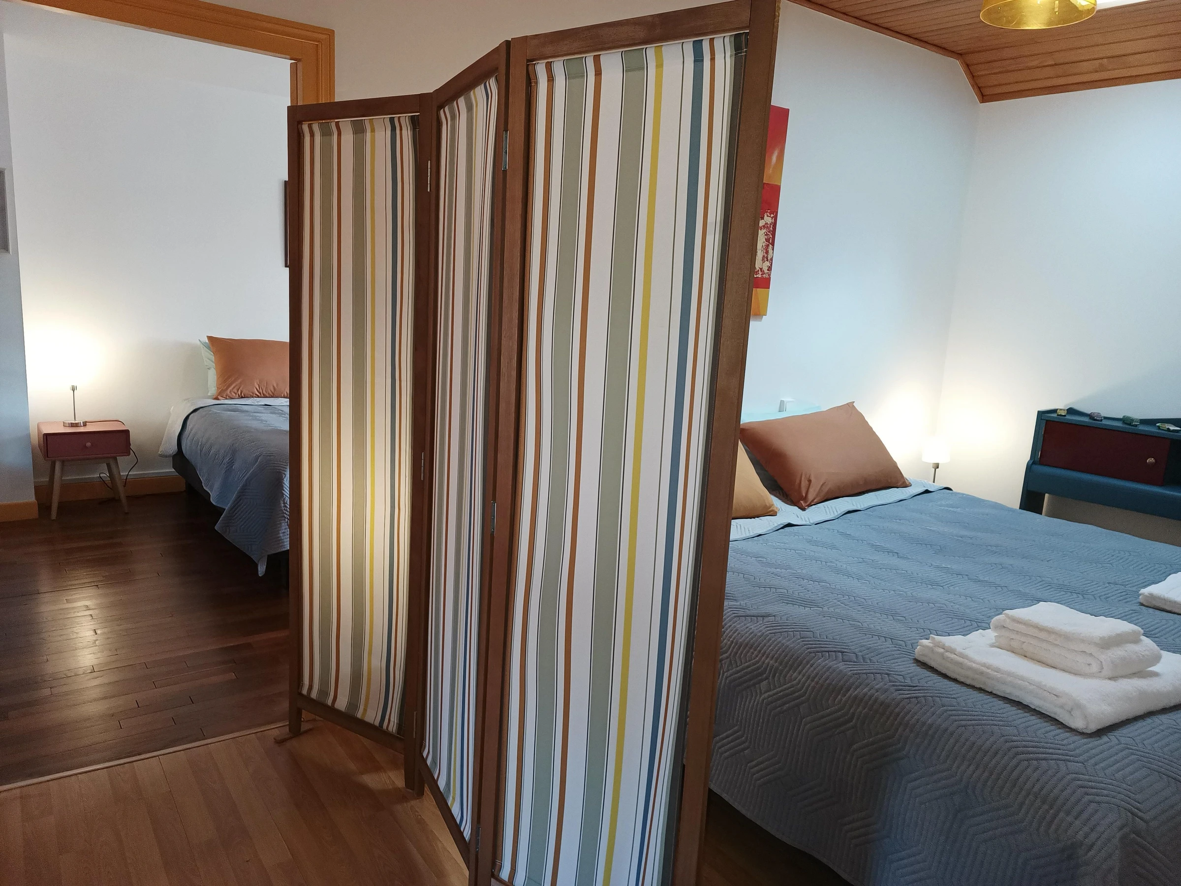 Im Obergeschoss befinden sich zwei große, miteinander verbundene Schlafzimmer (mit Paravent), jeweils mit einem Kingsize-Bett (180 x 200 cm) oder zwei Einzelbetten (90 x 200 cm) sowie einem Schreibtischbereich, ideal für die Arbeit im Homeoffice.