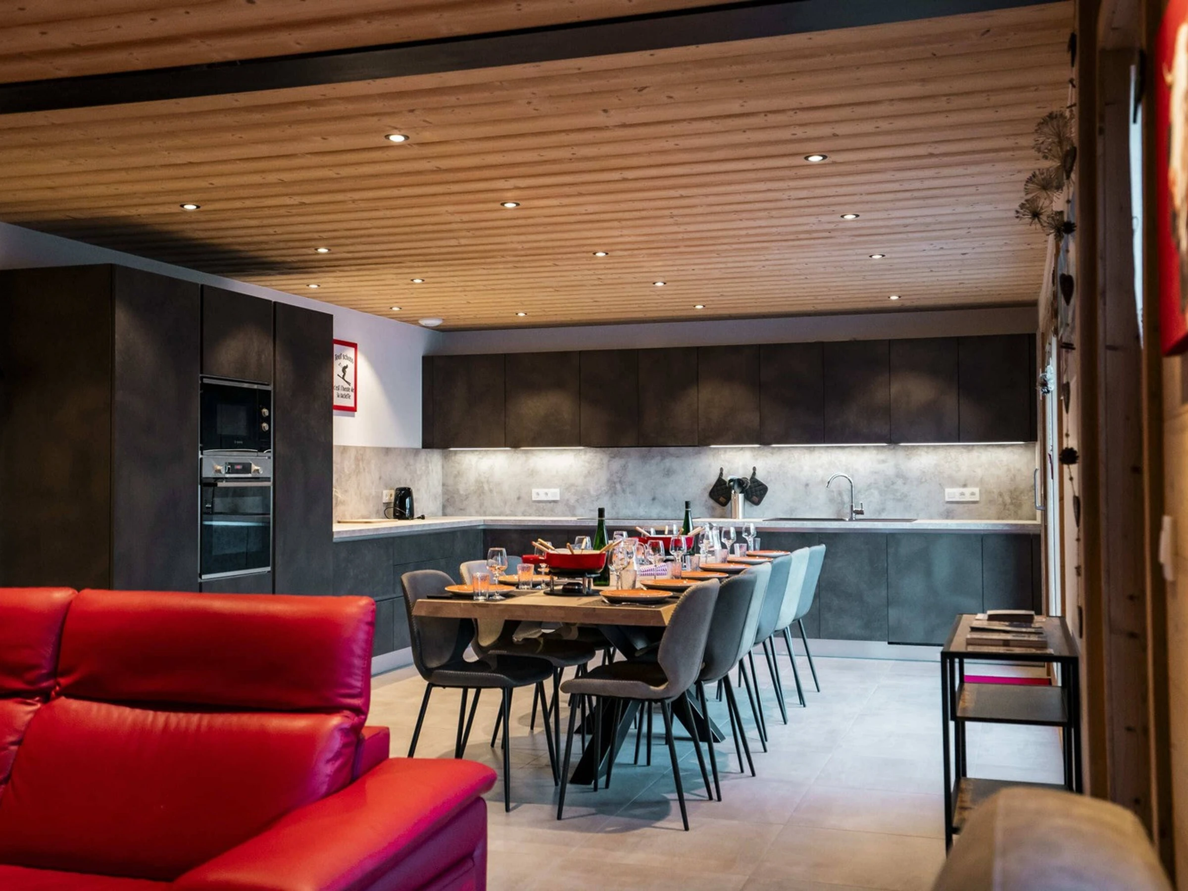 Offene Küche/Wohnzimmer, 2 Kühlschränke, Backofen, Induktionskochfeld, Mikrowelle, Geschirrspüler, Raclette-Grill, Fondue-Set, Wasserkocher, Toaster, 2 Filterkaffeemaschinen, Entsafter