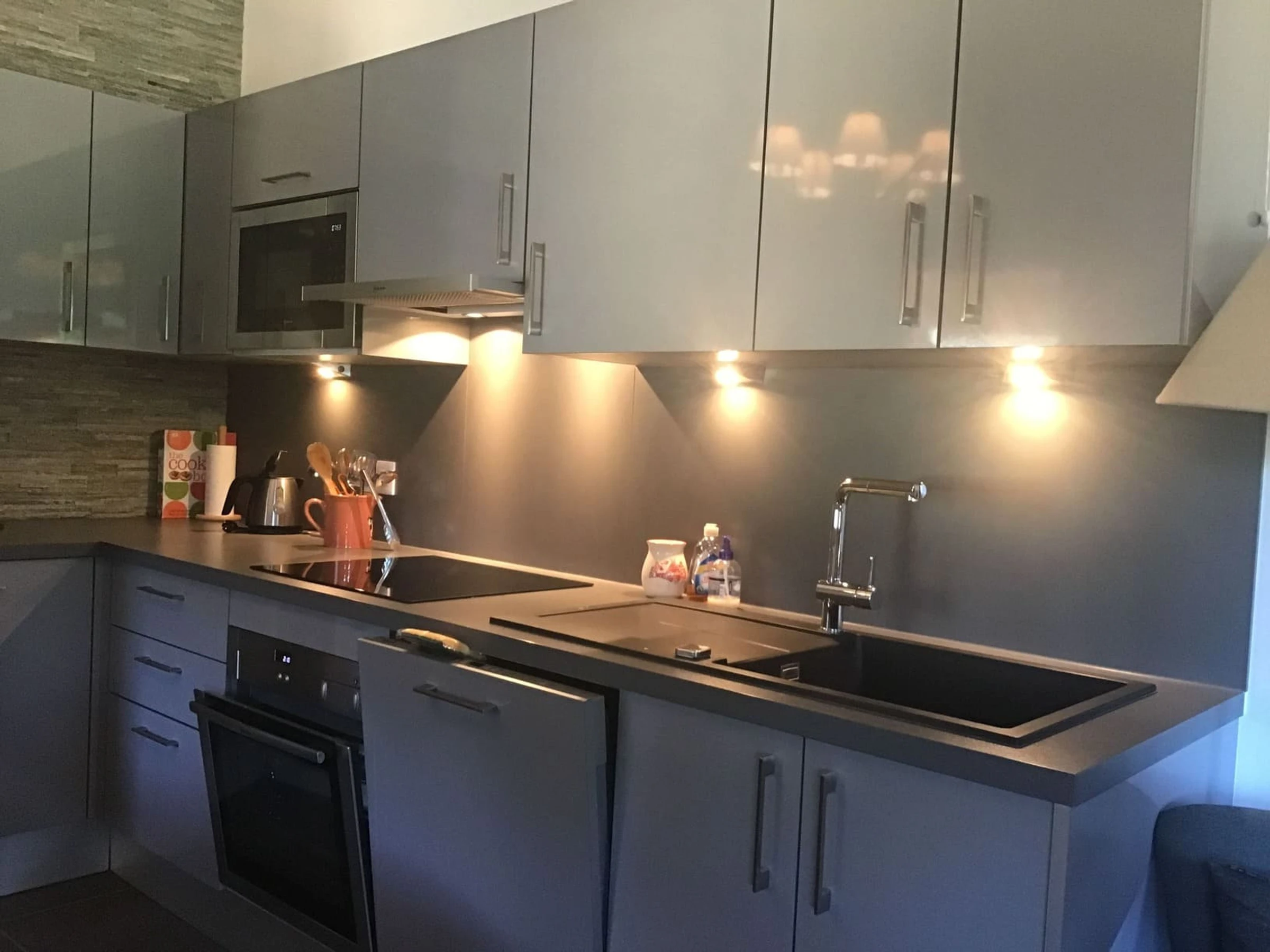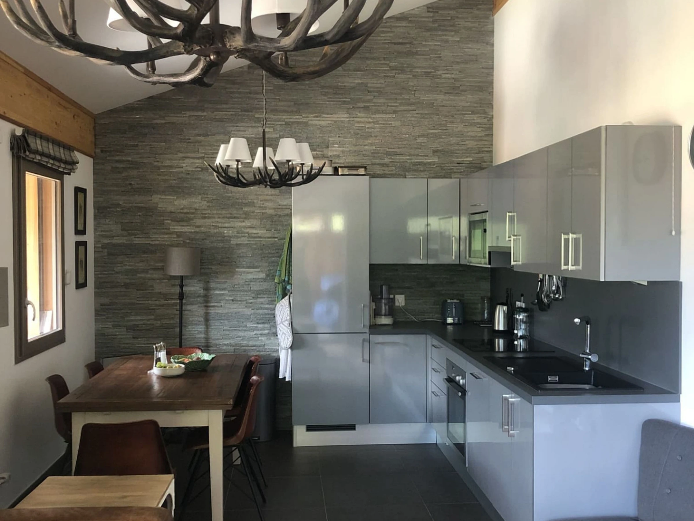 Ausgestattete Küche, Kühlschrank mit Gefrierfach, Backofen, Induktionskochfeld, Mikrowelle, Geschirrspüler, Fondue-Set, Steingrill, Wasserkocher, Toaster, Filterkaffeemaschine, Mixer